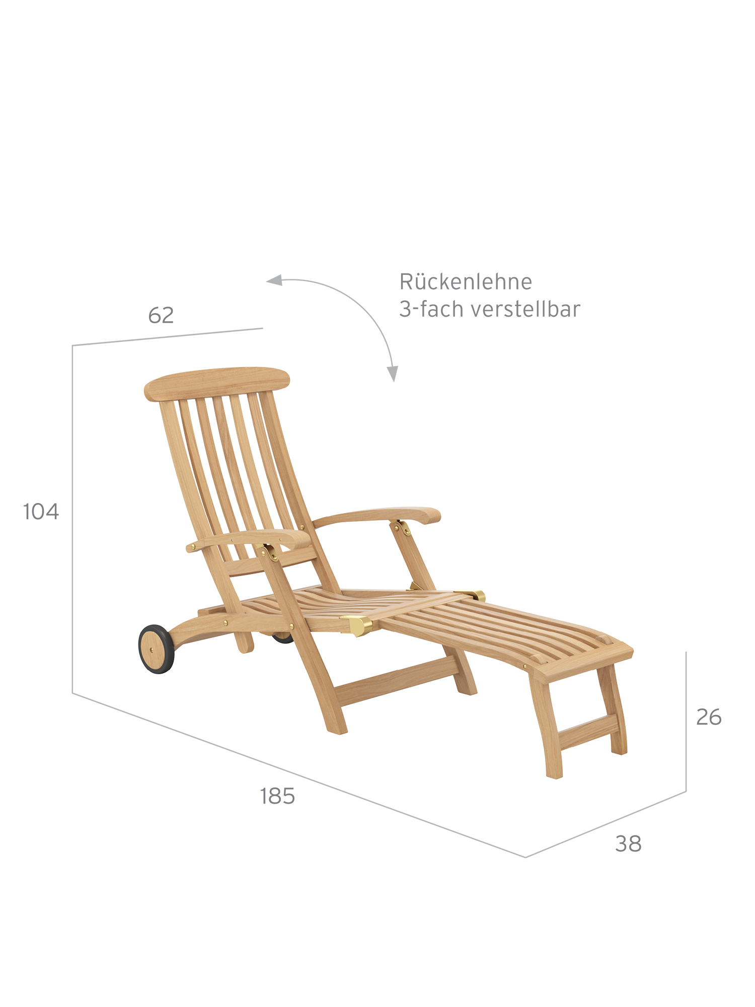 Mit seiner verlängerten Fußstütze empfiehlt sich der Deck Chair besonders für Menschen ab 1,80 m Körpergröße.