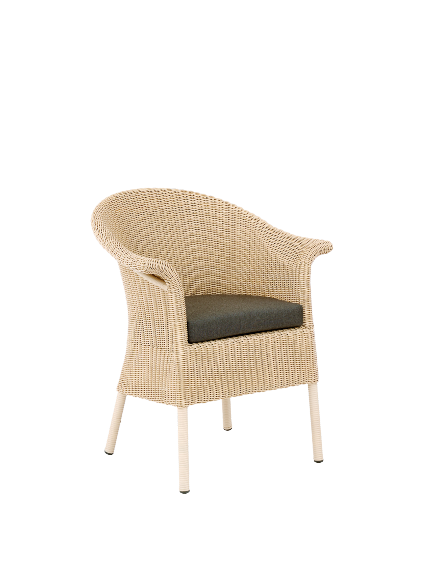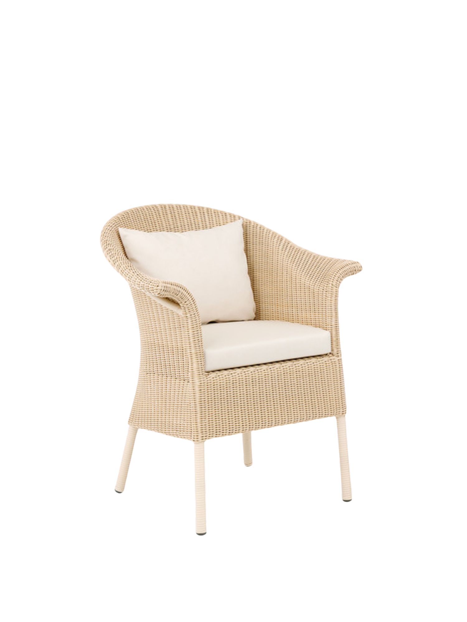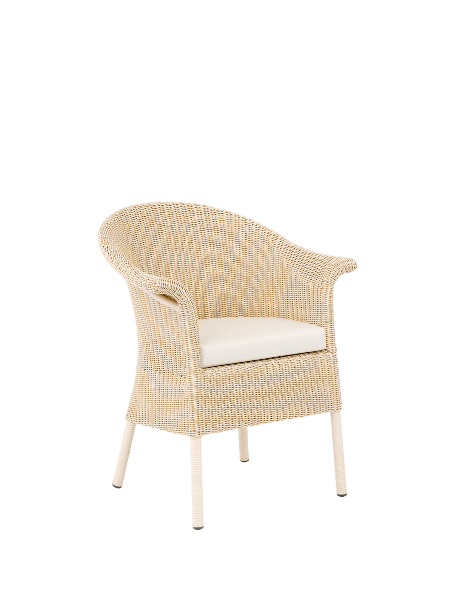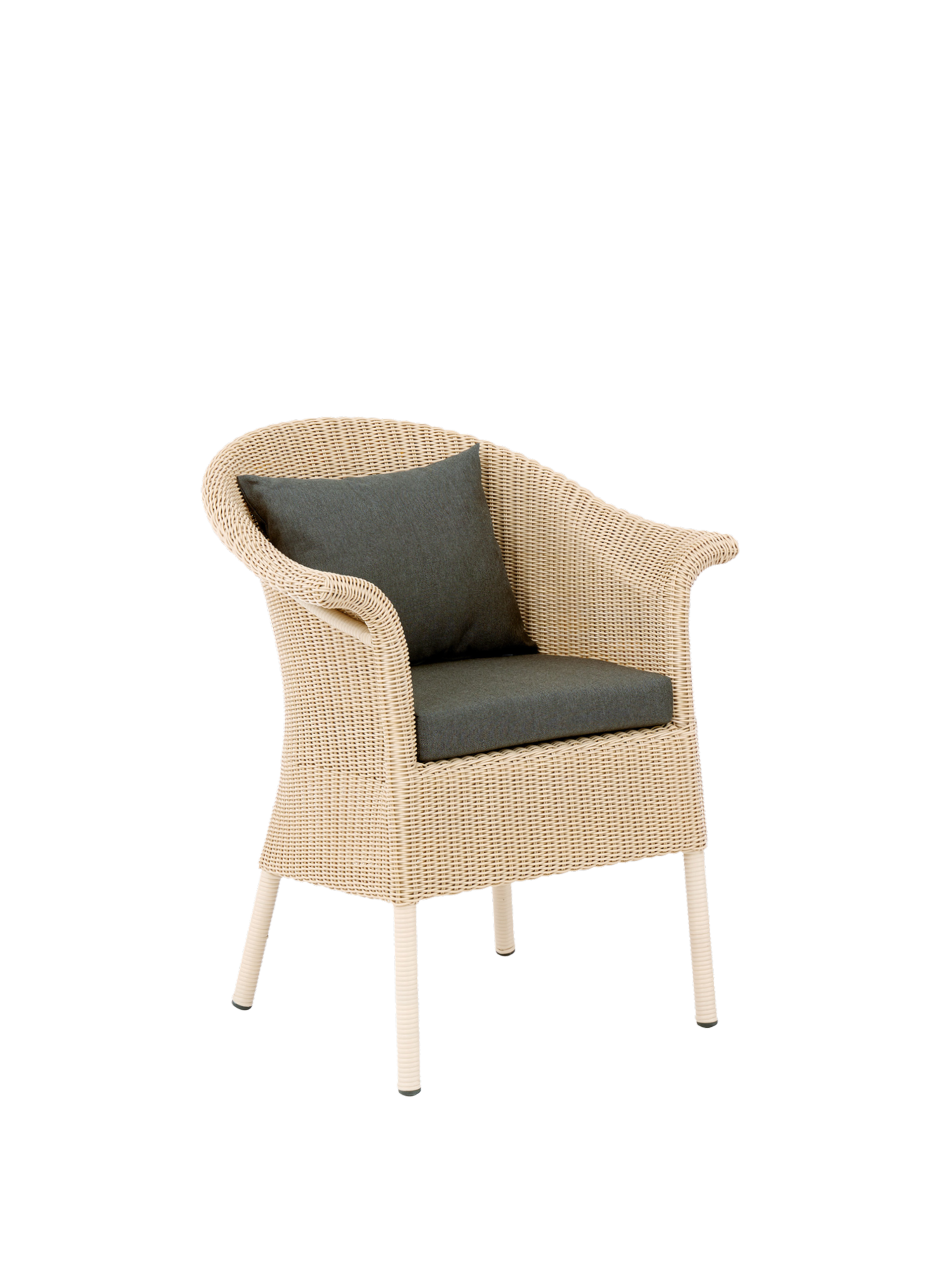 Der Armlehnstuhl aus einer hochwertigen, wetterfesten Kunststofffaser erinnert in seiner Form an die 20er Jahre, an Art déco und die Entstehungszeit seiner klassischen Vorbilder aus Loomgeflecht. Seine Sitzfläche ist besonders großzügig konzipiert, die geschwungene Rückenlehne lädt zum behaglichen Zurücklehnen ein.