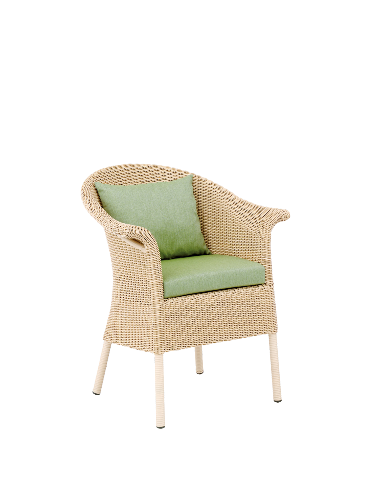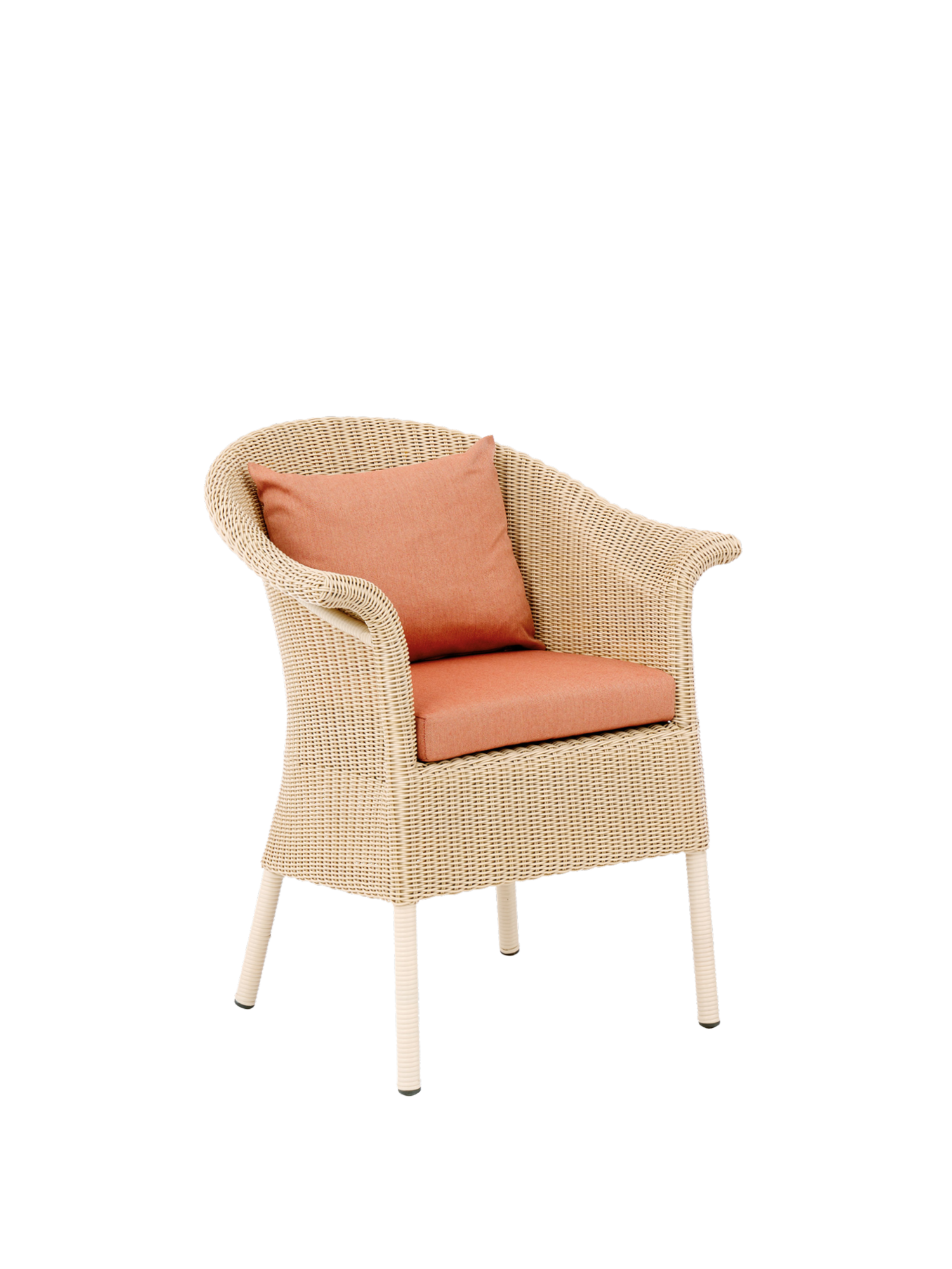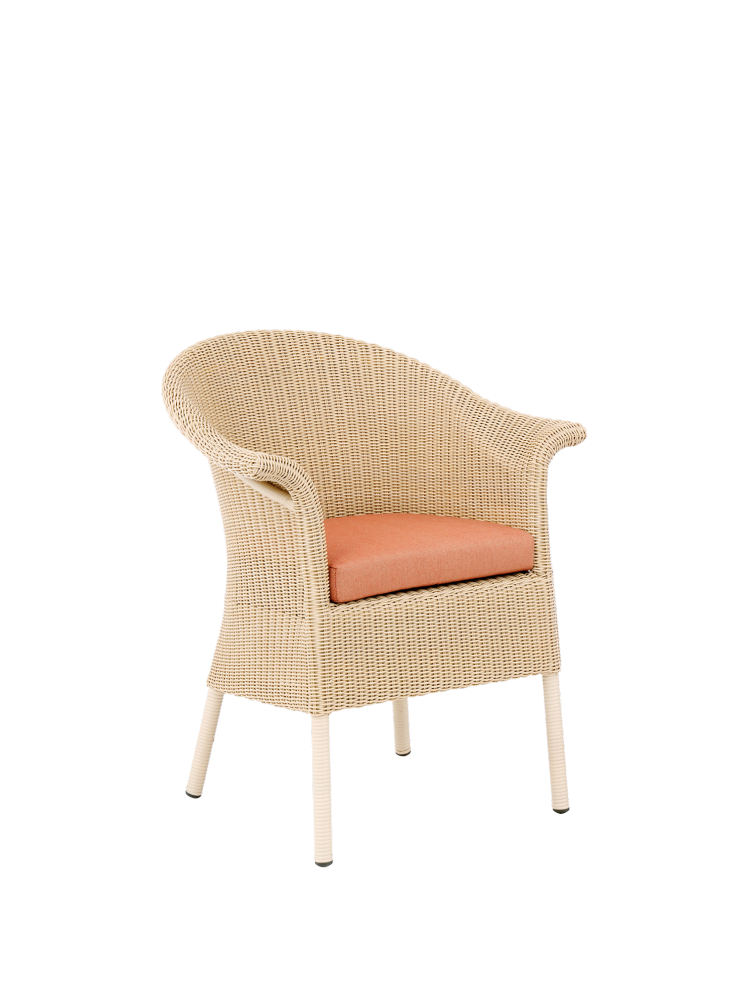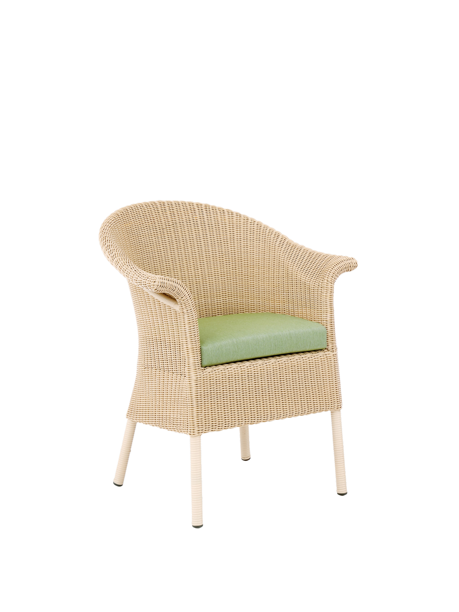 Der Armlehnstuhl aus einer hochwertigen, wetterfesten Kunststofffaser erinnert in seiner Form an die 20er Jahre, an Art déco und die Entstehungszeit seiner klassischen Vorbilder aus Loomgeflecht. Seine Sitzfläche ist besonders großzügig konzipiert, die geschwungene Rückenlehne lädt zum behaglichen Zurücklehnen ein.