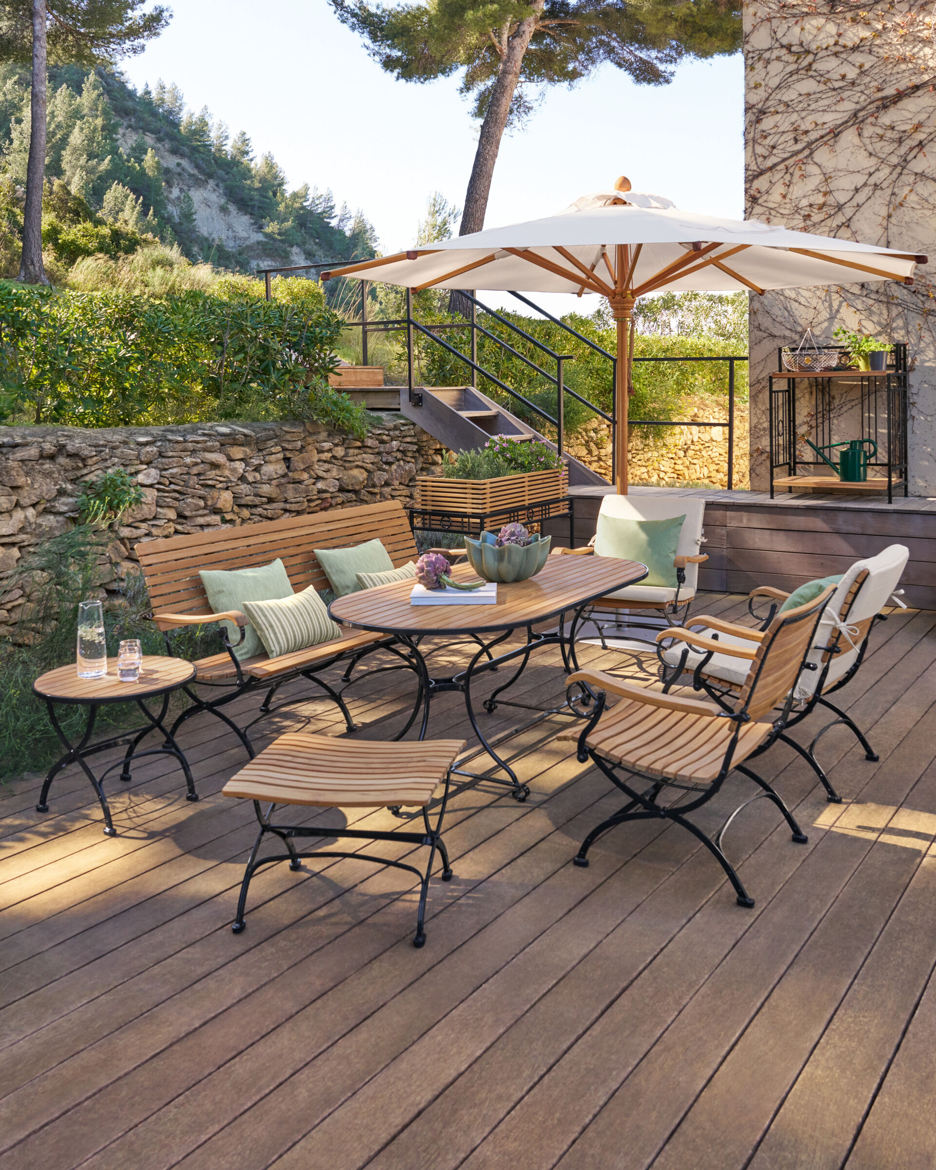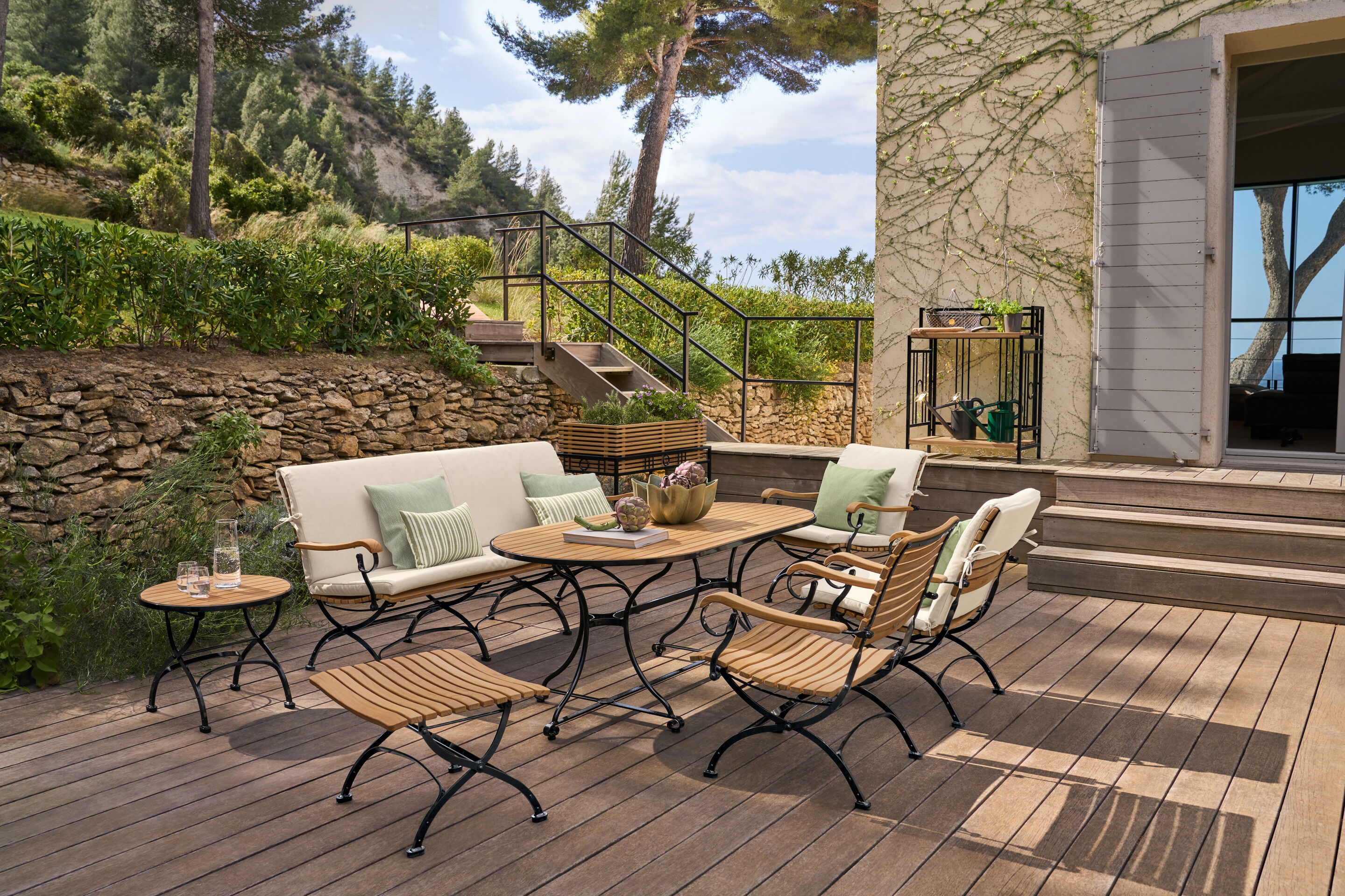 Teak ist das widerstandsfähigste, beste Holz für Gartenmöbel, die im Freien stehen. Es trotzt von Natur aus Sonne, Regen, Frost und Schnee. Auch nach Jahren an der Luft bleibt das Holz stabil, hält bis auf minimale, von der Luftfeuchtigkeit abhängige Veränderungen das Maß und verändert nur die Farbe: Mit der Zeit entwickelt sich eine edle, silbergraue Patina. In seiner natürlichen Schönheit ist es ohne chemische Behandlung von jahrzehntelanger Wertbeständigkeit. Was man aus Teak besitzt, kann man vererben.