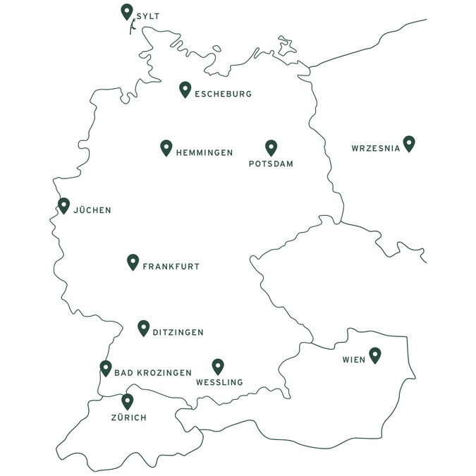 Sie sind auf Reisen oder nutzen das Wochenende für einen Kurztrip? Die nebenstehende Übersichtskarte zeigt die regionalen Standorte unserer Showrooms in Deutschland, Österreich, der Schweiz und in Polen.