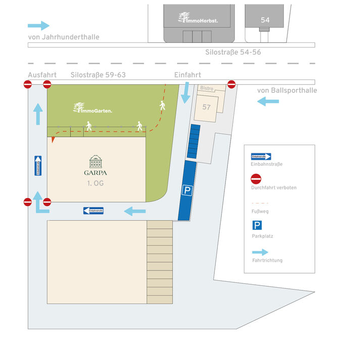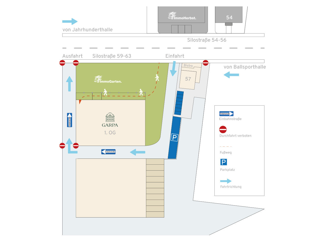 1. Haupt-Parkmöglichkeiten auf dem Gelände ImmoGarten GmbH und Garpa (Silostraße 59-63).