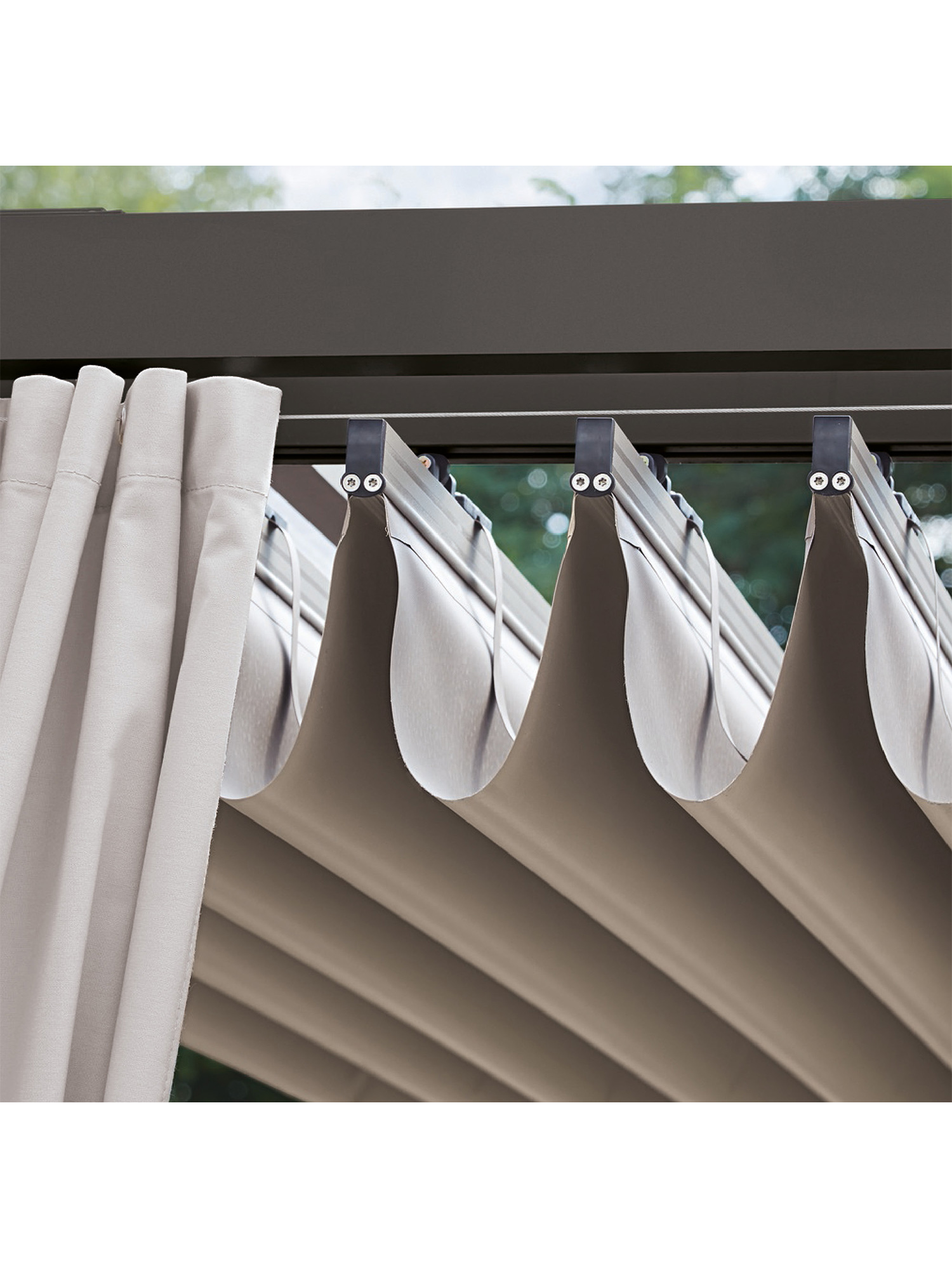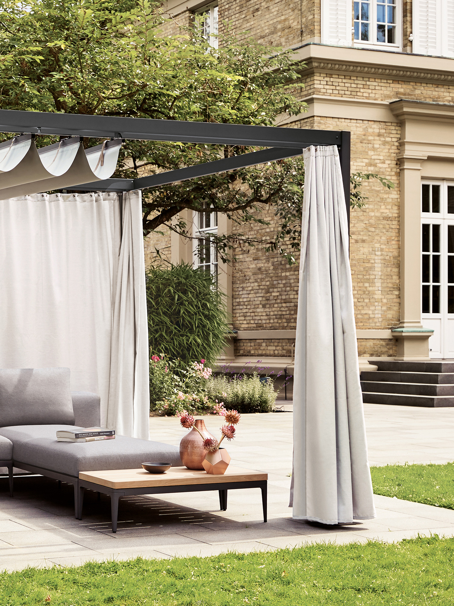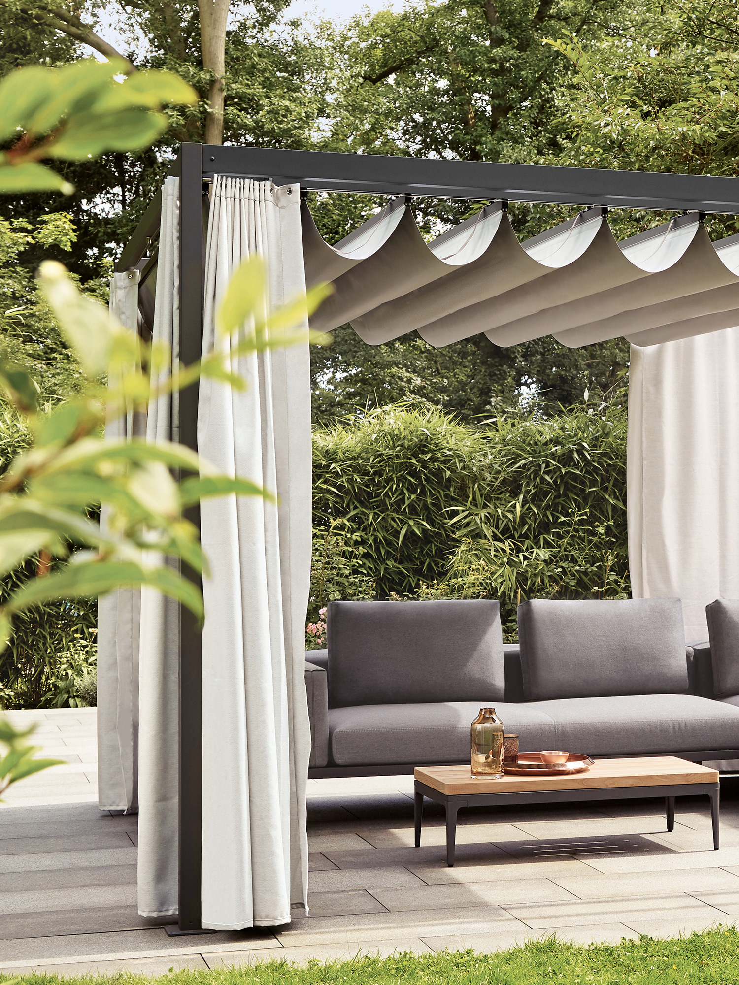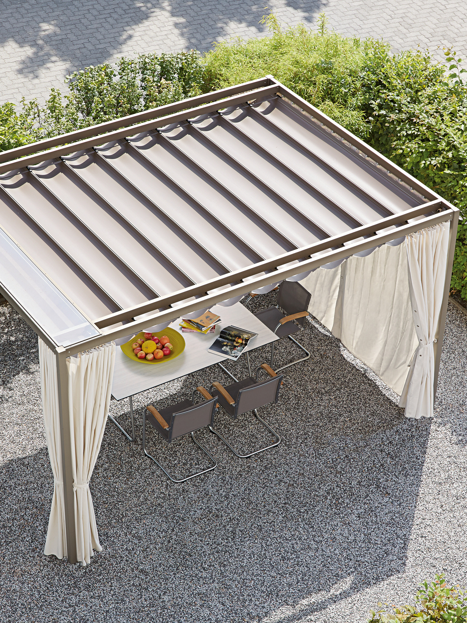 Die Seitenwände aus festem Acrylstoff im Farbton Crystal lassen sich nach Bedarf schliessen, das wasserdichte Faltdach ist spielend leicht zuzuziehen. Komplett zur Seite geschoben, verschwindet es dezent unter einem transparenten Schutzdach.