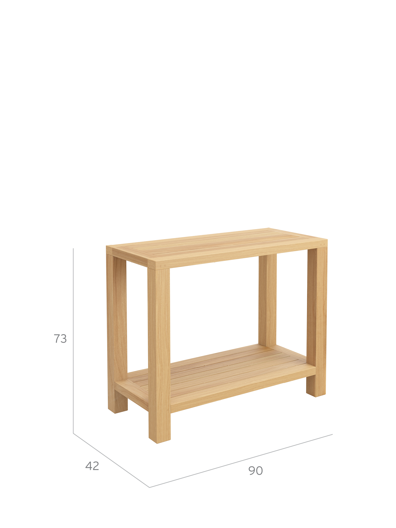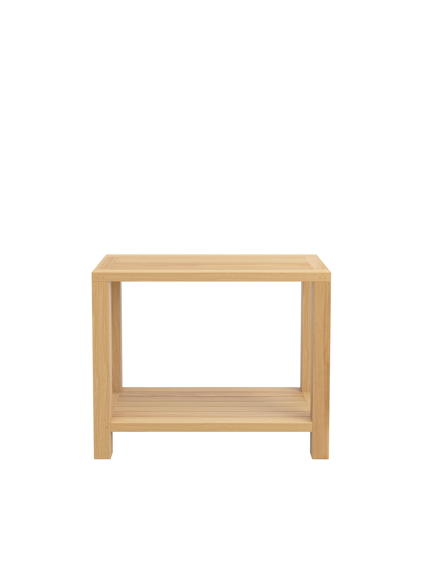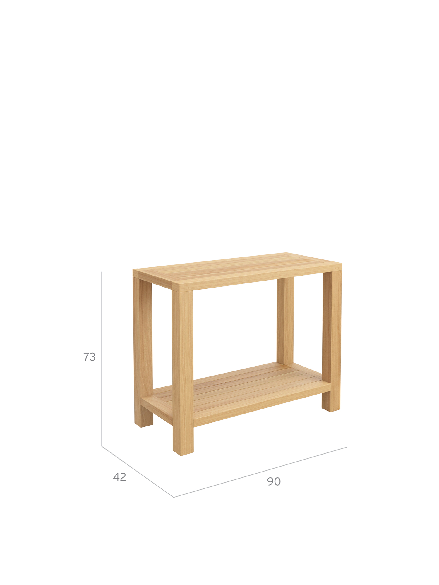Die moderne Optik der großzügigen Square Tische passt gut zu leichteren Teakserien. Der schlichte Konsoltisch der Serie bietet auf zwei Ebenen Platz für Geschirr oder Accessoires oder verlängert, schnell dazugestellt, elegant die Tafel.