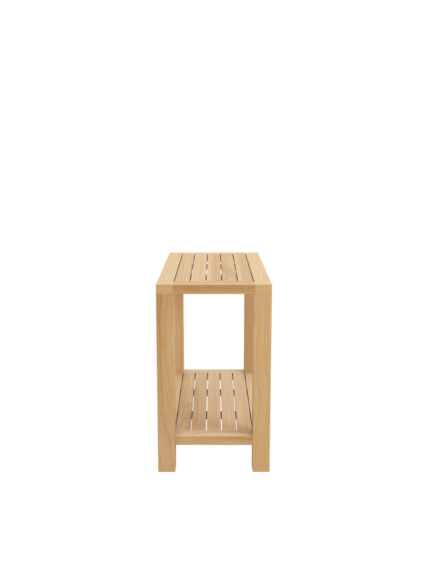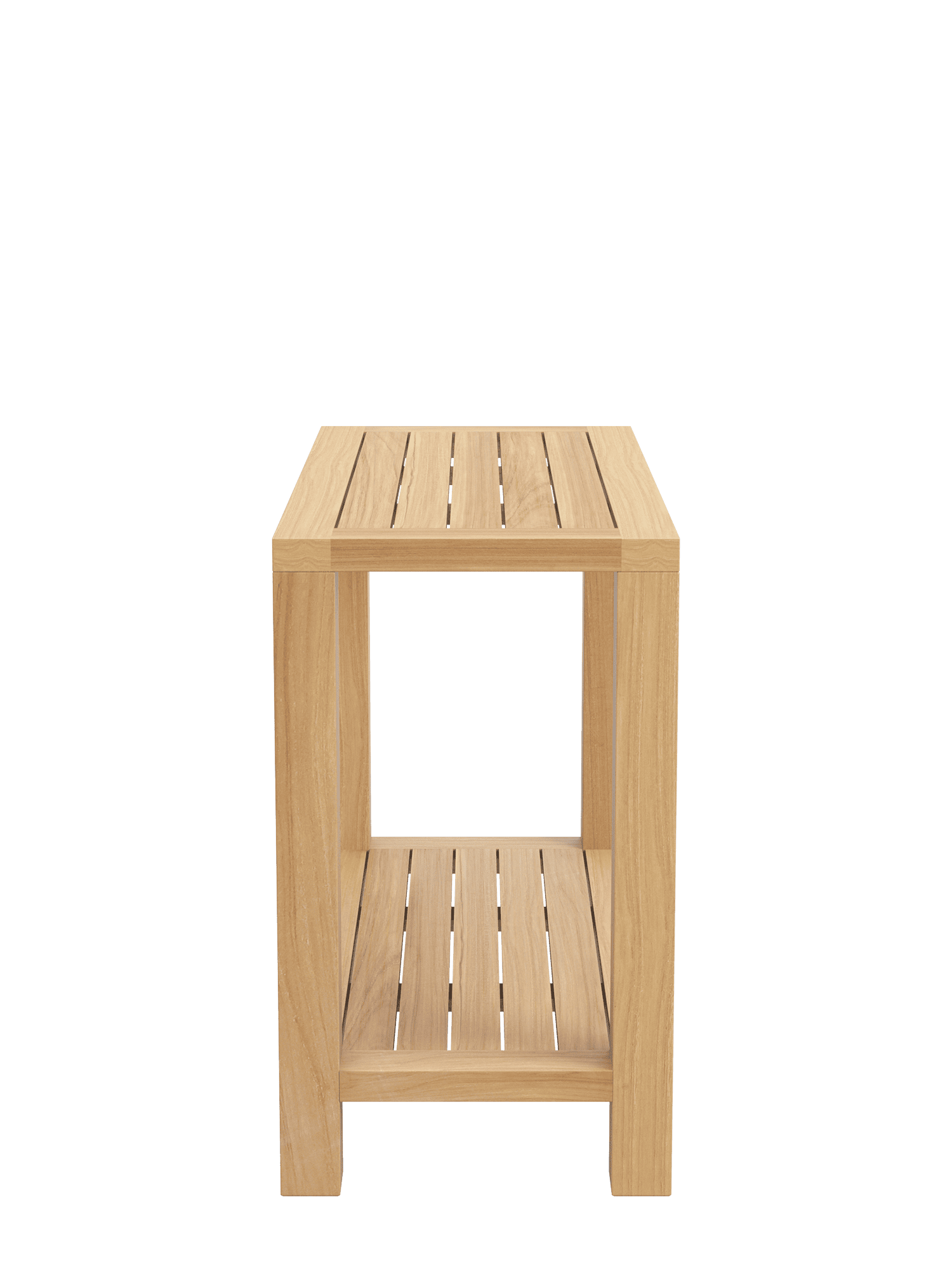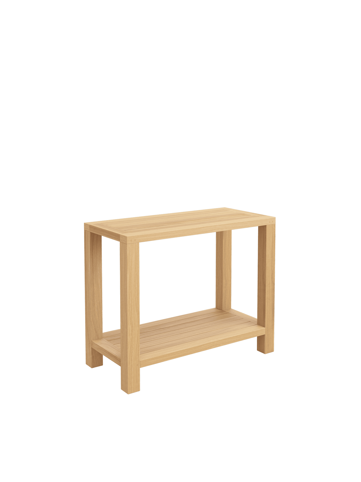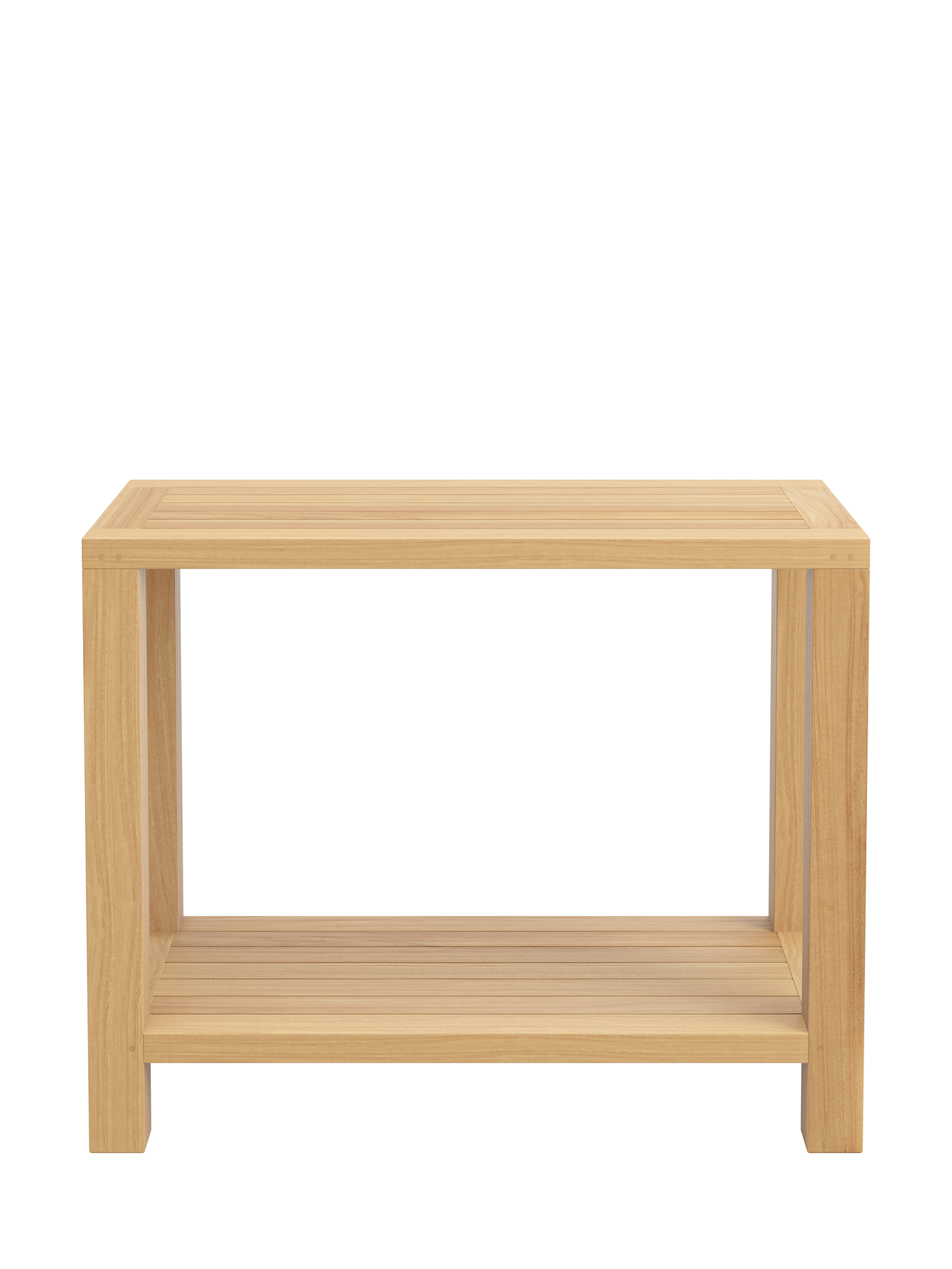 Die moderne Optik der großzügigen Square Tische passt gut zu leichteren Teakserien. Der schlichte Konsoltisch der Serie bietet auf zwei Ebenen Platz für Geschirr oder Accessoires oder verlängert, schnell dazugestellt, elegant die Tafel.