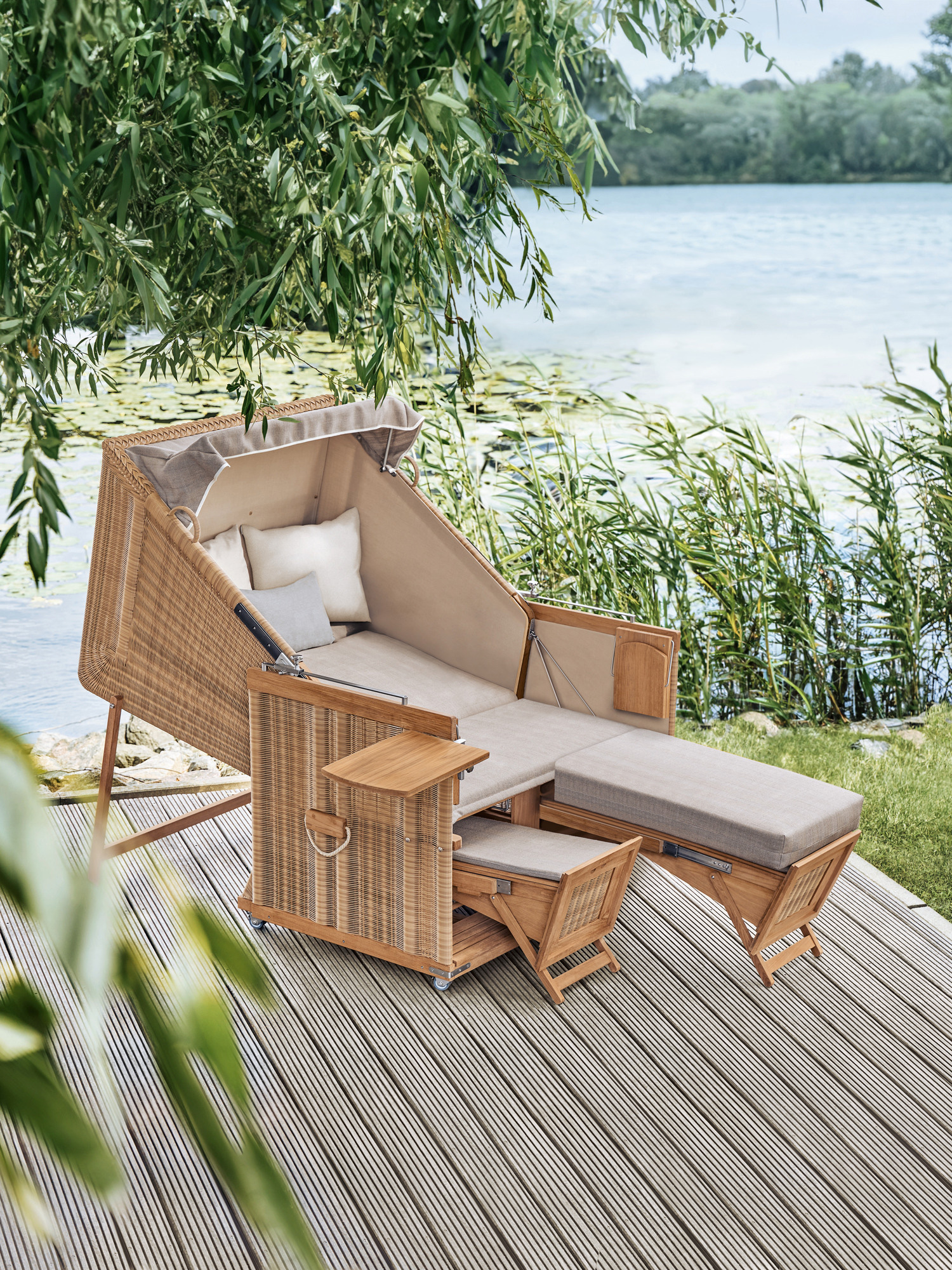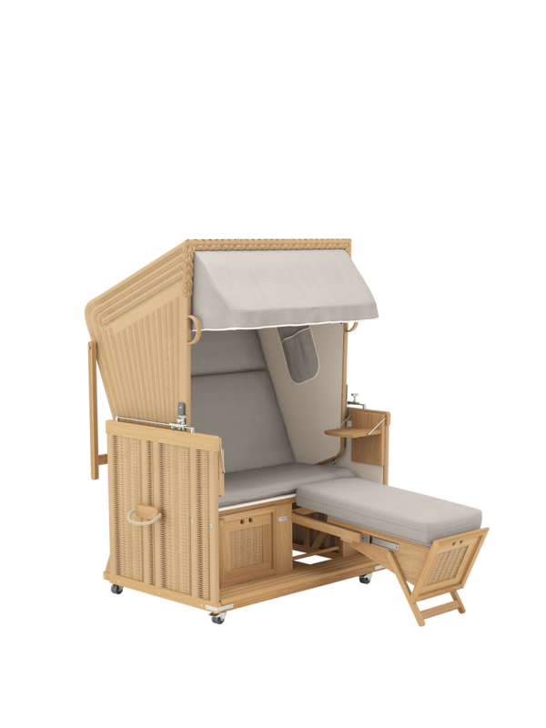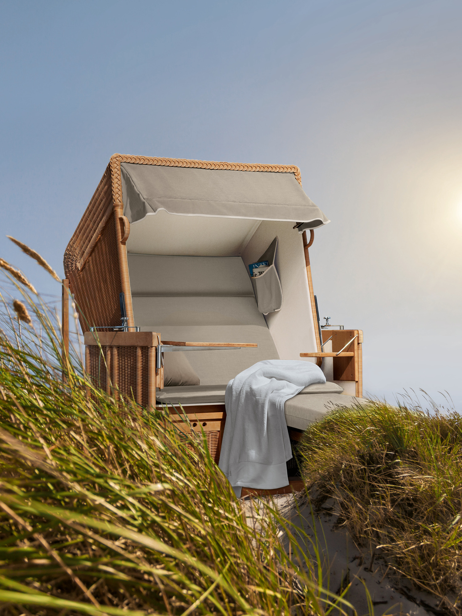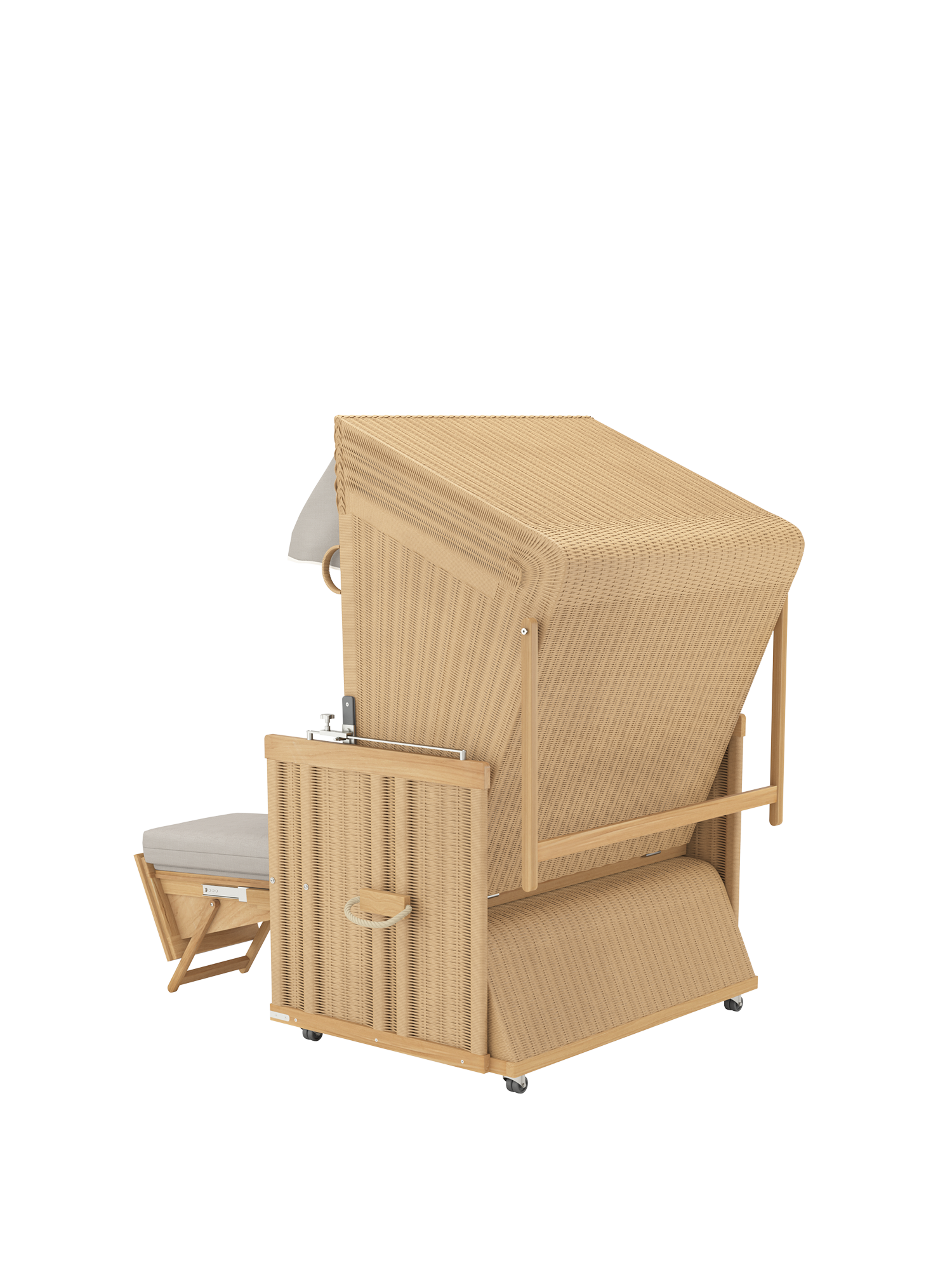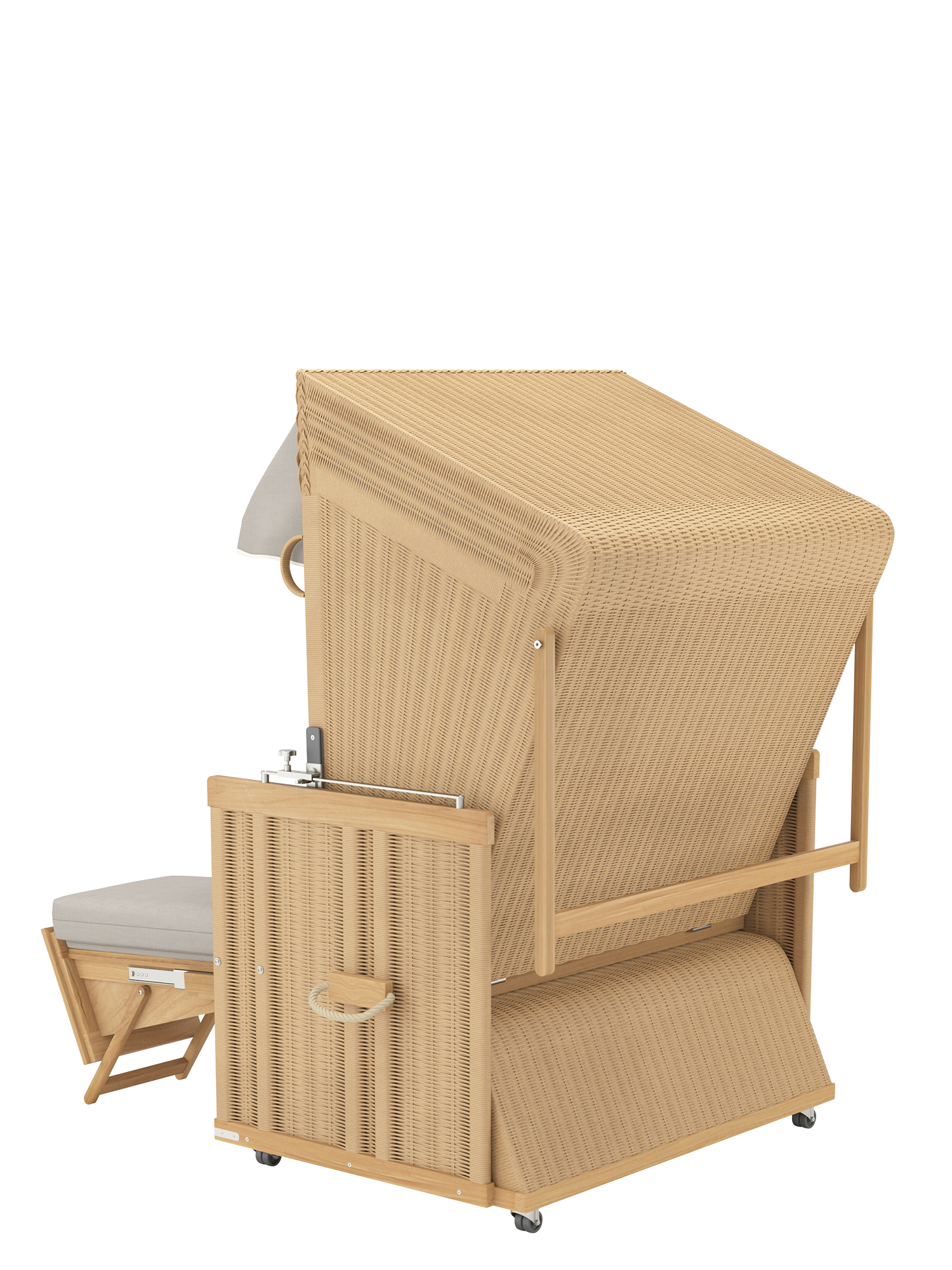 Der Strandkorb besteht aus einem massiven Teakkorpus, der mit einem wetterfesten Kunststoffgeflecht und Edelstahlbeschlägen kombiniert wird. Der elegante Stoff ist unempfindlich und bis auf die Innenauskleidung abnehm- und waschbar.