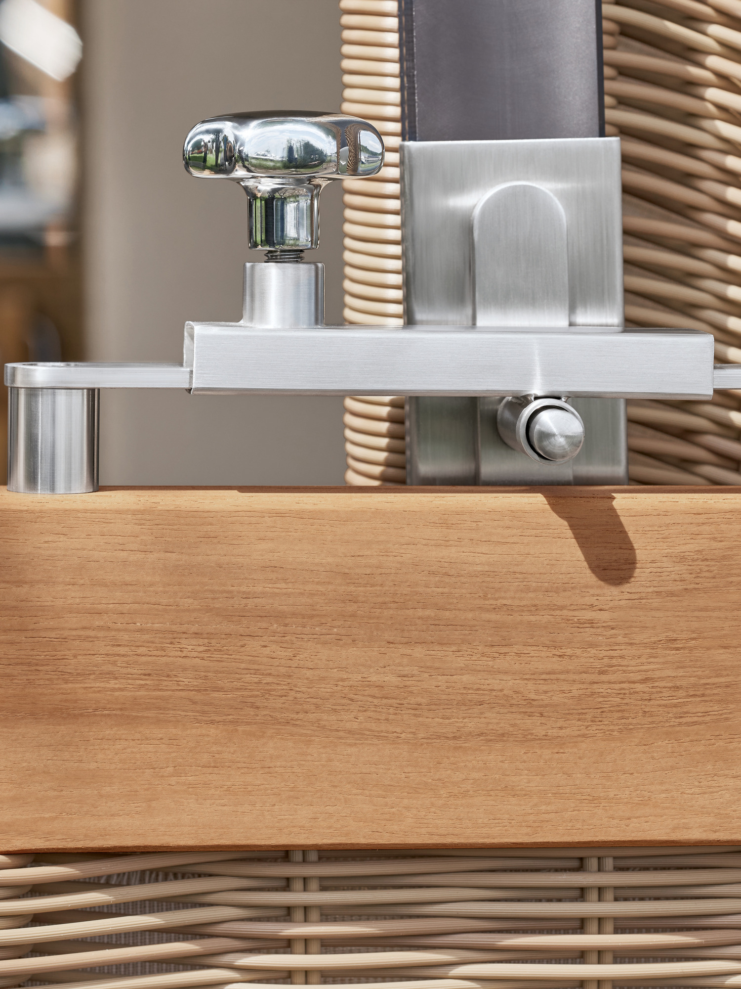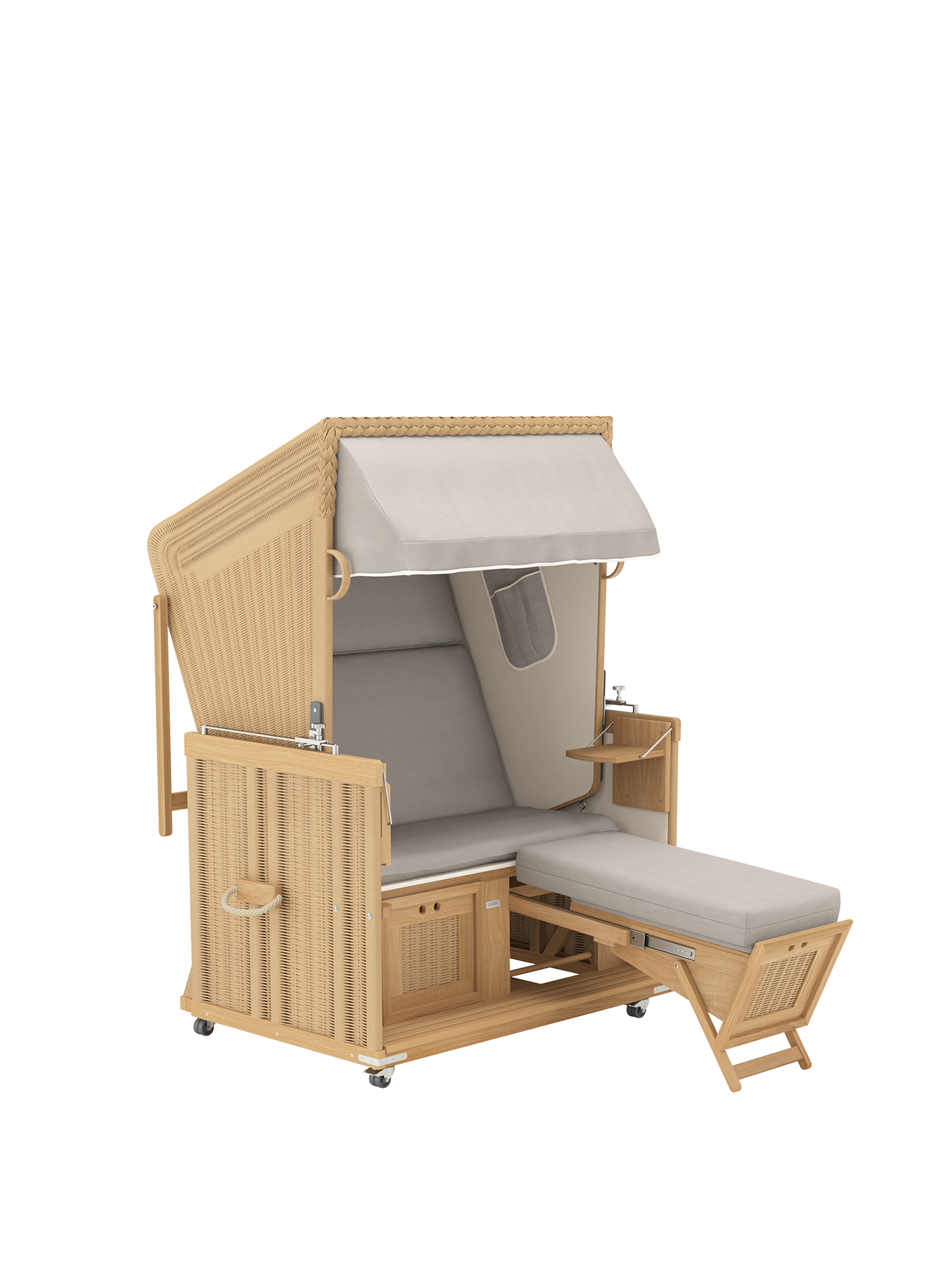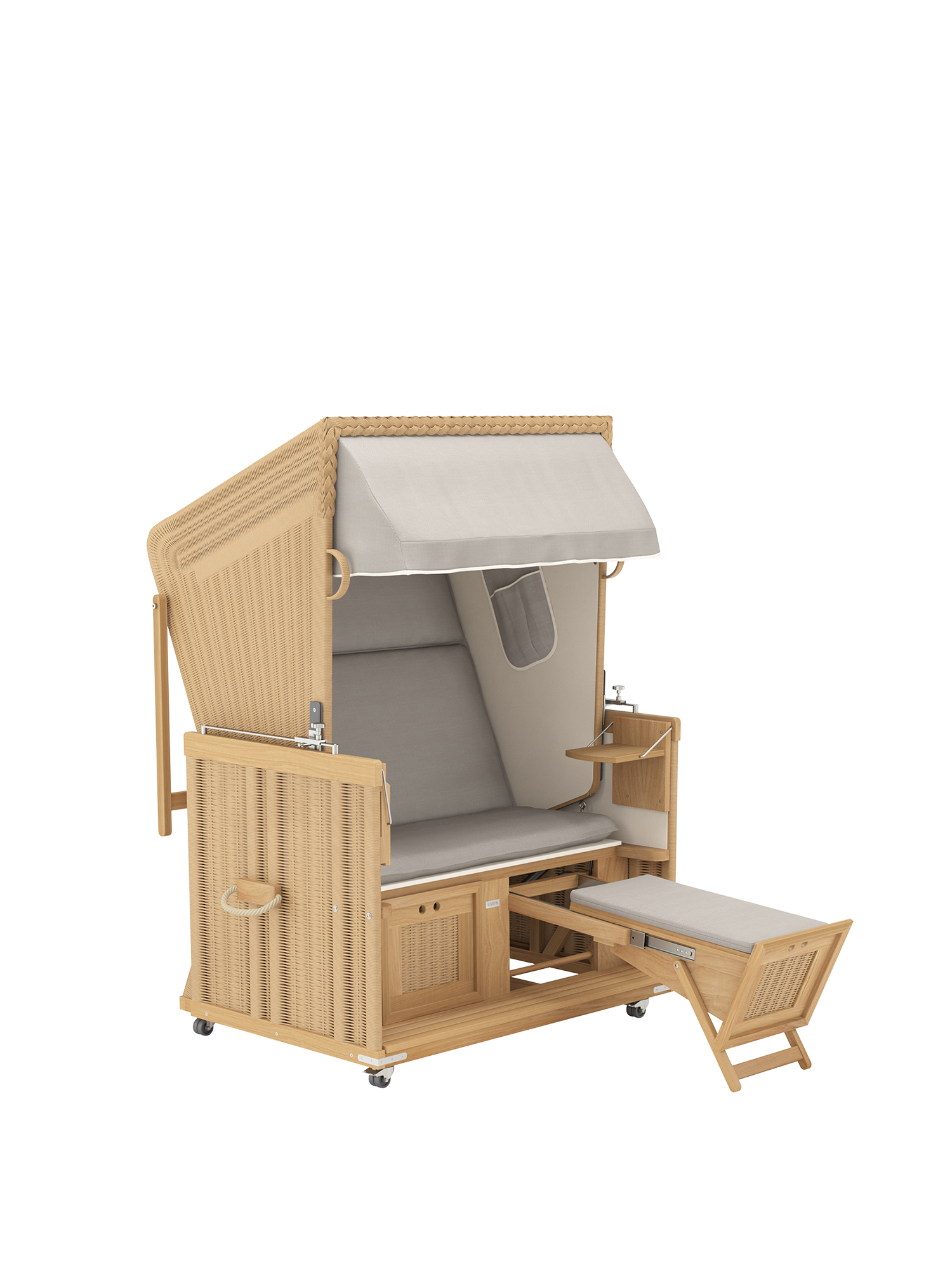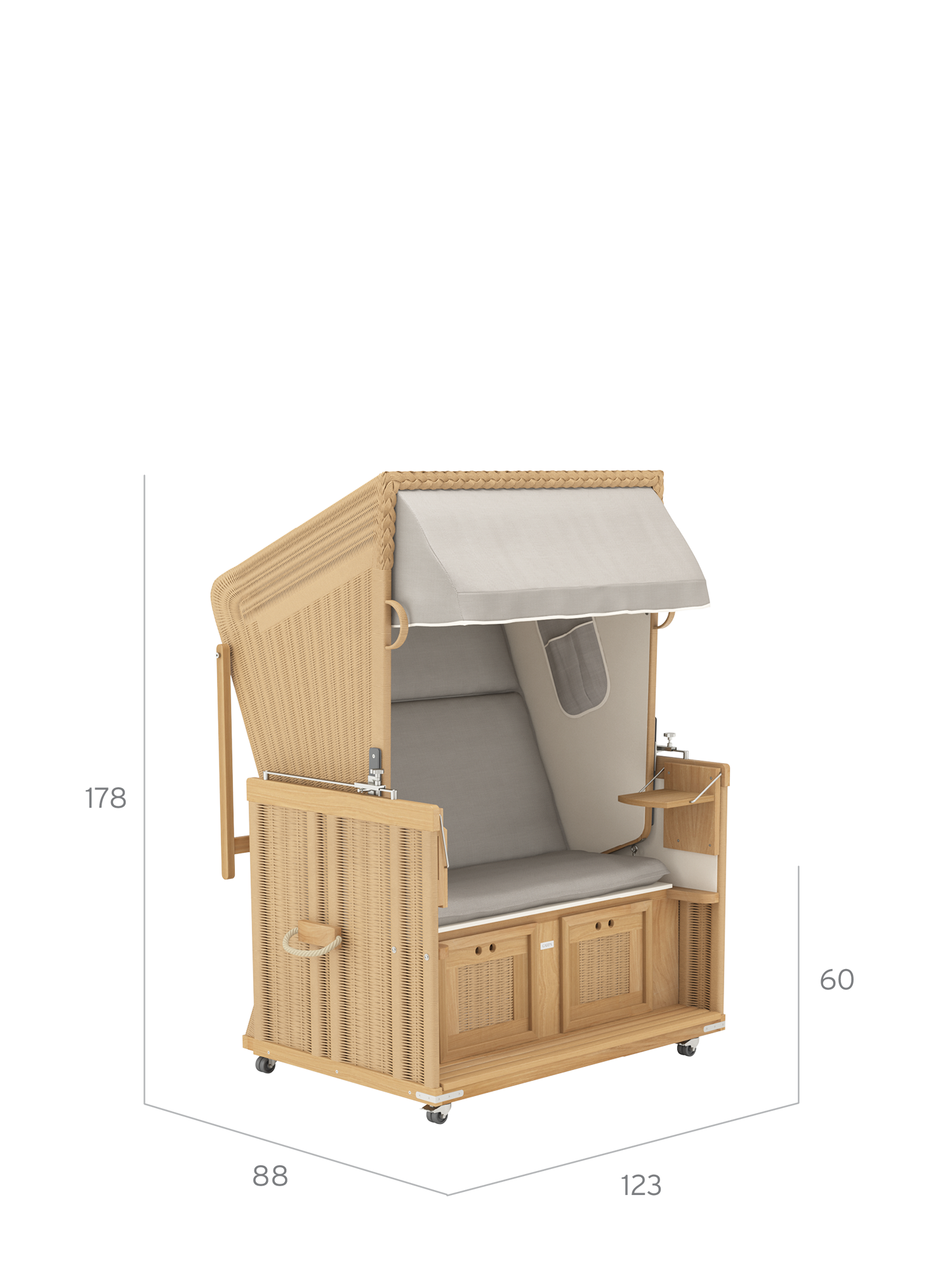 Der Strandkorb besteht aus einem massiven Teakkorpus, der mit einem wetterfesten Kunststoffgeflecht und Edelstahlbeschlägen kombiniert wird. Der elegante Stoff ist unempfindlich und bis auf die Innenauskleidung abnehm- und waschbar.