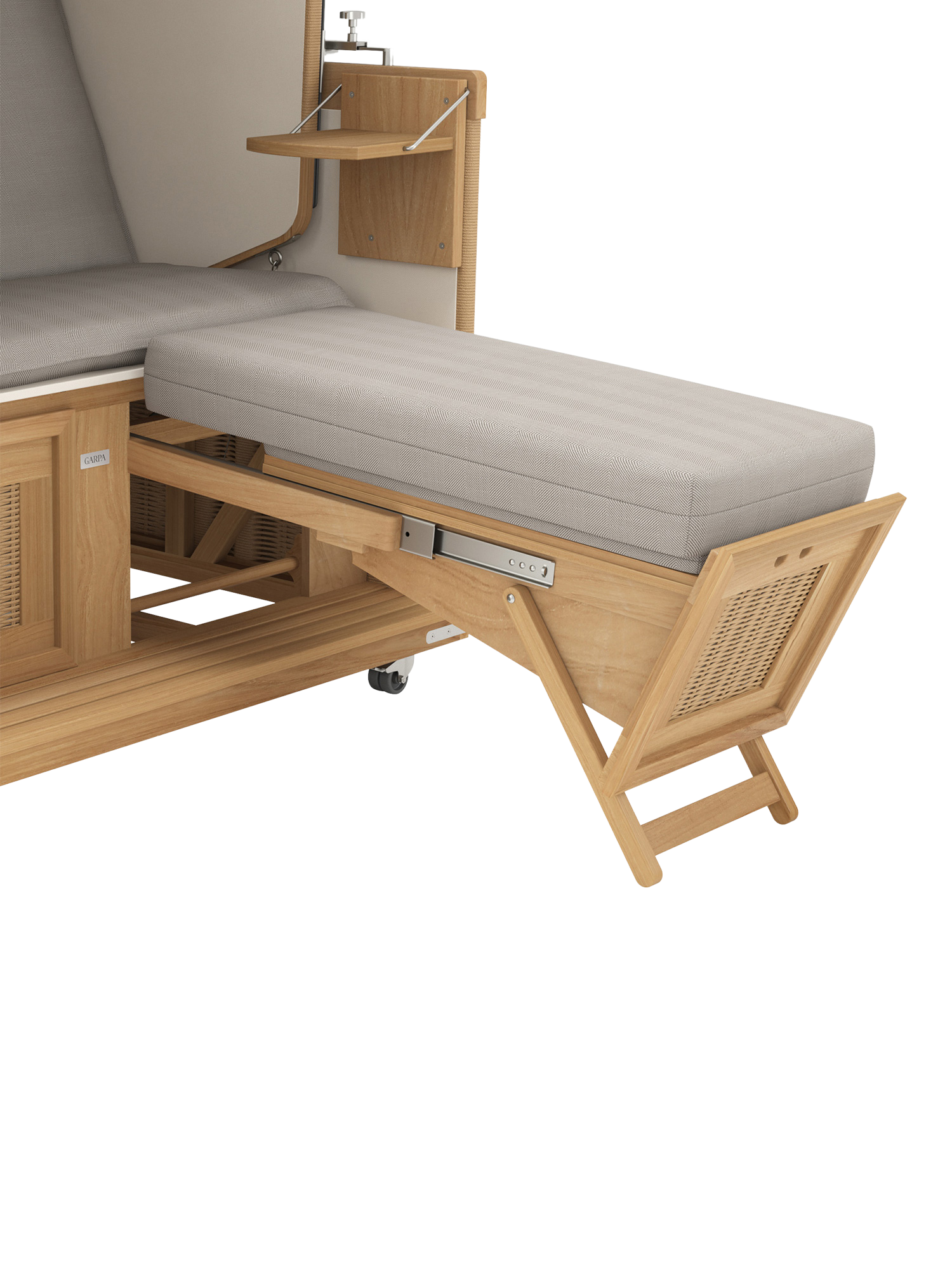 Die Fußkästen gleiten an einem Teleskop-Auszug aus dem Korpus und sind so lang, dass auch große Menschen sich bequem ausstrecken können. Sie bieten unsichtbaren Stauraum und können auf Wunsch mit dicken Fußkissen ausgestattet werden.