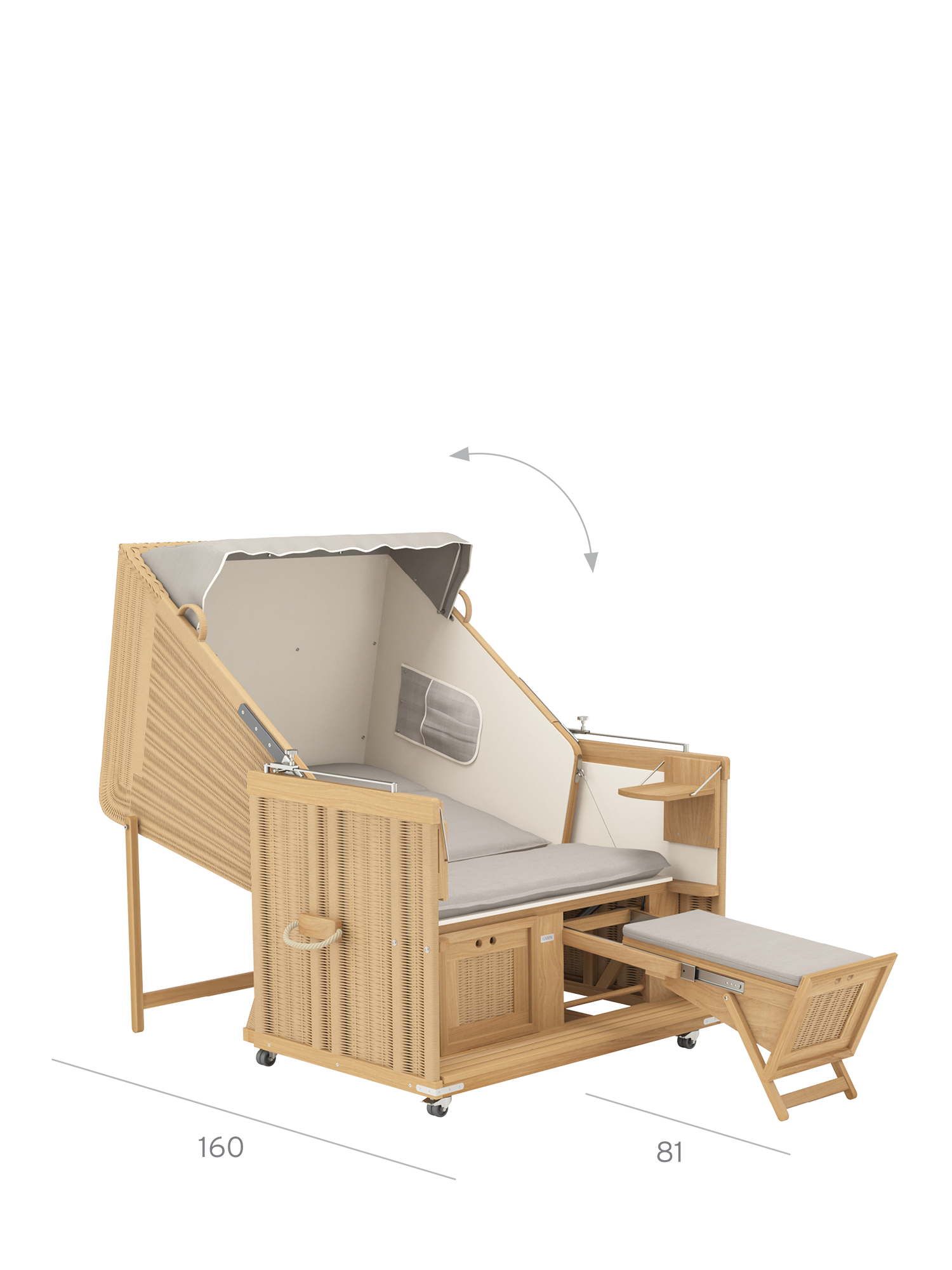 Der geräumige und gepolsterte Sitz des Strandkorbs lässt sich stufenlos zur komplett flachen Doppelliege verstellen. Dank einer Rückholfeder kann der Korb an zwei Griffen leicht wieder aufgerichtet werden.