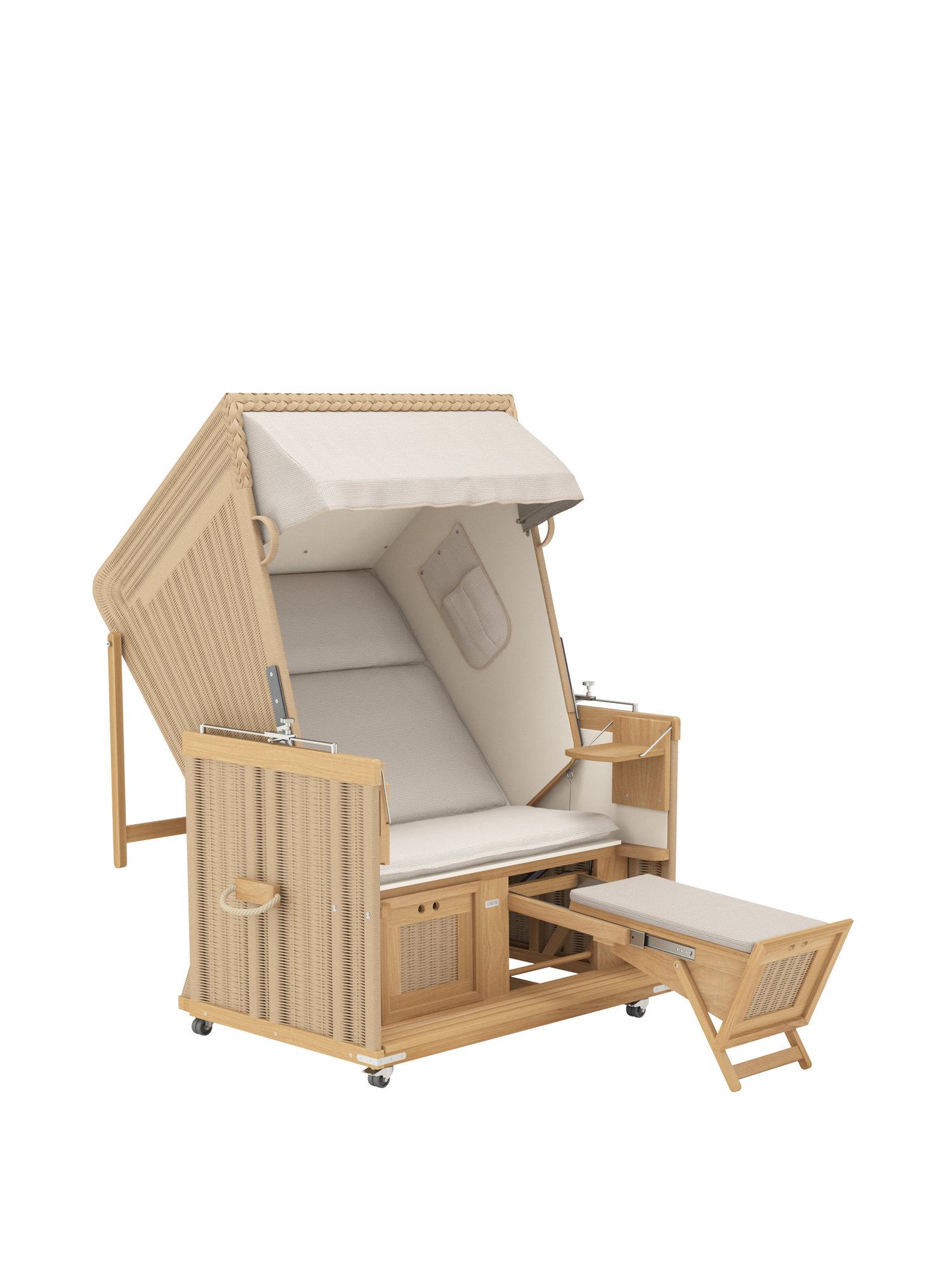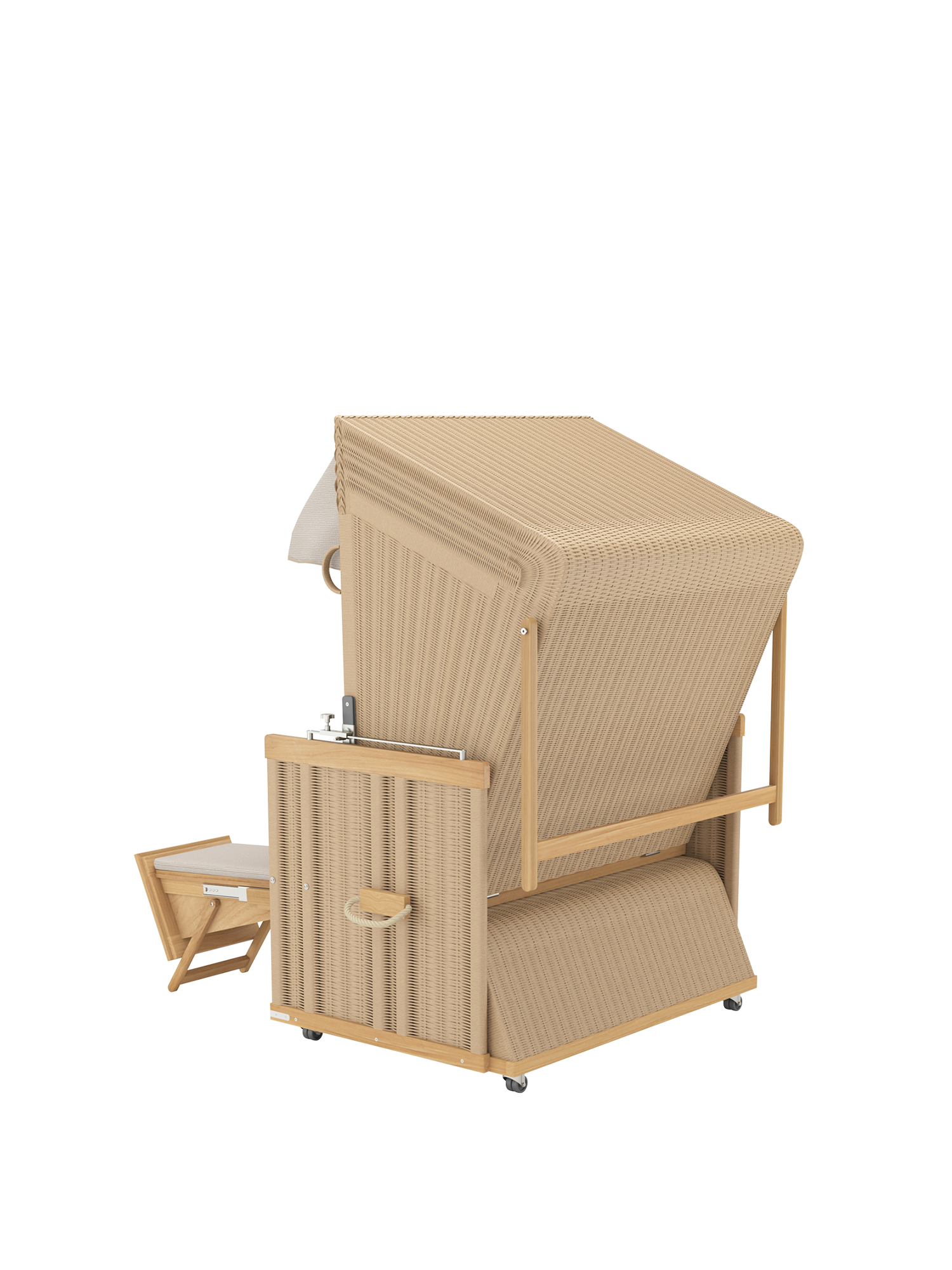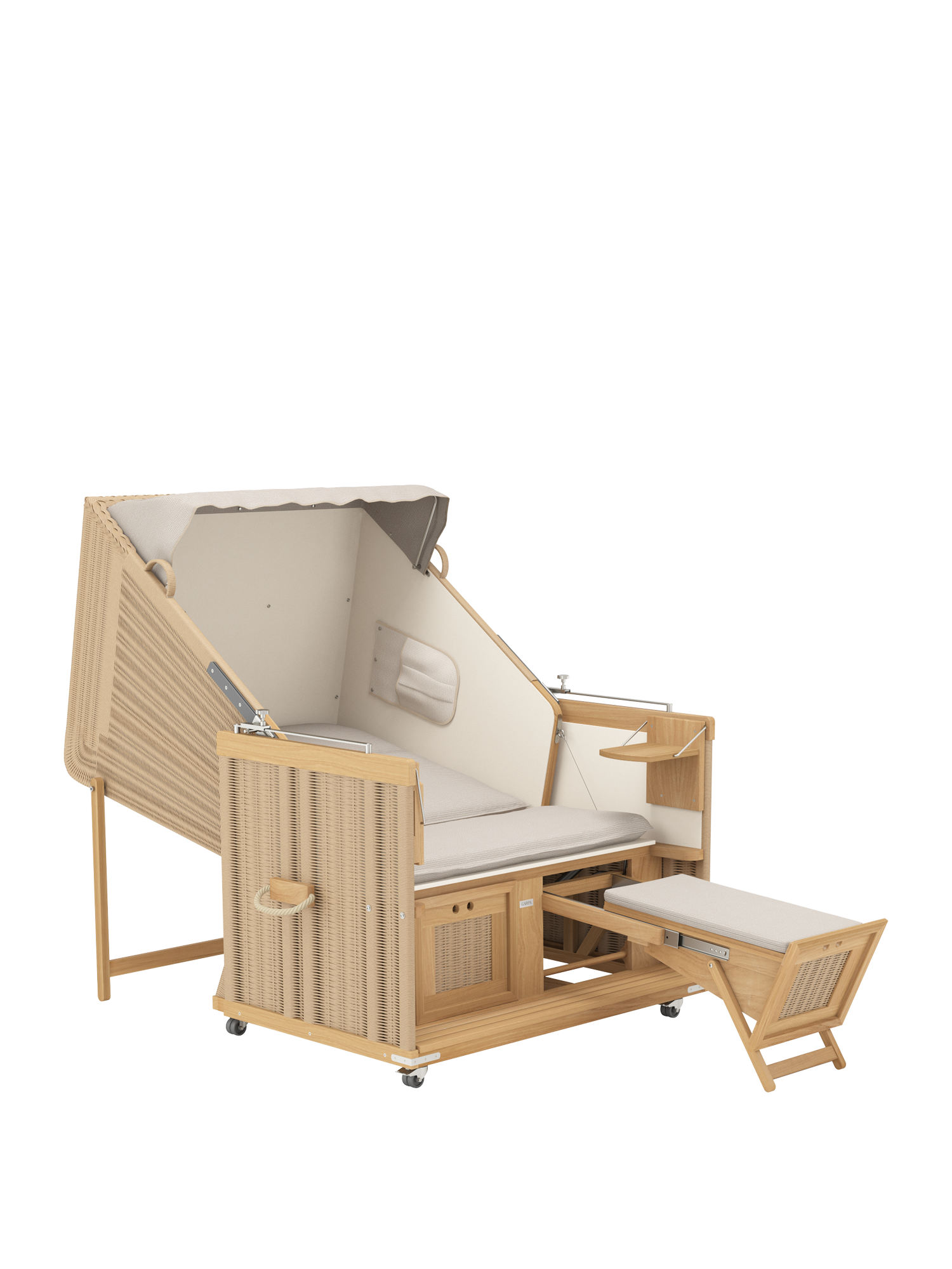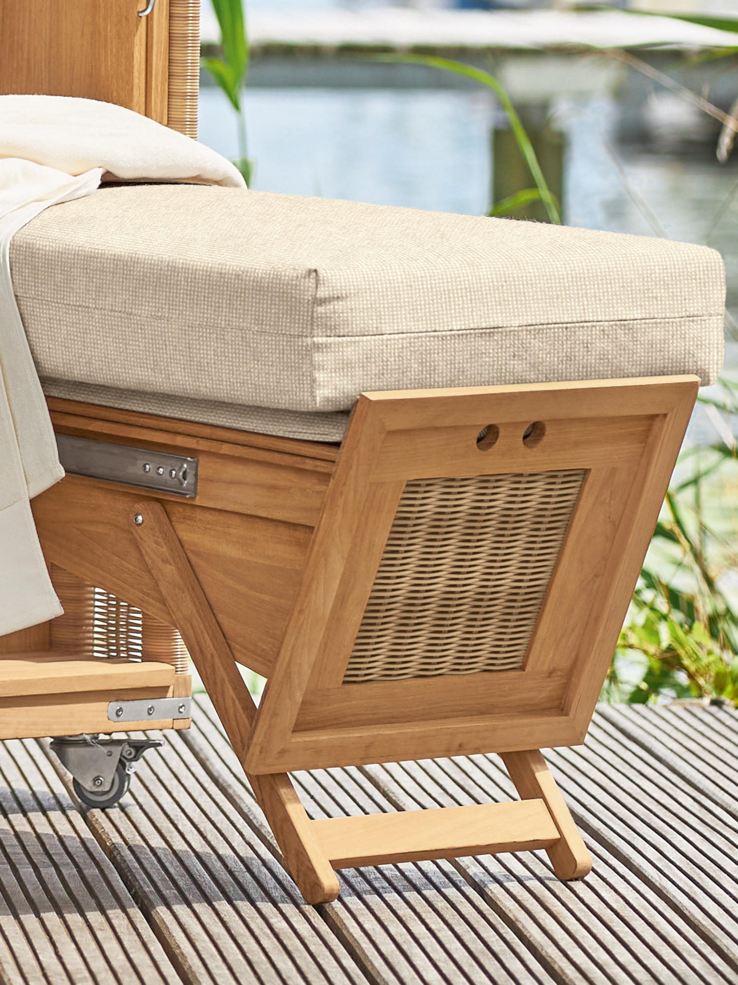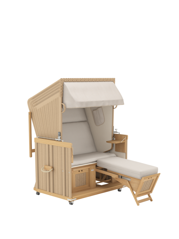 Der geräumige und gepolsterte Sitz des Strandkorbs lässt sich stufenlos zur komplett flachen Doppelliege verstellen. Dank einer Rückholfeder kann der Korb an zwei Griffen leicht wieder aufgerichtet werden. Die Fußkästen gleiten an einem Teleskop-Auszug aus dem Korpus und erlauben es auch großen Menschen, sich bequem auszustrecken. Sie bieten unsichtbaren Stauraum und können mit separat erhältlichen hohen Fußkissen ausgestattet werden.