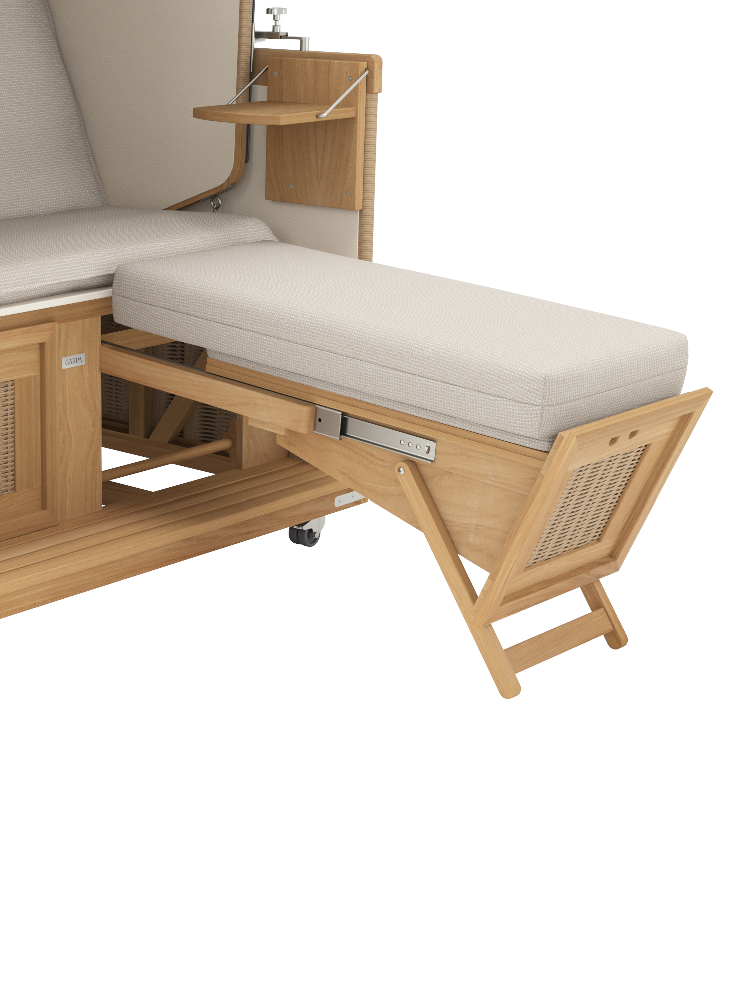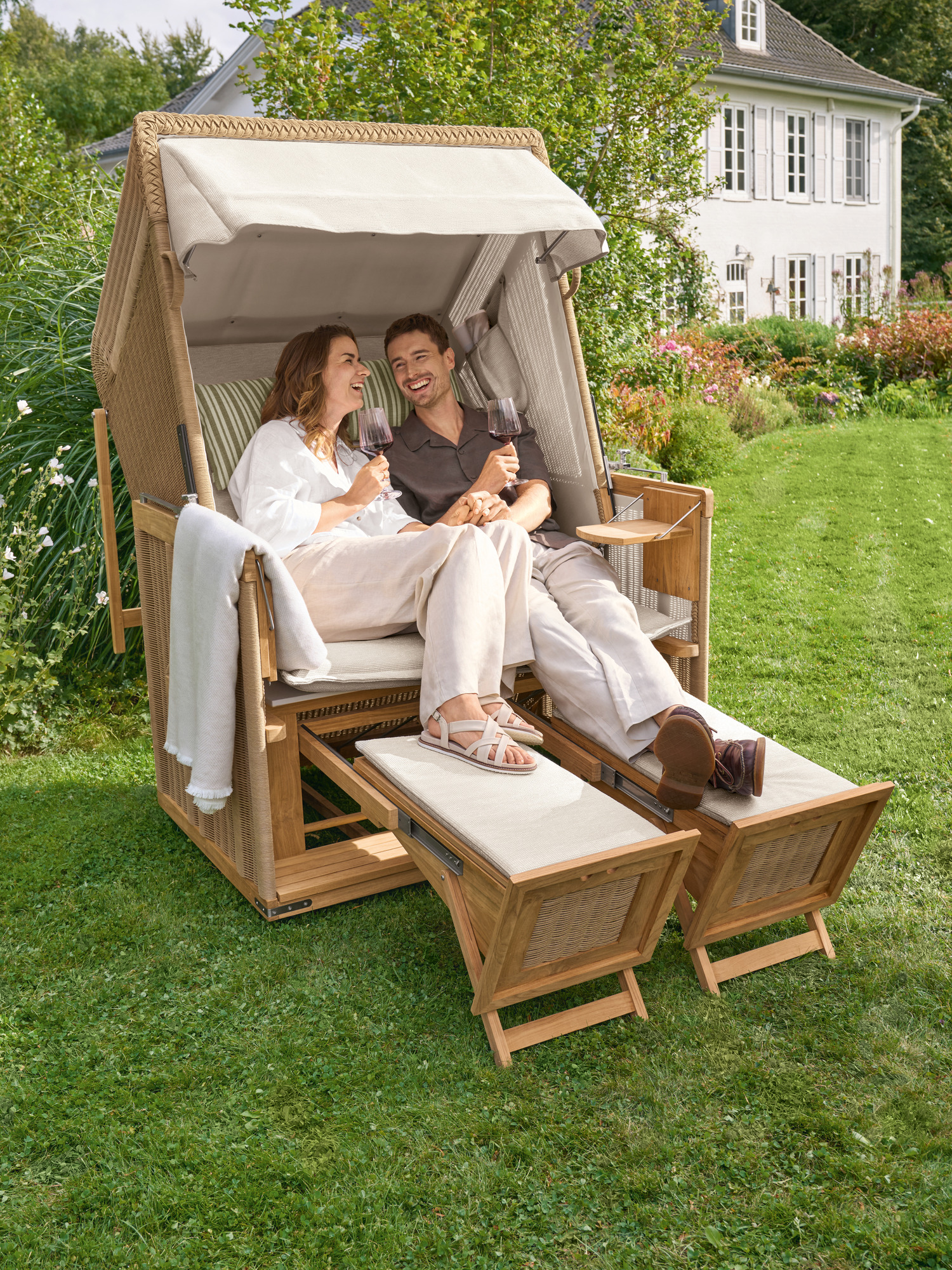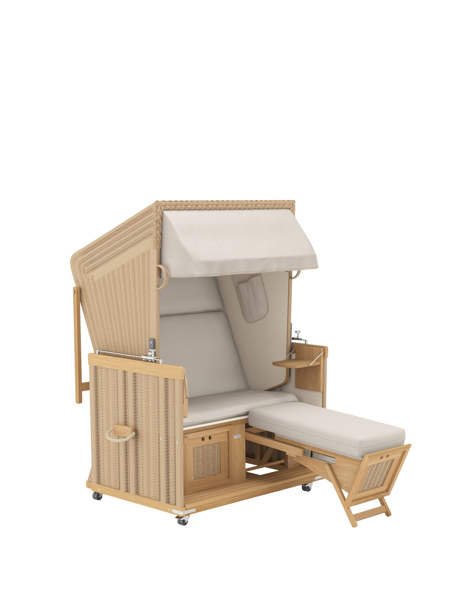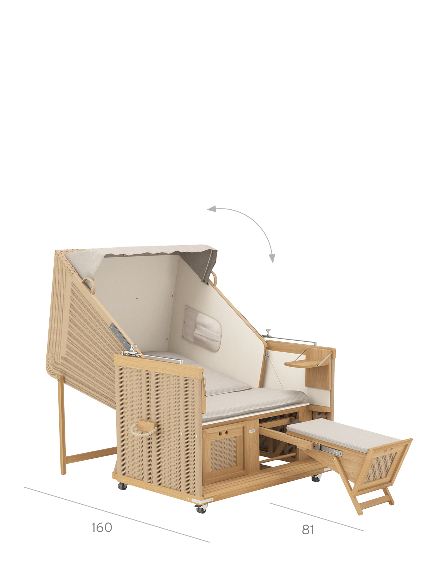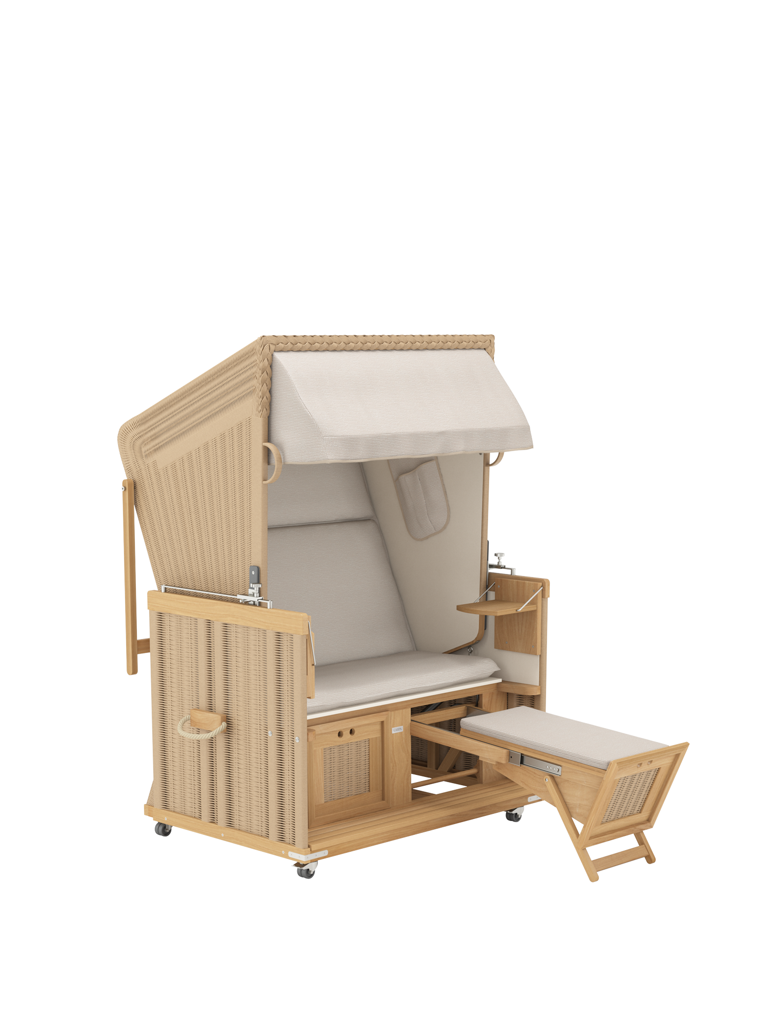 Der geräumige und gepolsterte Sitz des Strandkorbs lässt sich stufenlos zur komplett flachen Doppelliege verstellen. Dank einer Rückholfeder kann der Korb an zwei Griffen leicht wieder aufgerichtet werden. Die Fußkästen gleiten an einem Teleskop-Auszug aus dem Korpus und erlauben es auch großen Menschen, sich bequem auszustrecken. Sie bieten unsichtbaren Stauraum und können mit separat erhältlichen hohen Fußkissen ausgestattet werden.