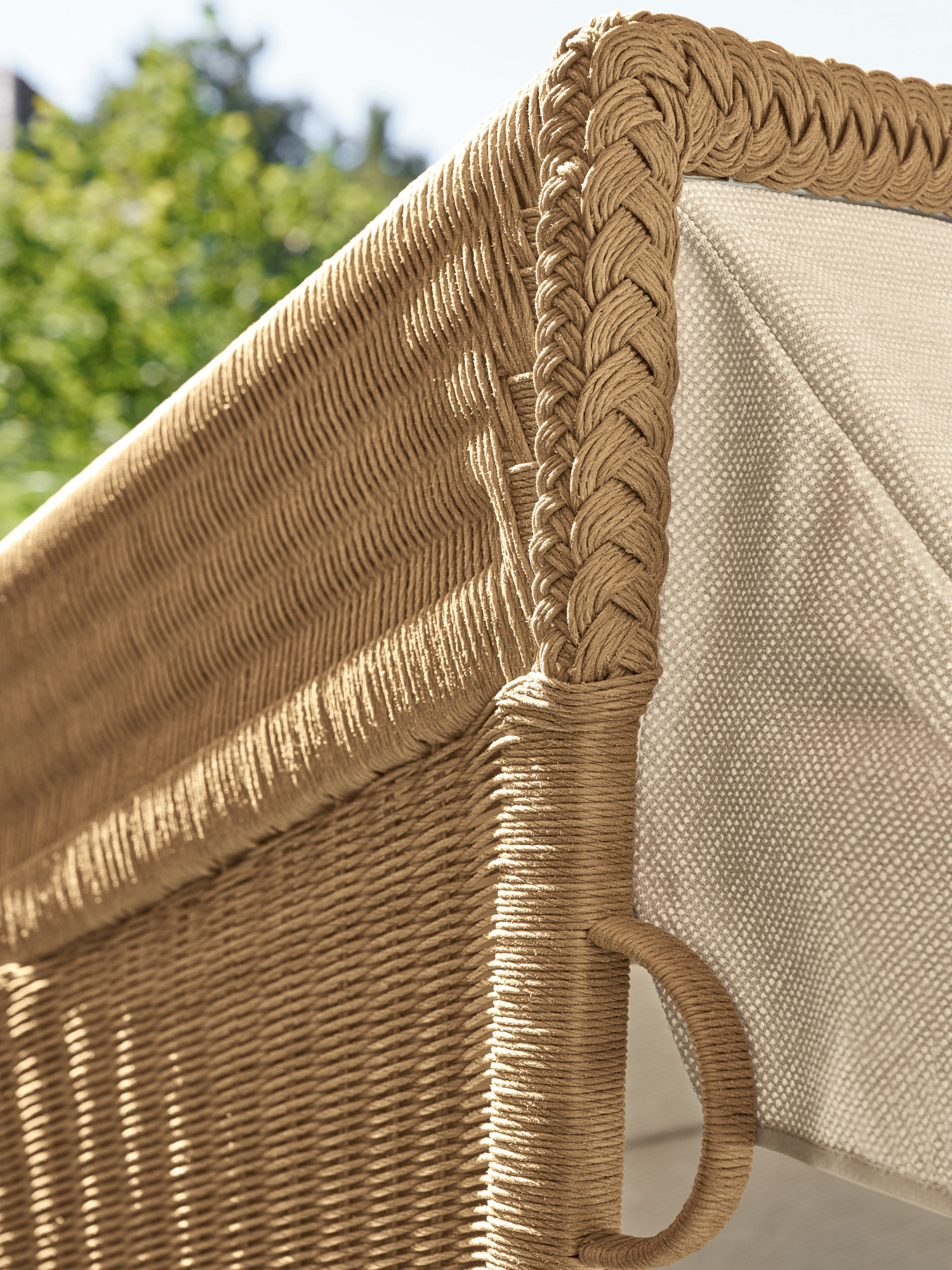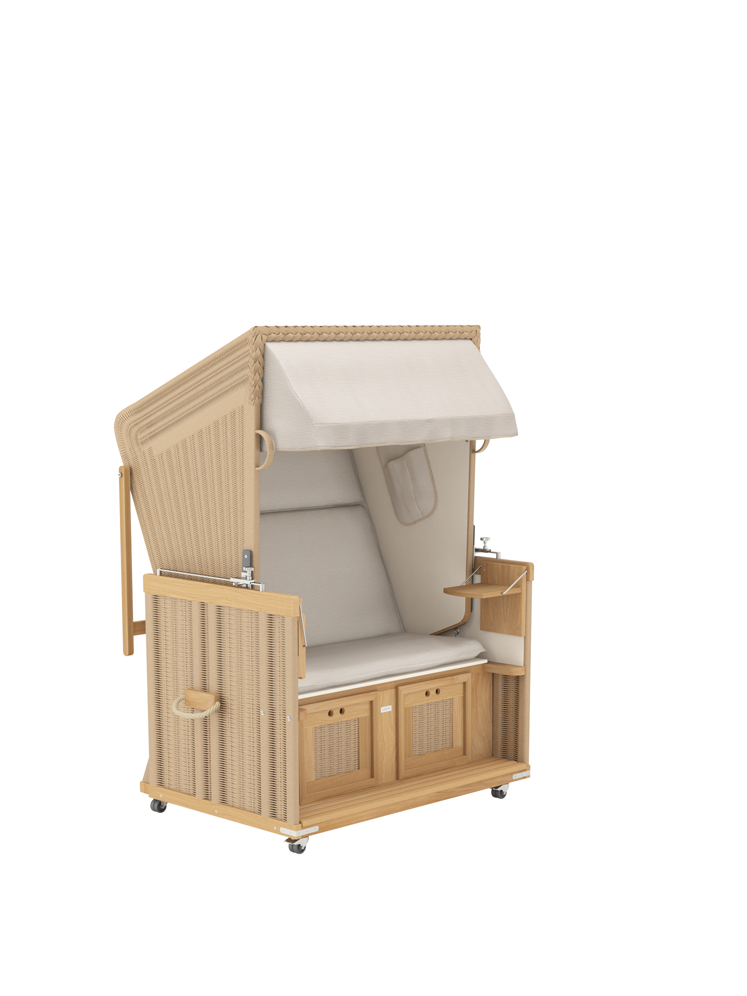 Der Strandkorb hat einen massiven Teakkorpus, der von Edelstahlbeschlägen ergänzt wird, und zeichnet sich nicht zuletzt durch sein wetterfestes Geflecht aus natürlich anmutenden Kunststofffasern aus. Der elegante Stoff im Dessin Desert ist unempfindlich und bis auf die Innenauskleidung abnehm- und waschbar.