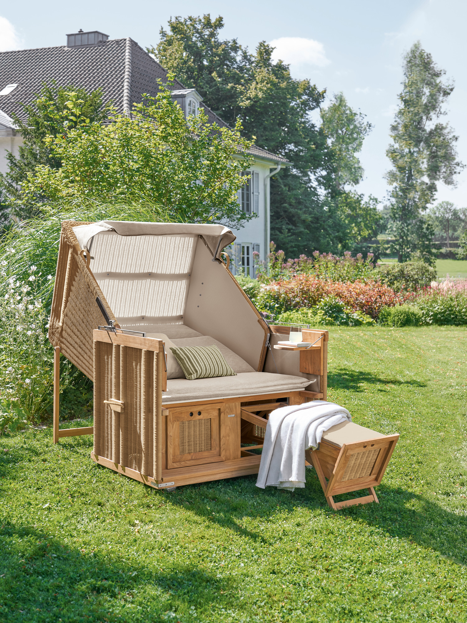 Der Strandkorb Natura Desert versetzt das ganze Jahr in Ferienlaune und bietet Luxus für Detailverliebte.