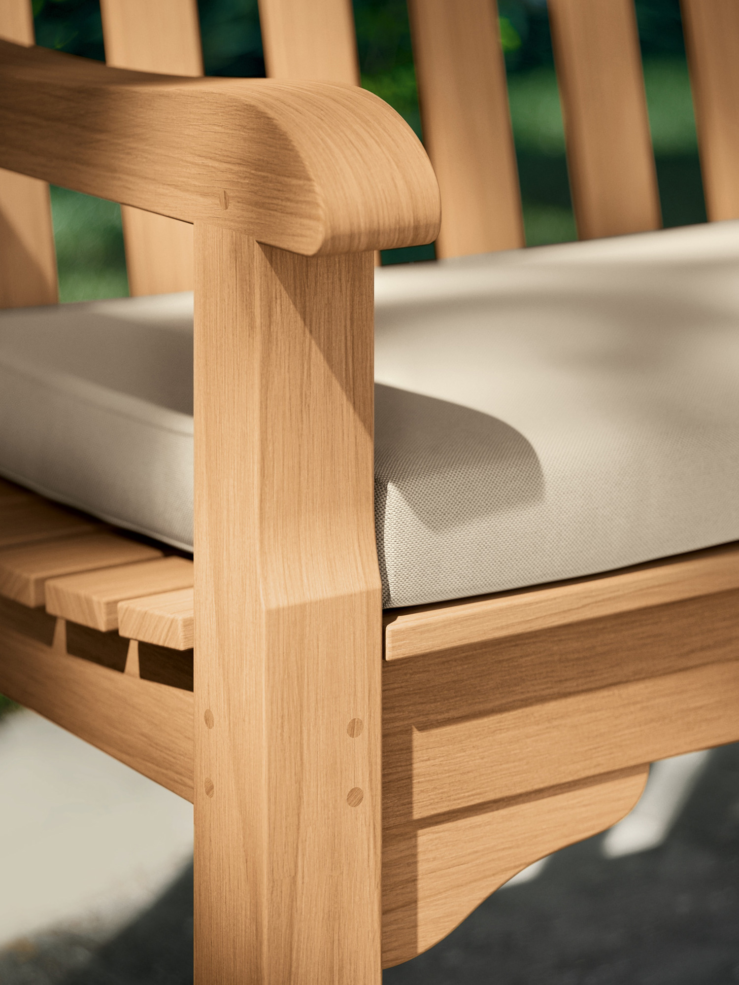 Die großzügige Sitzfläche der Bank aus hochwertigem Plantagenteak ist ganz den Körperlinien angepasst, die Armlehnen handschmeichelnd gerundet und die Leisten gehen so sanft in die Querstrebe über, dass alles wie aus einem Guss wirkt und sich auch so anfühlt.