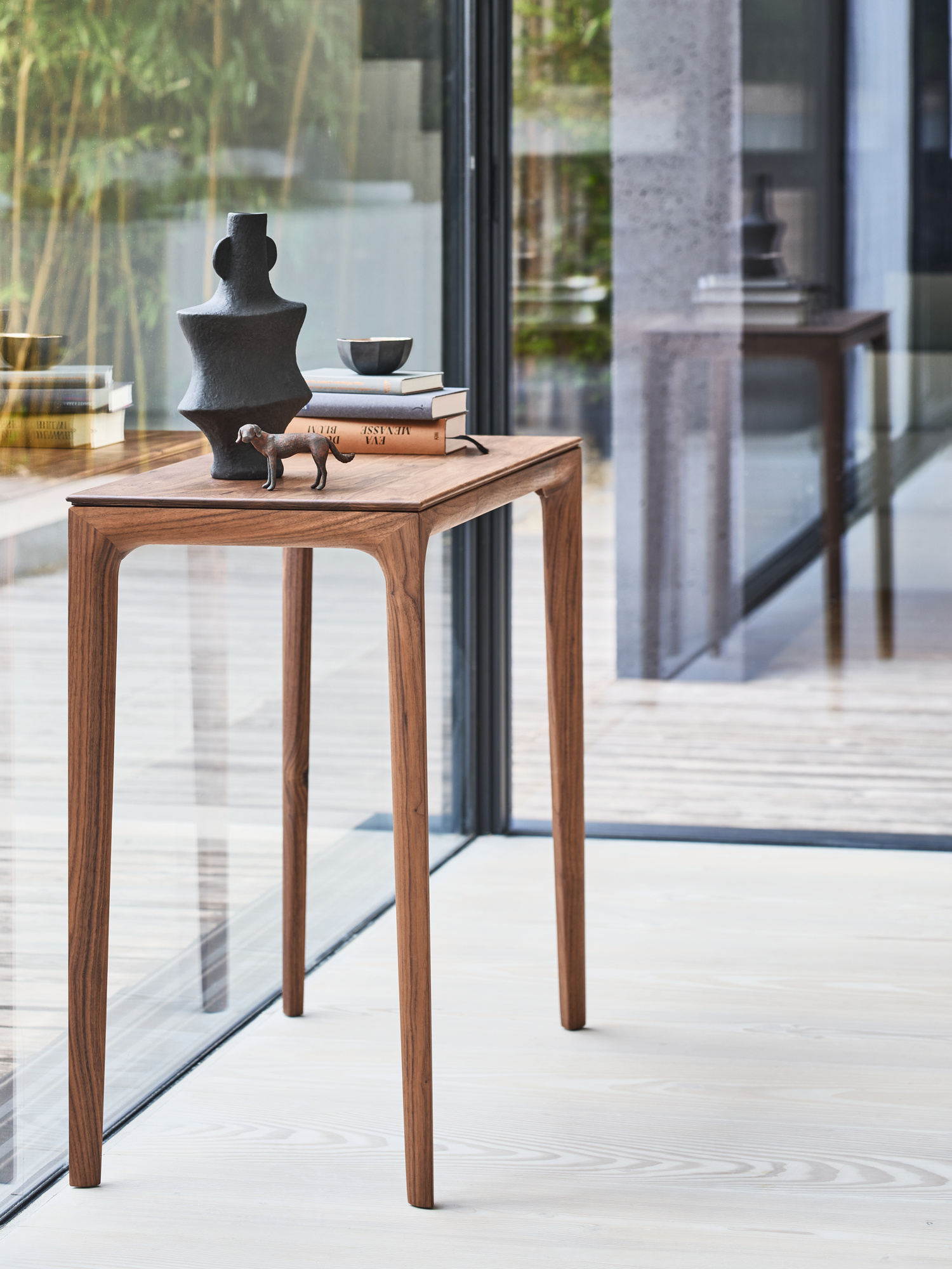Noch ein Stück vom Glück: Der Tavo Tisch besitzt ein eindrucksvolles Gardemaß. Mit dem feingliedrigen Tavo Konsoltisch lässt er sich aber noch einmal um 40 Zentimeter verlängern. Beide Möbel sind aus dem gleichen Holz – aus amerikanischem Nussbaum – gefertigt und haben exakt die gleiche Höhe. Der hochbeinige Konsoltisch ist aber auch als Solitär eine Augenweide. Vor einer Wand oder am Fenster platziert, trägt er Leuchten und Lieblingsbücher oder präsentiert die schönsten Accessoires. In der Diele stimmt er auf den Stil des Hauses ein.