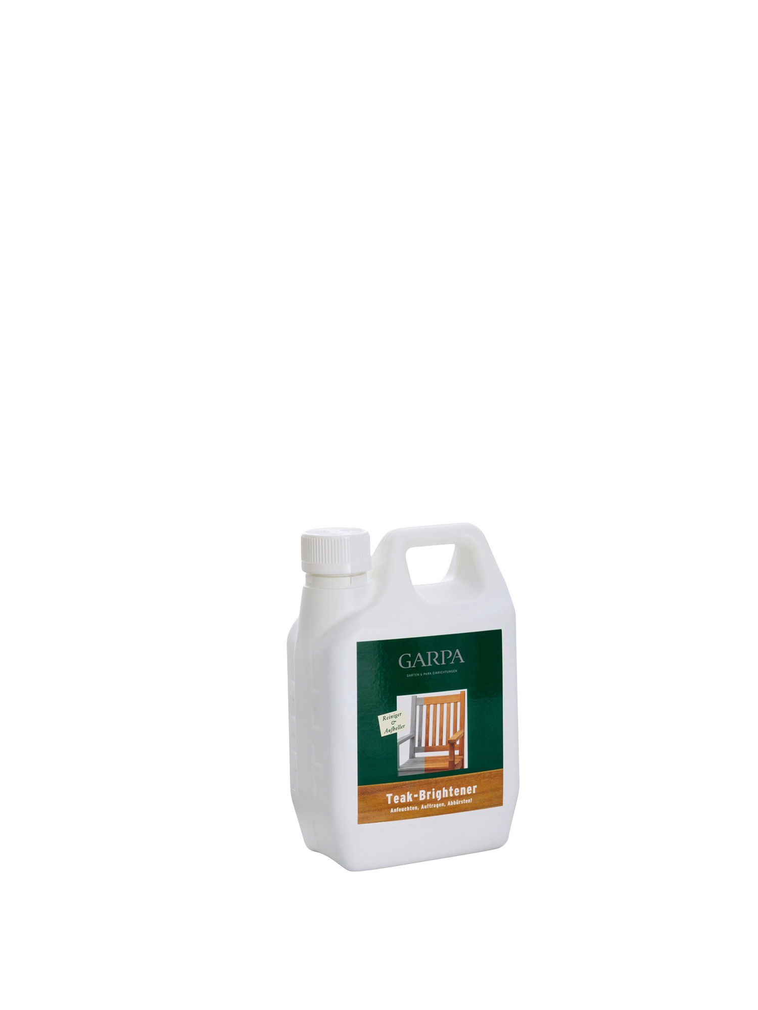 Garpa Teak Brightener gibt stark verwitterten oder verschmutzten Teakmöbeln ihre ursprüngliche Schönheit zurück. Mit dem Spezialreiniger lässt sich der natürliche Holzton annähernd wieder herstellen. Garpa Teak Brightener beschleunigt auch die Farbanpassung zwischen neuen Leisten und bereits ergrautem Holz. Hartnäckige Schmutzflecken und Ablagerungen, die allein mit Grüner Seife nicht zu entfernen sind, können Sie ebenfalls damit behandeln.