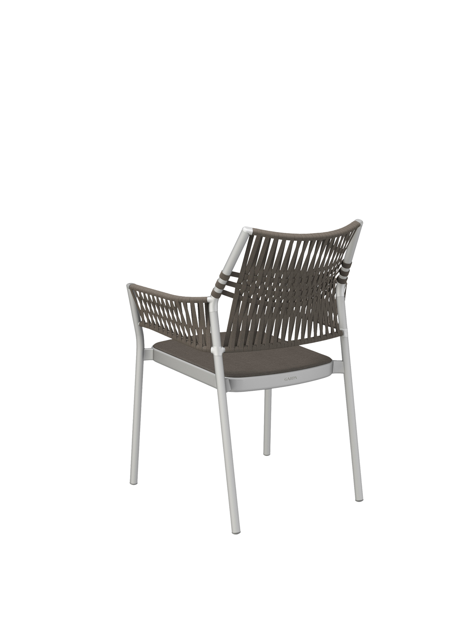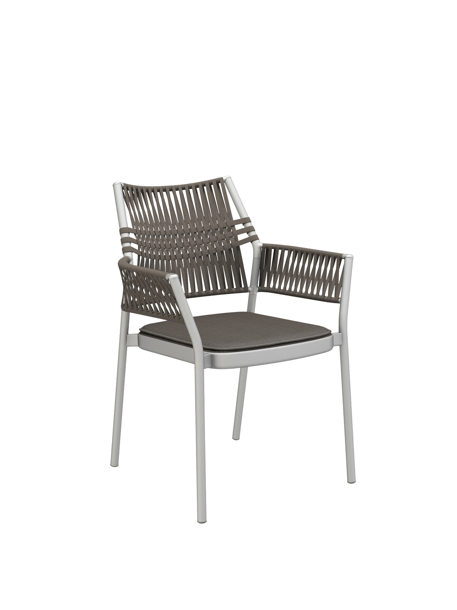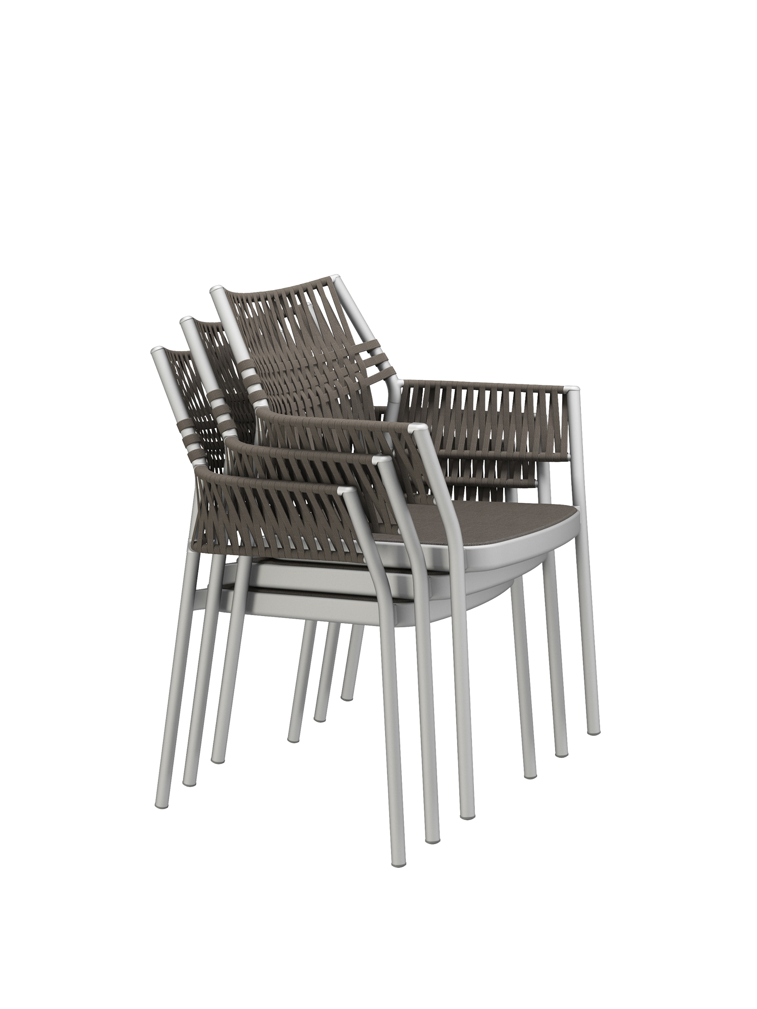 Die dreidimensional geflochtene Bespannung der stapelbaren Stühle besteht aus einem schnelltrocknenden, UV-beständigen und pflegeleichten Polypropylen, das Gewebe der Sitzflächen aus Polyacryl. Die Kordeln entstehen durch das Verweben unterschiedlicher Garne, deren Farbnuancen und textile Materialität den Möbeln zusätzliche Spannung und Tiefe verleihen.
