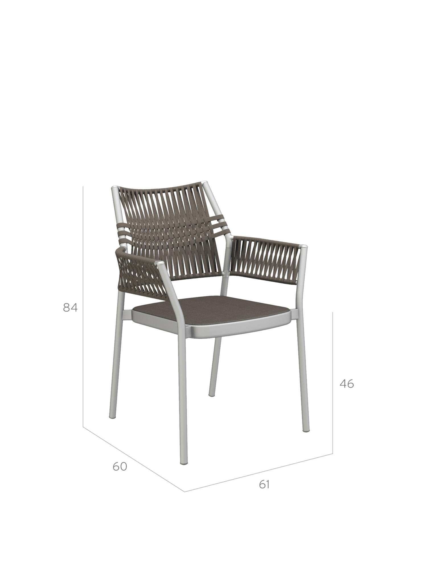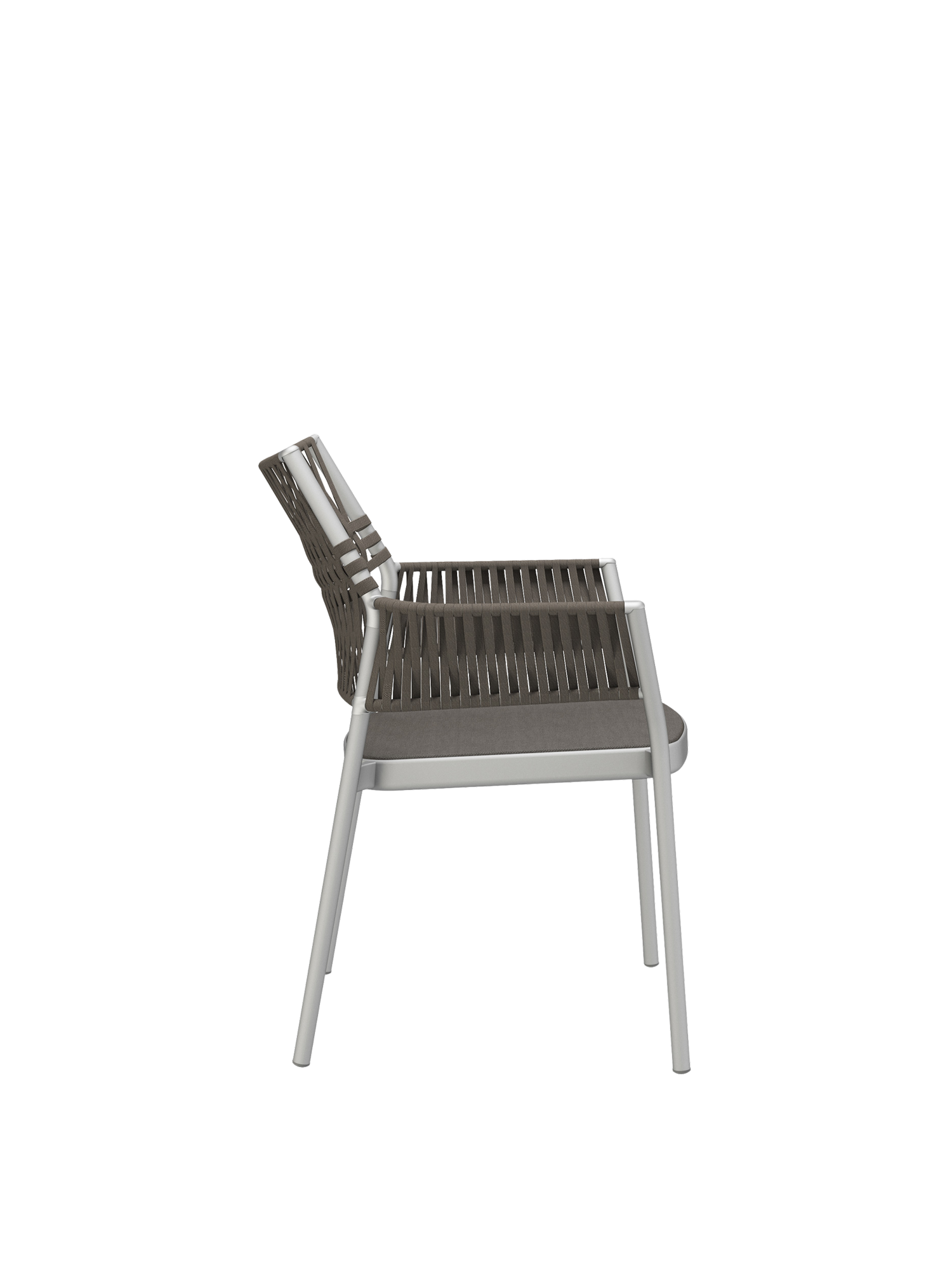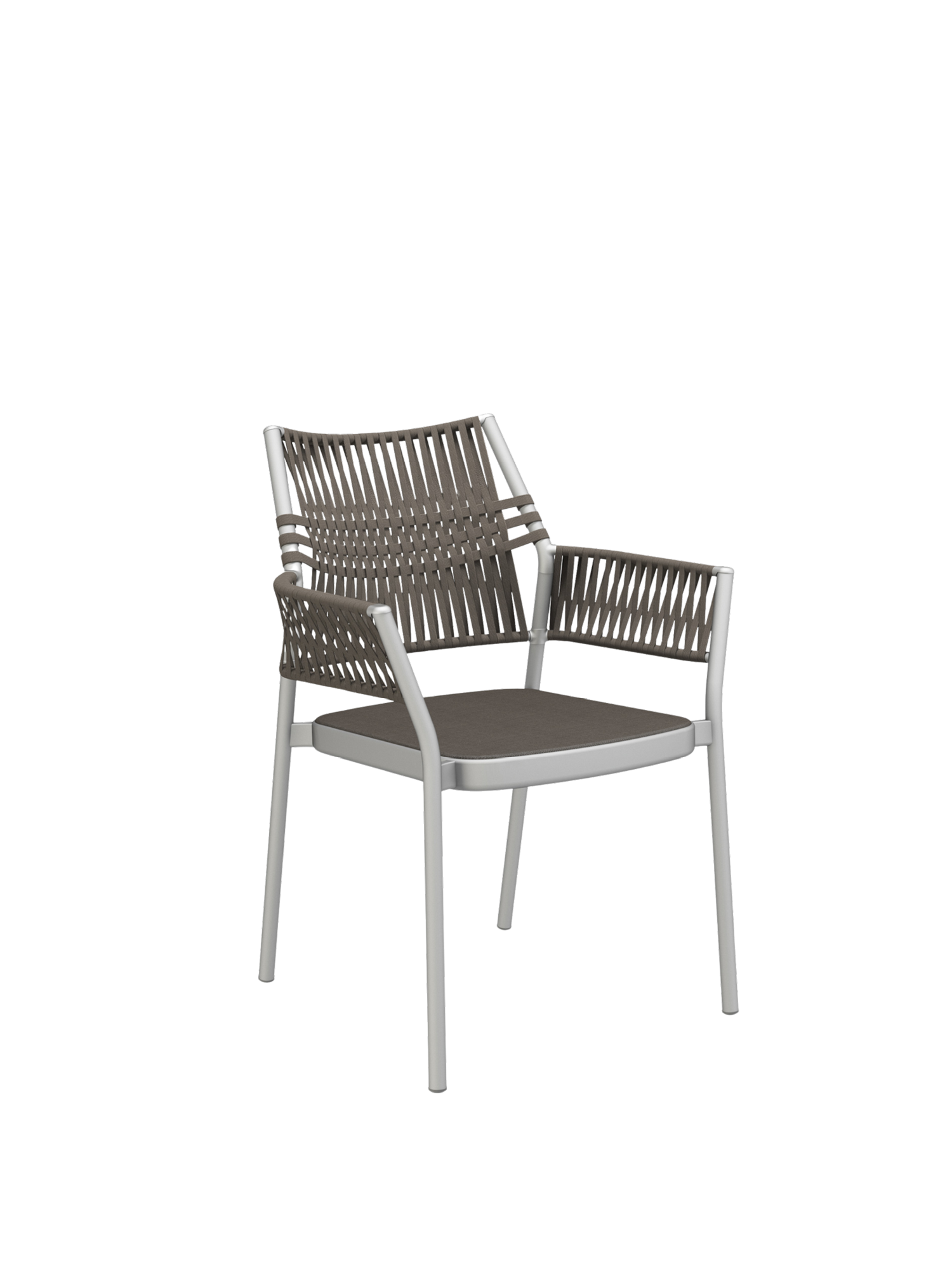 Die dreidimensional geflochtene Bespannung der stapelbaren Stühle besteht aus einem schnelltrocknenden, UV-beständigen und pflegeleichten Polypropylen, das Gewebe der Sitzflächen aus Polyacryl. Die Kordeln entstehen durch das Verweben unterschiedlicher Garne, deren Farbnuancen und textile Materialität den Möbeln zusätzliche Spannung und Tiefe verleihen.