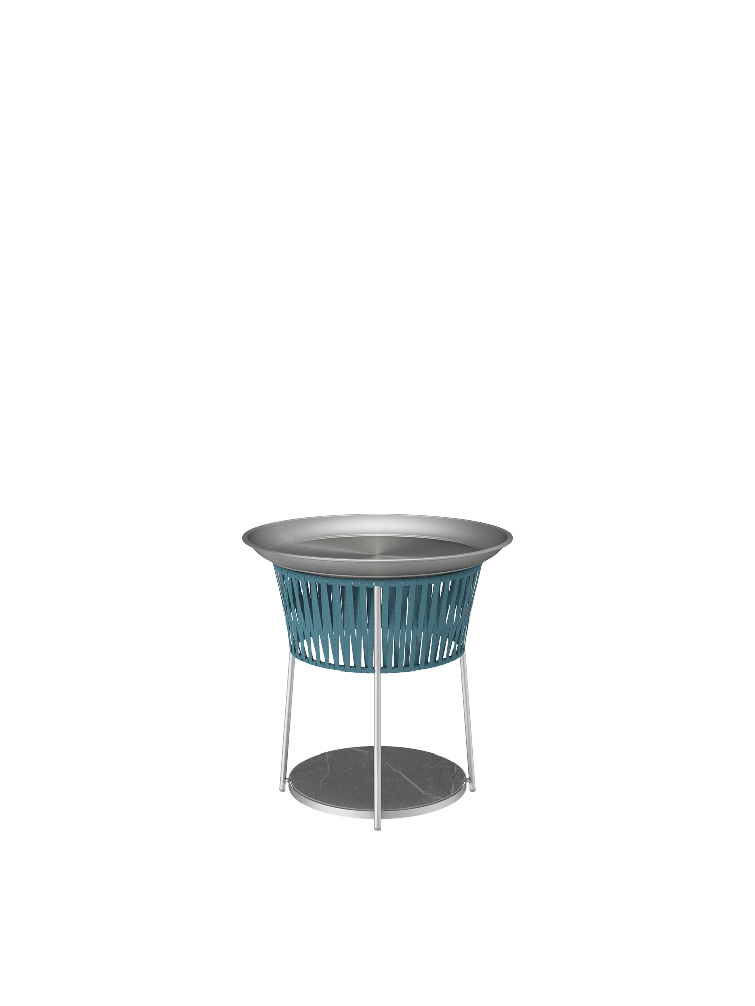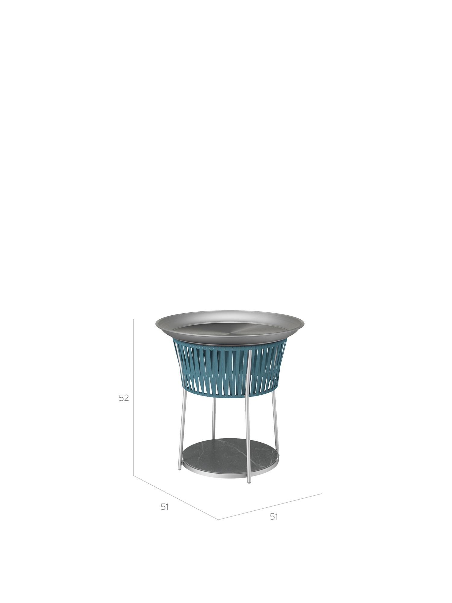 Umflochten mit der stilprägenden Kordel der Temper Serie aus schnelltrocknendem Polypropylen in Petrol oder Braun ist der filigrane Beistelltisch aus eloxiertem Aluminium, der ein abnehmbares Tablett aus mattiertem Edelstahl trägt. Er ist wahlweise mit einem Boden aus Steinkeramik oder Glas erhältlich.