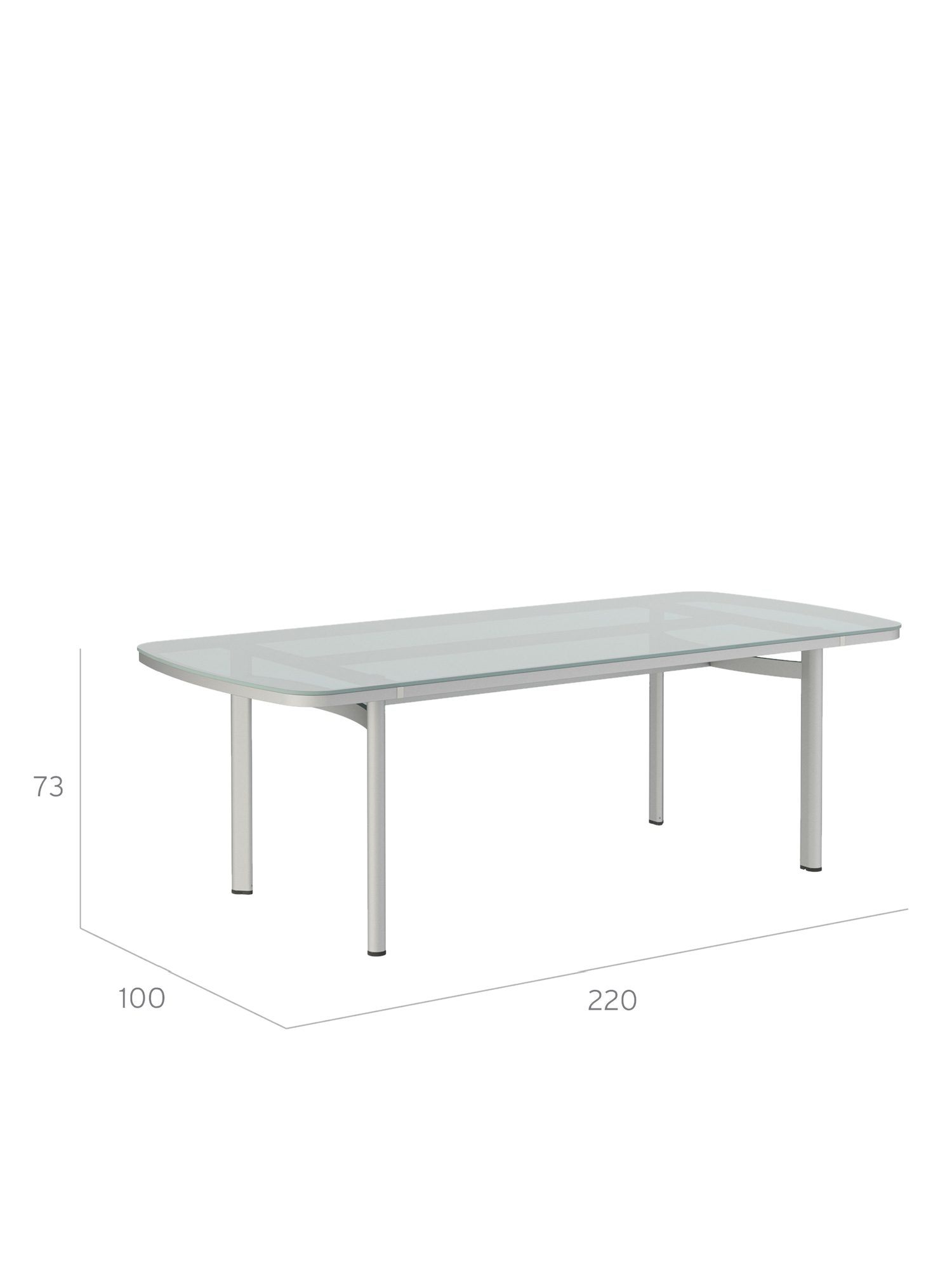 Die zur Temper Serie gehörigen Tische haben gerade Kanten und runde Ecken. Ihre Aluminiumgestelle sind aufwendig eloxiert, die Tischplatten bestehen aus hochwertiger, frostfester Steinkeramik in einer Marmoroptik oder farbigem Glas.