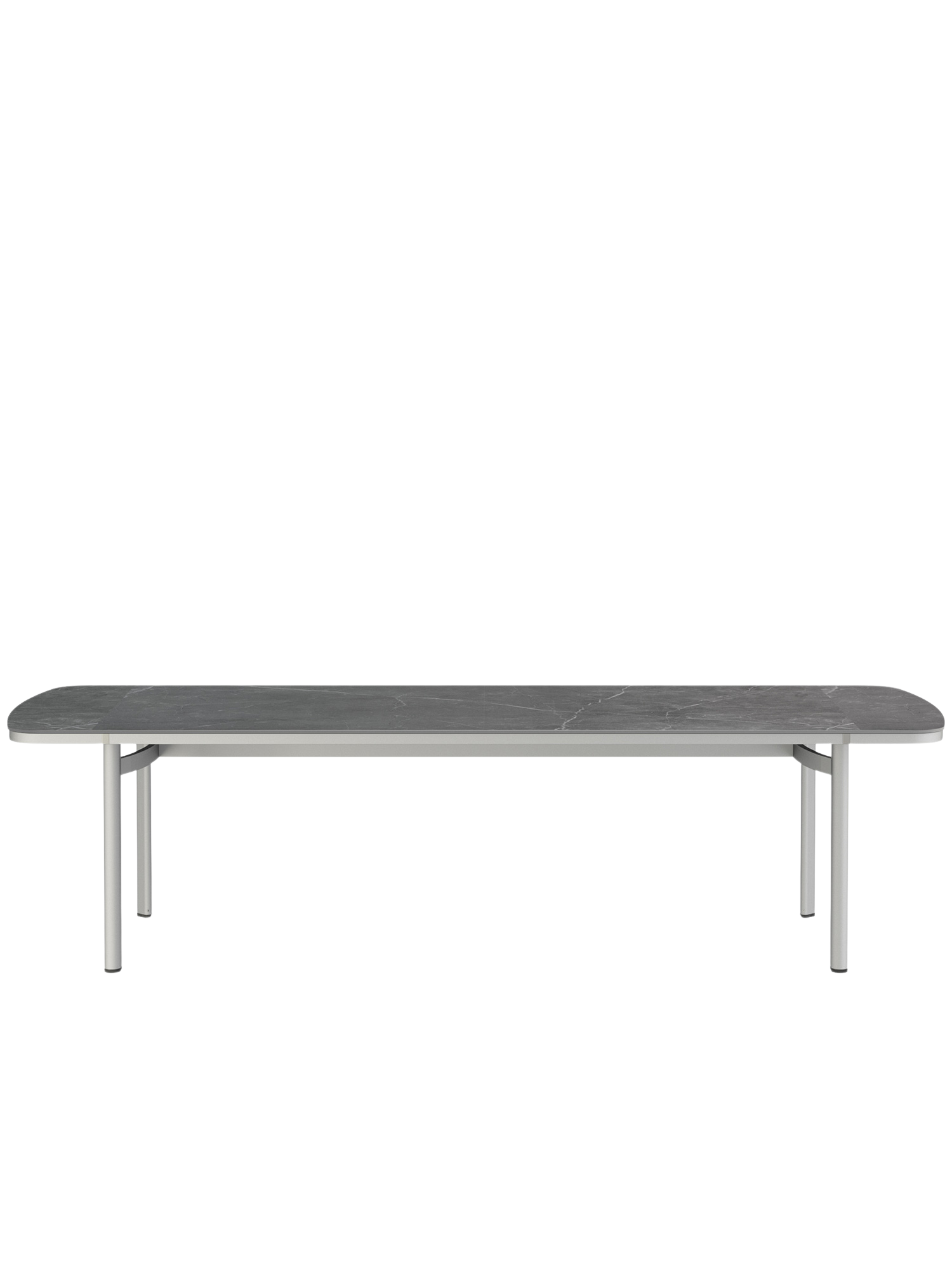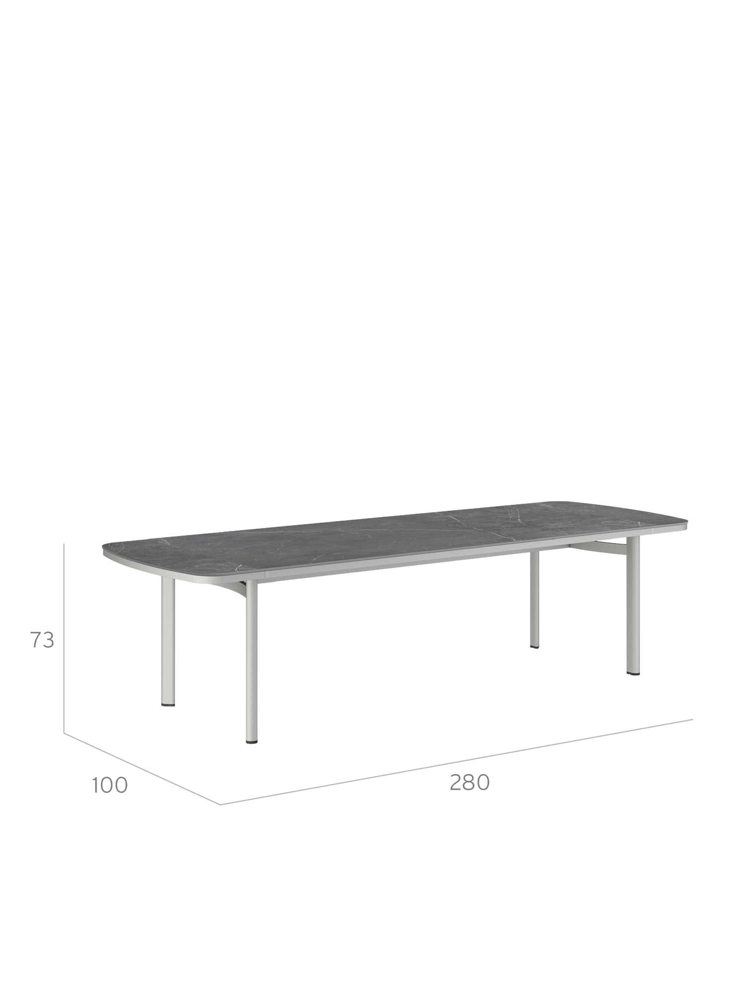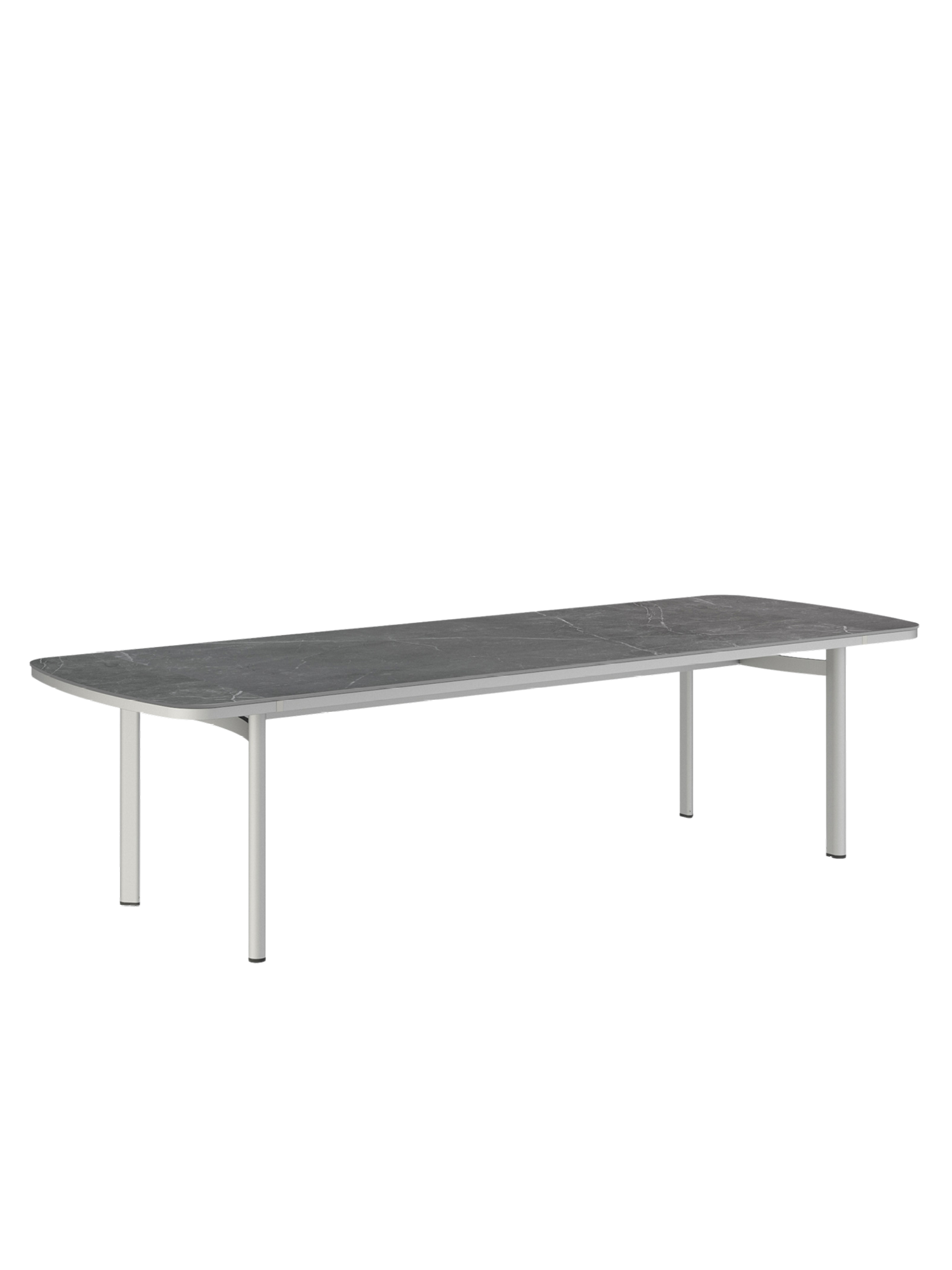 Die sanften Farbtöne der pflegeleichten und UV-beständigen Steinkeramikplatten harmonieren mit dem Geflecht der Kordeln und dem weich schimmernden Eloxal des Tischgestells. Die mattgrauen Oberflächen mit der Anmutung dekorativ gemaserten Marmors verleihen den großzügigen Tischen, die in drei Größen erhältlich sind, einen edlen Akzent.