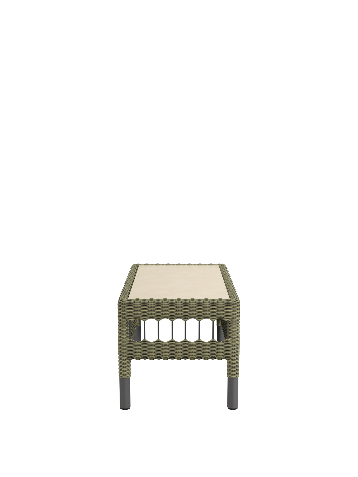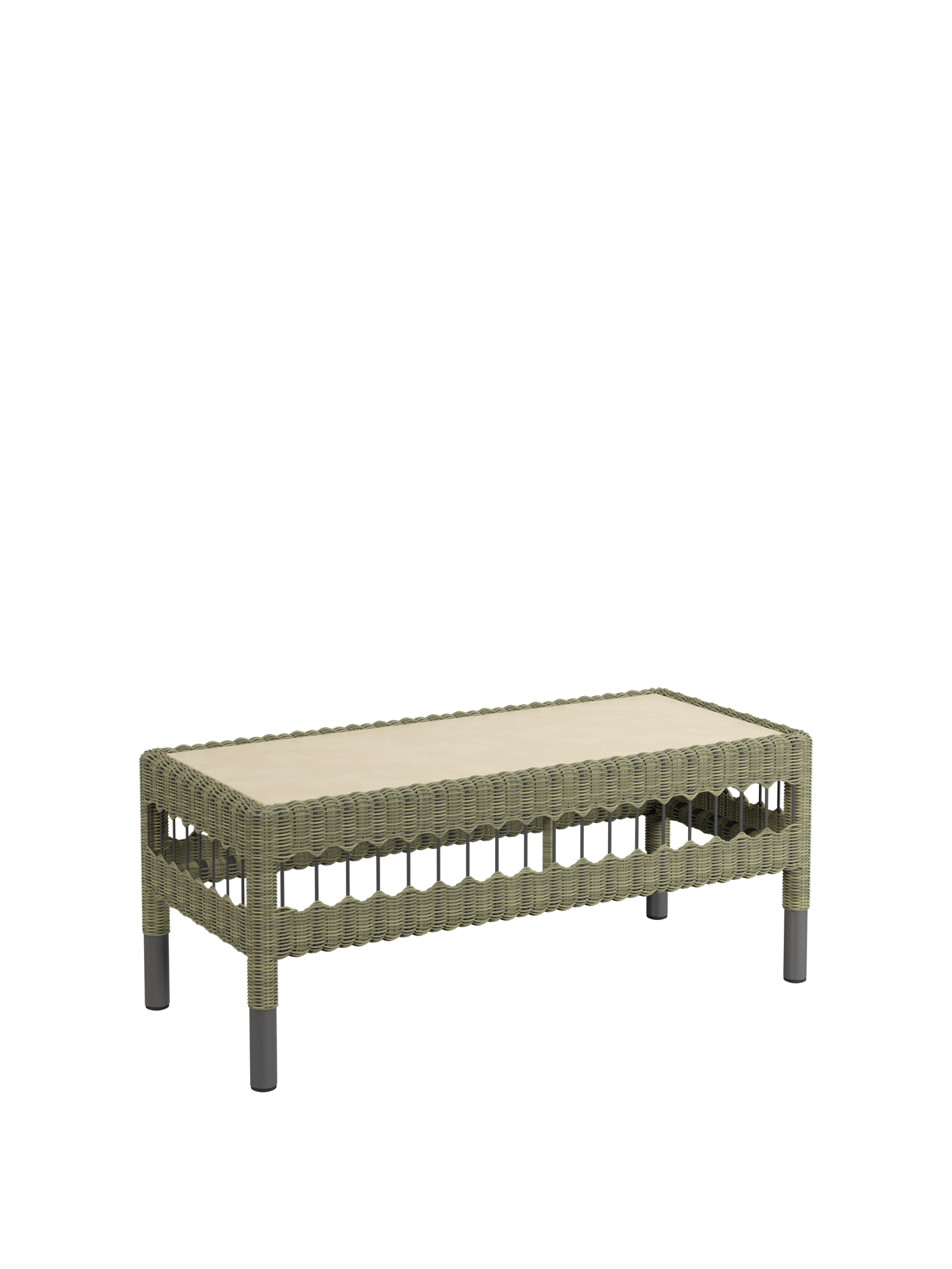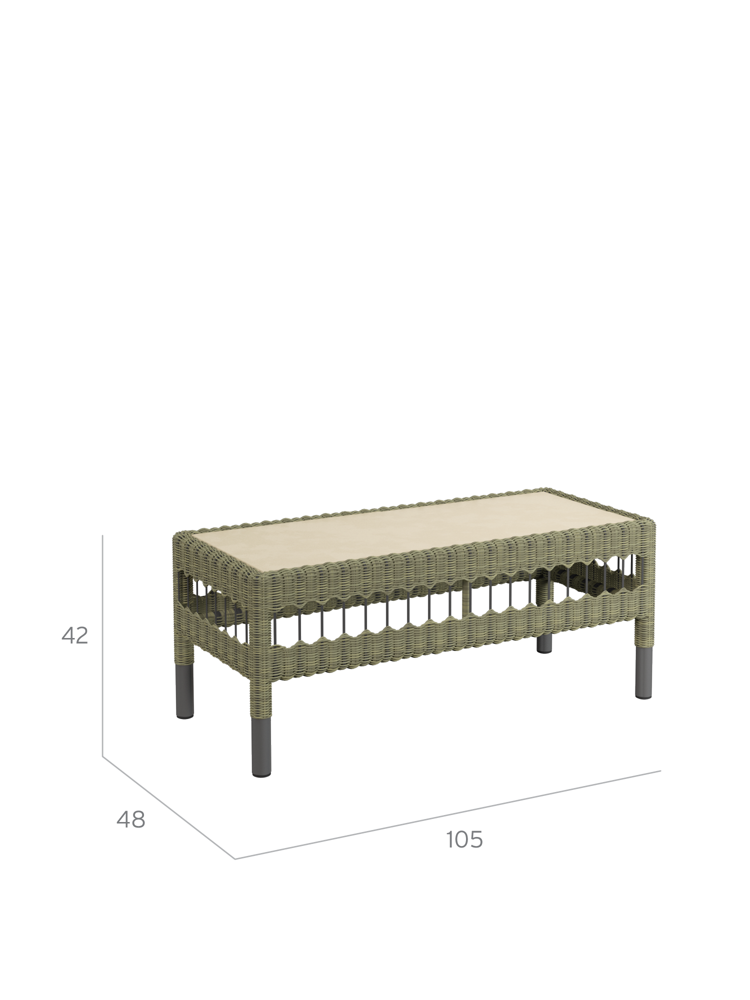 Ein pulverbeschichtetes Aluminiumrohr bildet die Basis des Torenso Beistelltischs. Vom zweifarbigen Geflecht aus Kunststofffasern mit einem Durchmesser von 3 mm wird es stilvoll verborgen. Die Braun- und Grüntöne harmonieren mit dem warmen Beige der Tischoberfläche aus leicht matt strukturierter Steinkeramik und mit den Füßen aus pulverbeschichtetem Aluminium.