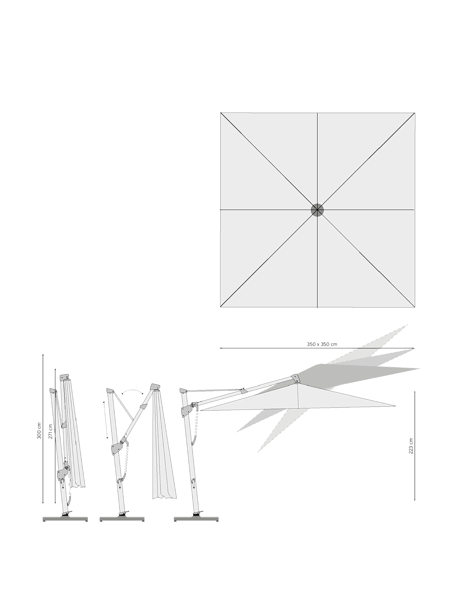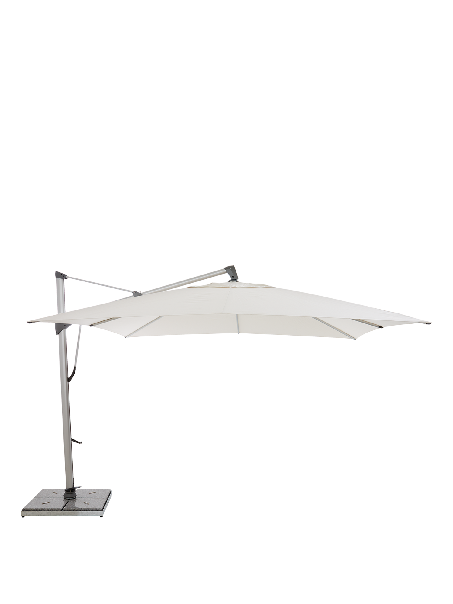 Trentino ist mit einem Durchmesser von 400 cm oder in quadratischer Form mit einem Maß von 350 x 350 cm erhältlich und eignet sich mit seinem seitlichen Mast besonders für großzügige Situationen.
