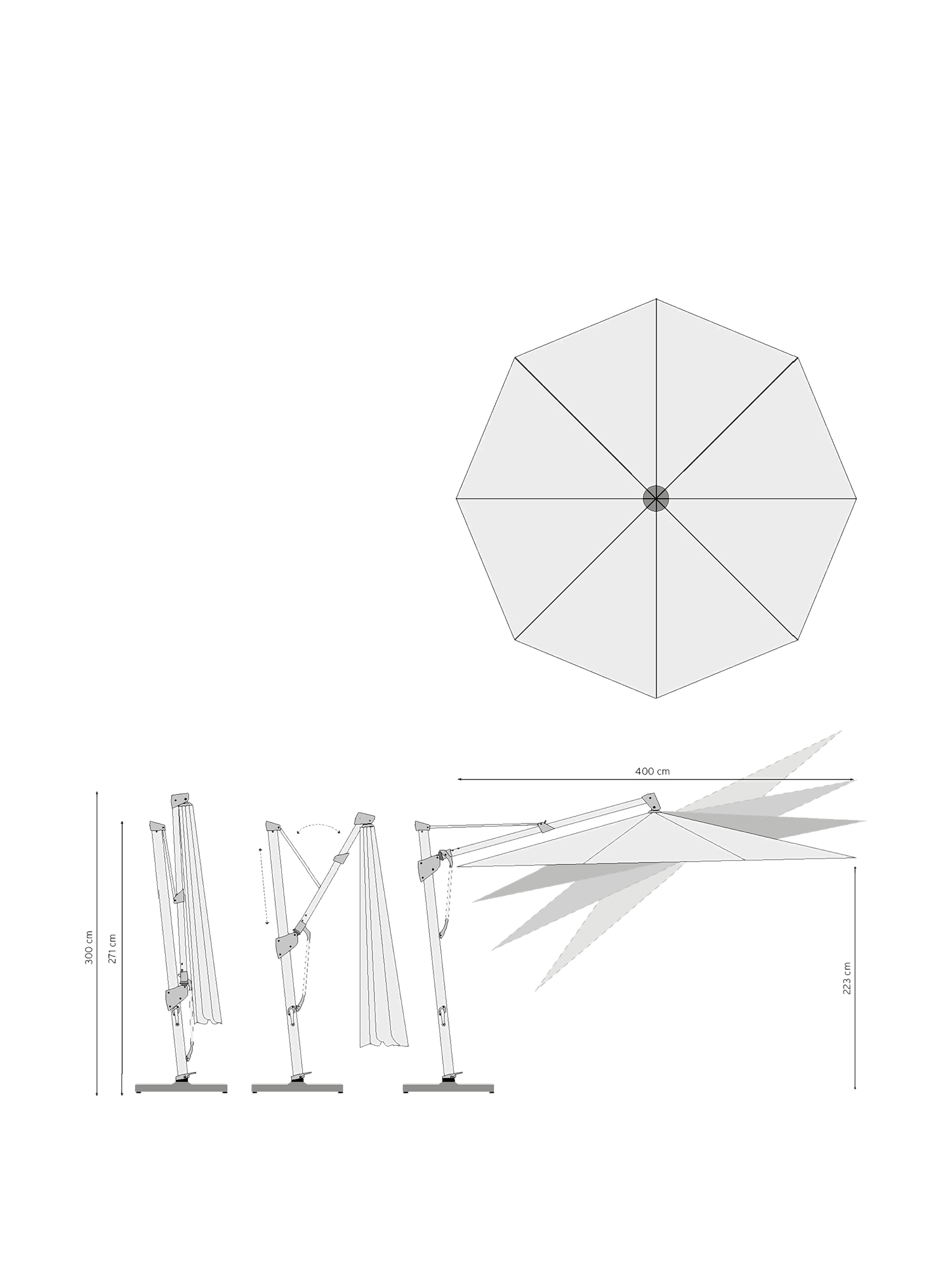 Trentino ist mit einem Durchmesser von 4,00 m* oder in quadratischer Form mit einem Maß von 3,50 x 3,50 m erhältlich und eignet sich mit seinem seitlichen Mast besonders für großzügige Situationen.