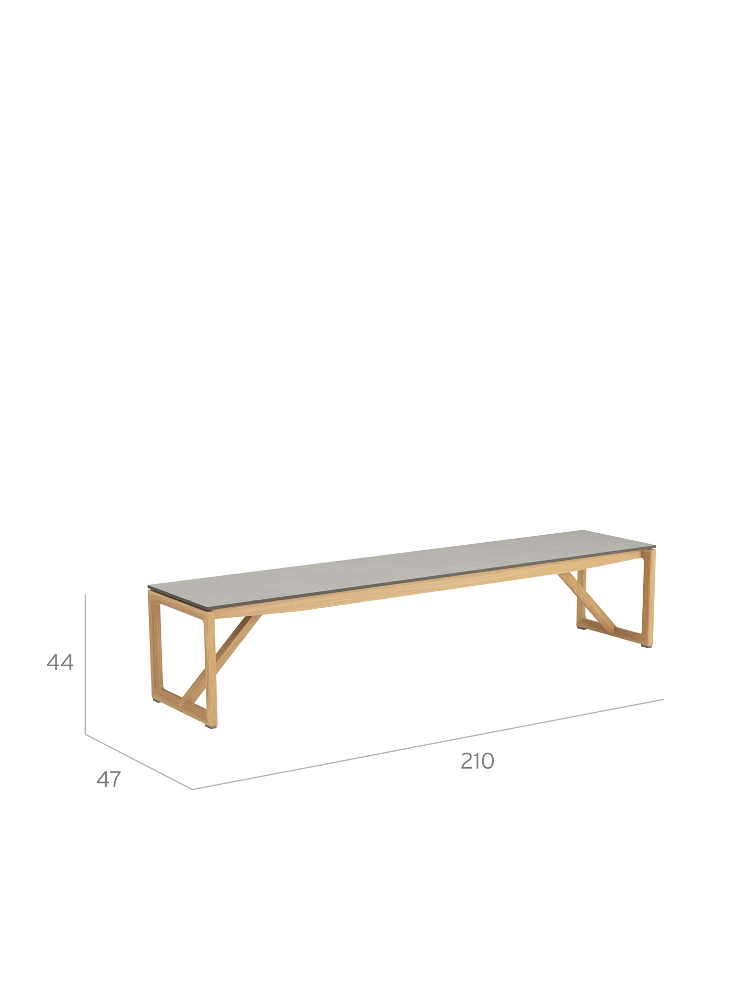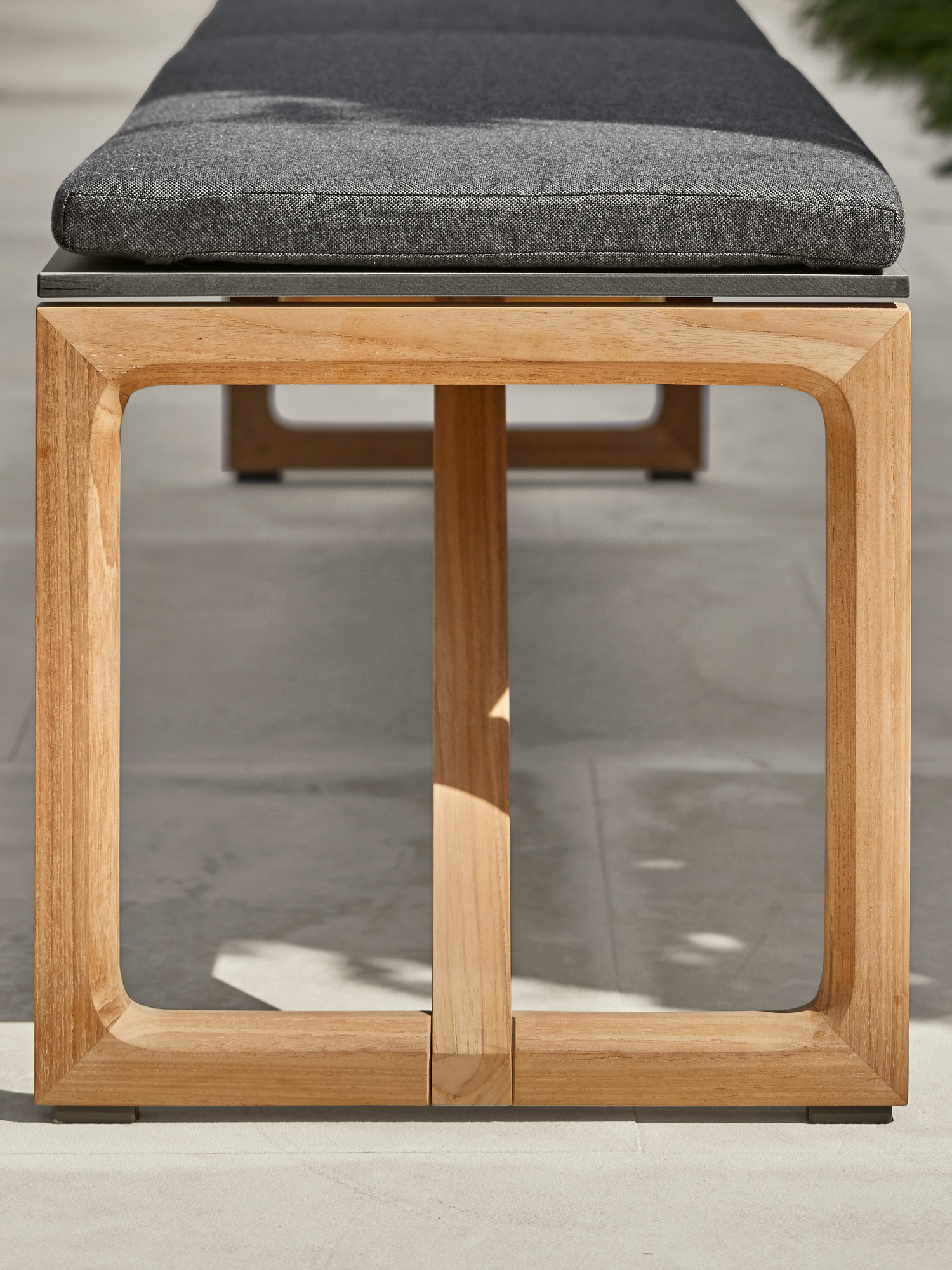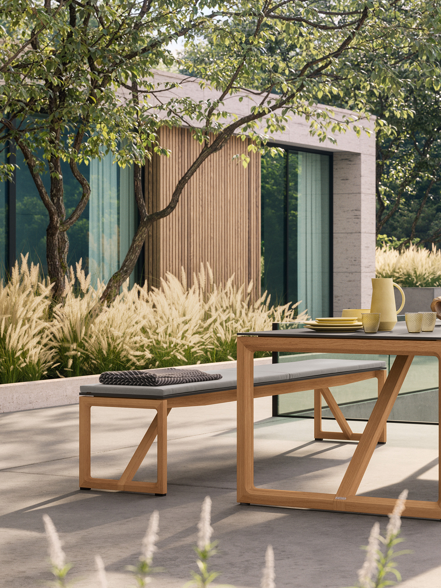 Die Bänke der Serie, mit oder ohne Lehne, gleichen in ihrer Konstruktion aus Teakholzrahmen und Kunstharzplatten dem Tisch. Nach geselligen Abenden oder bei Dauerregen können sie in voller Länge unter ihm verschwinden und bilden gemeinsam eine kompakte Quaderform. Die leicht strukturierten und ganz natürlich wirkenden grauen Oberflächen aus Kunstharz machen alles mit. Sie sind wetter- und UV-beständig und kinderleicht zu reinigen.