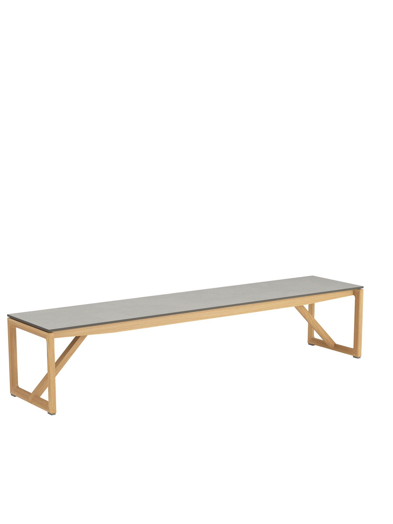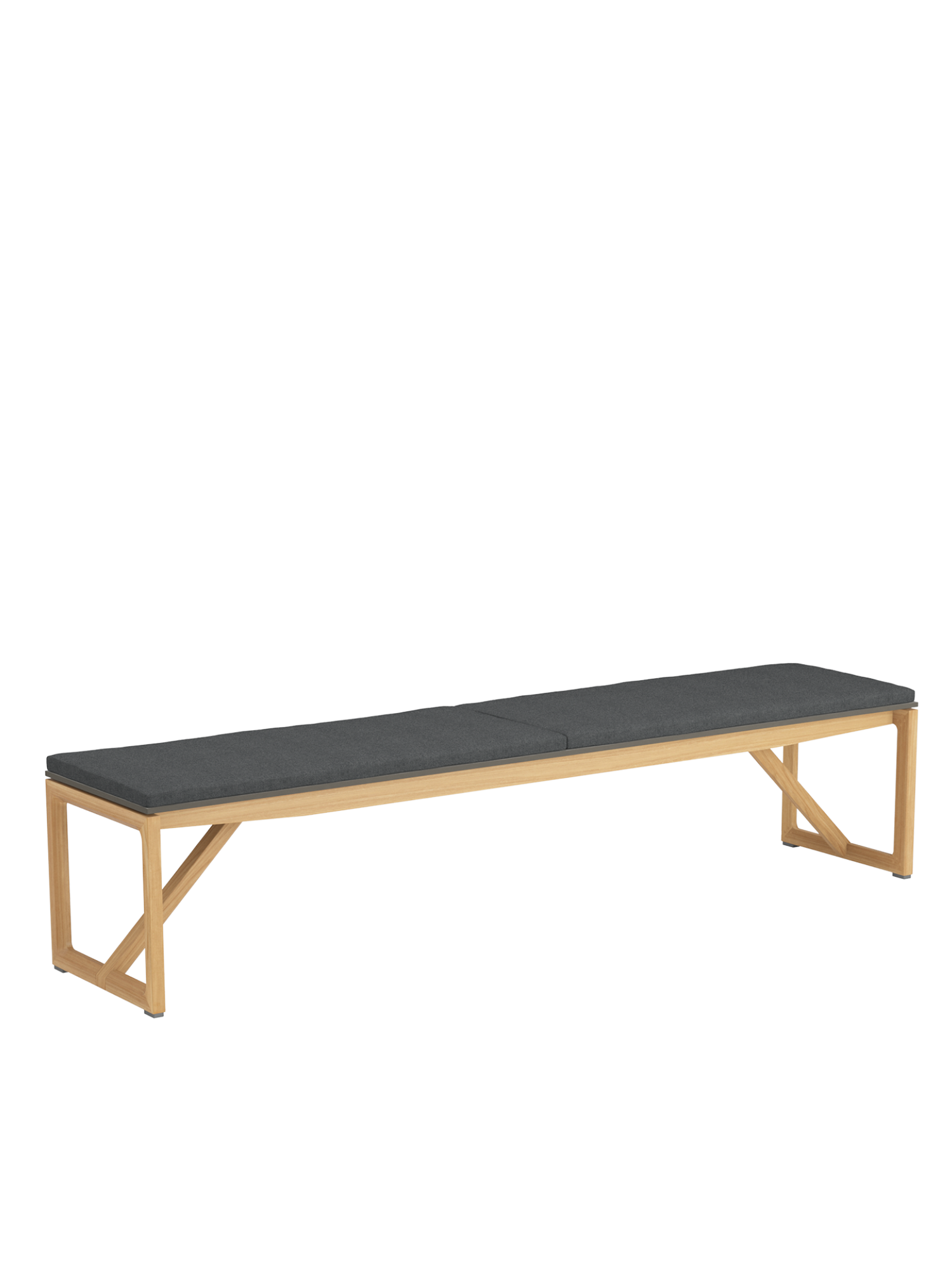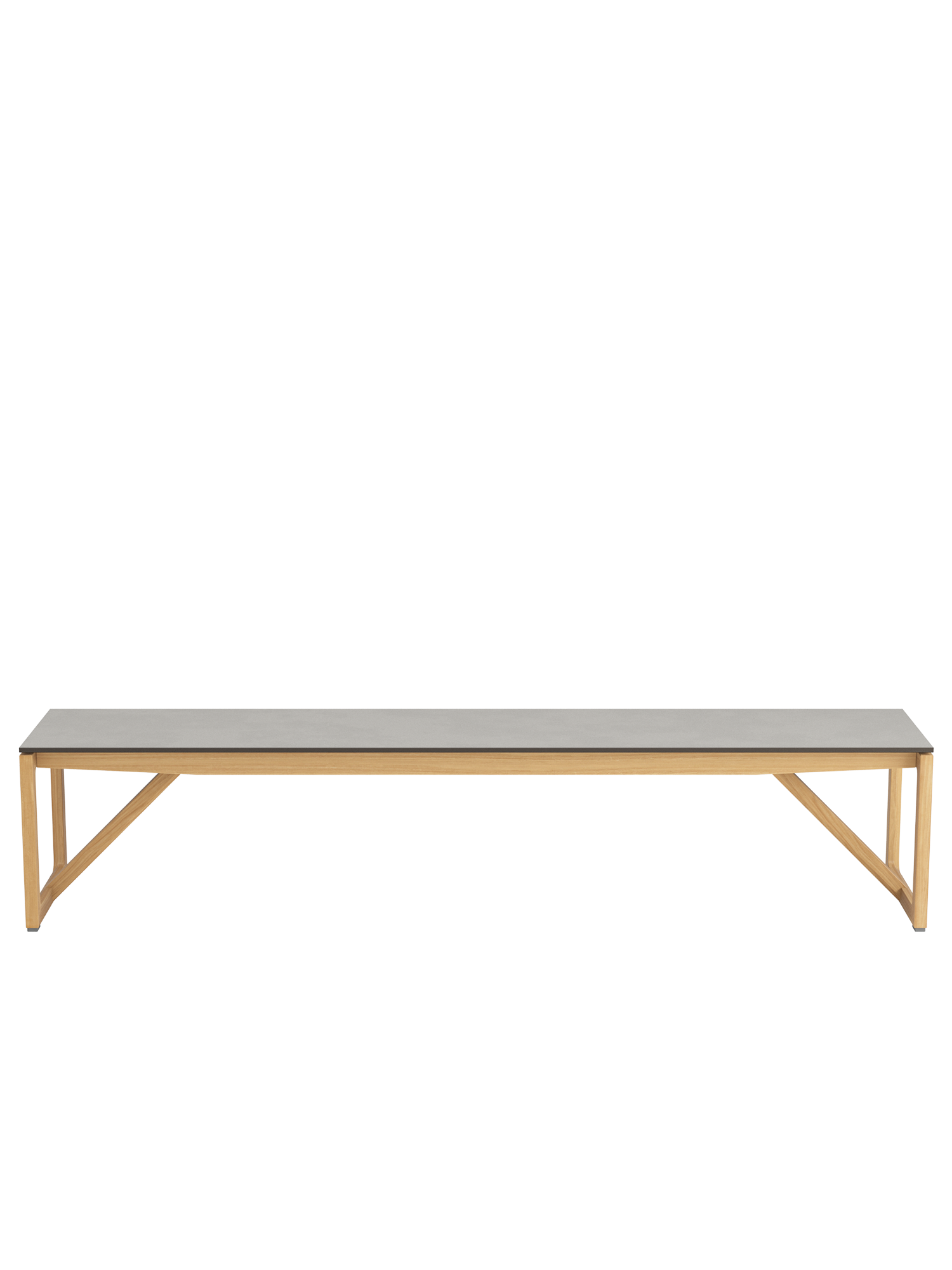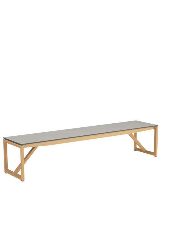 Die Bänke der Serie, mit oder ohne Lehne, gleichen in ihrer Konstruktion aus Teakholzrahmen und Kunstharzplatten dem Tisch. Nach geselligen Abenden oder bei Dauerregen können sie in voller Länge unter ihm verschwinden und bilden gemeinsam eine kompakte Quaderform. Die leicht strukturierten und ganz natürlich wirkenden grauen Oberflächen aus Kunstharz machen alles mit. Sie sind wetter- und UV-beständig und kinderleicht zu reinigen.
