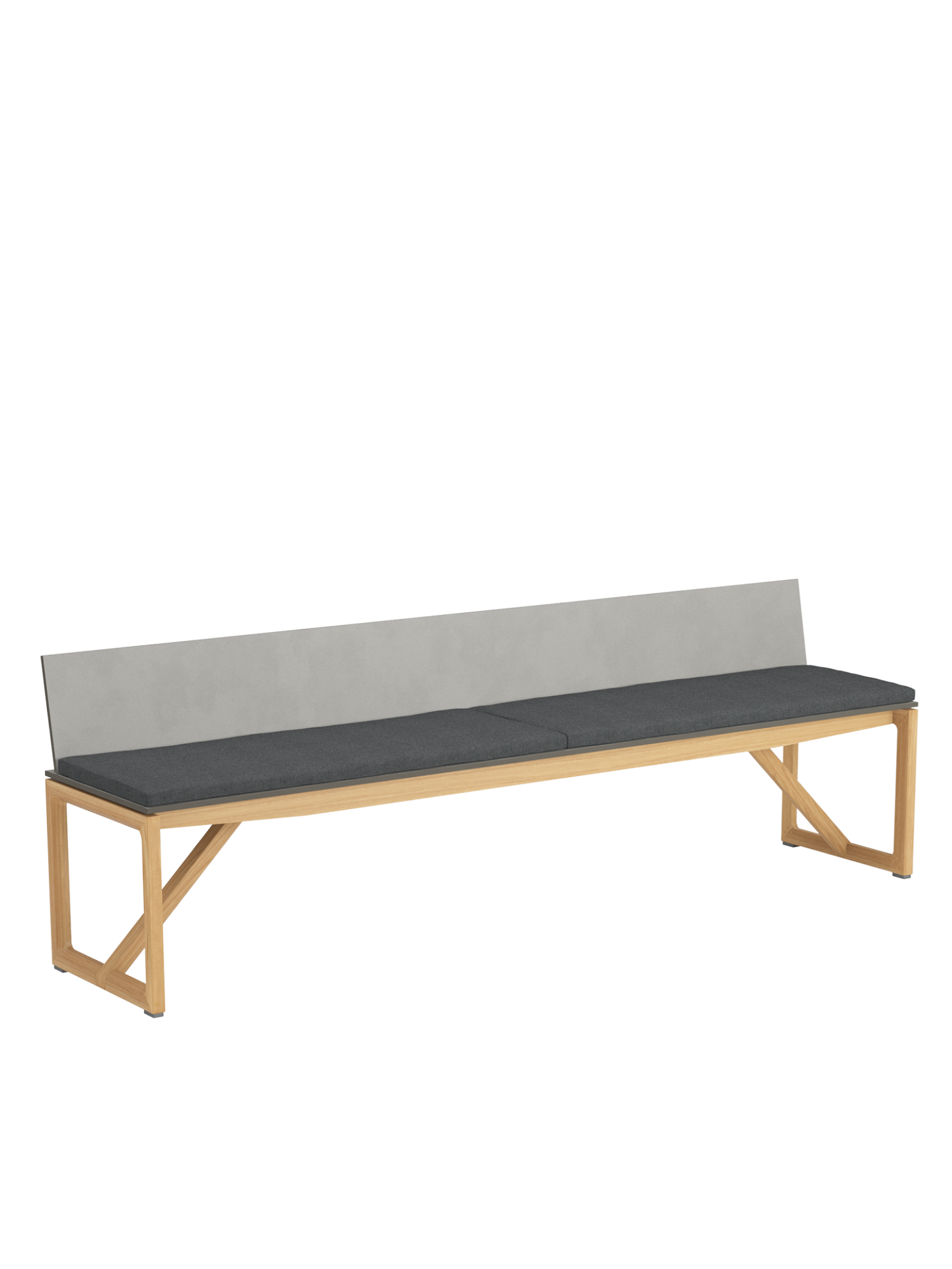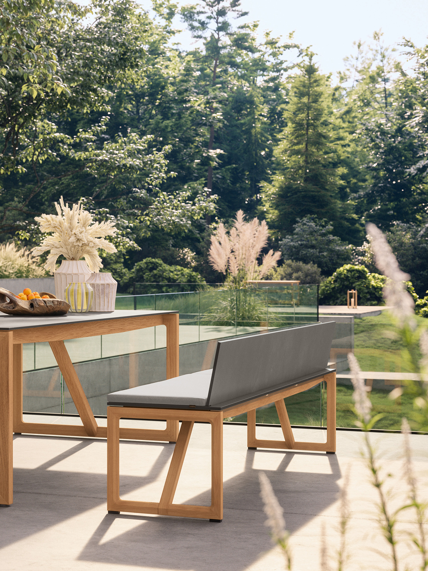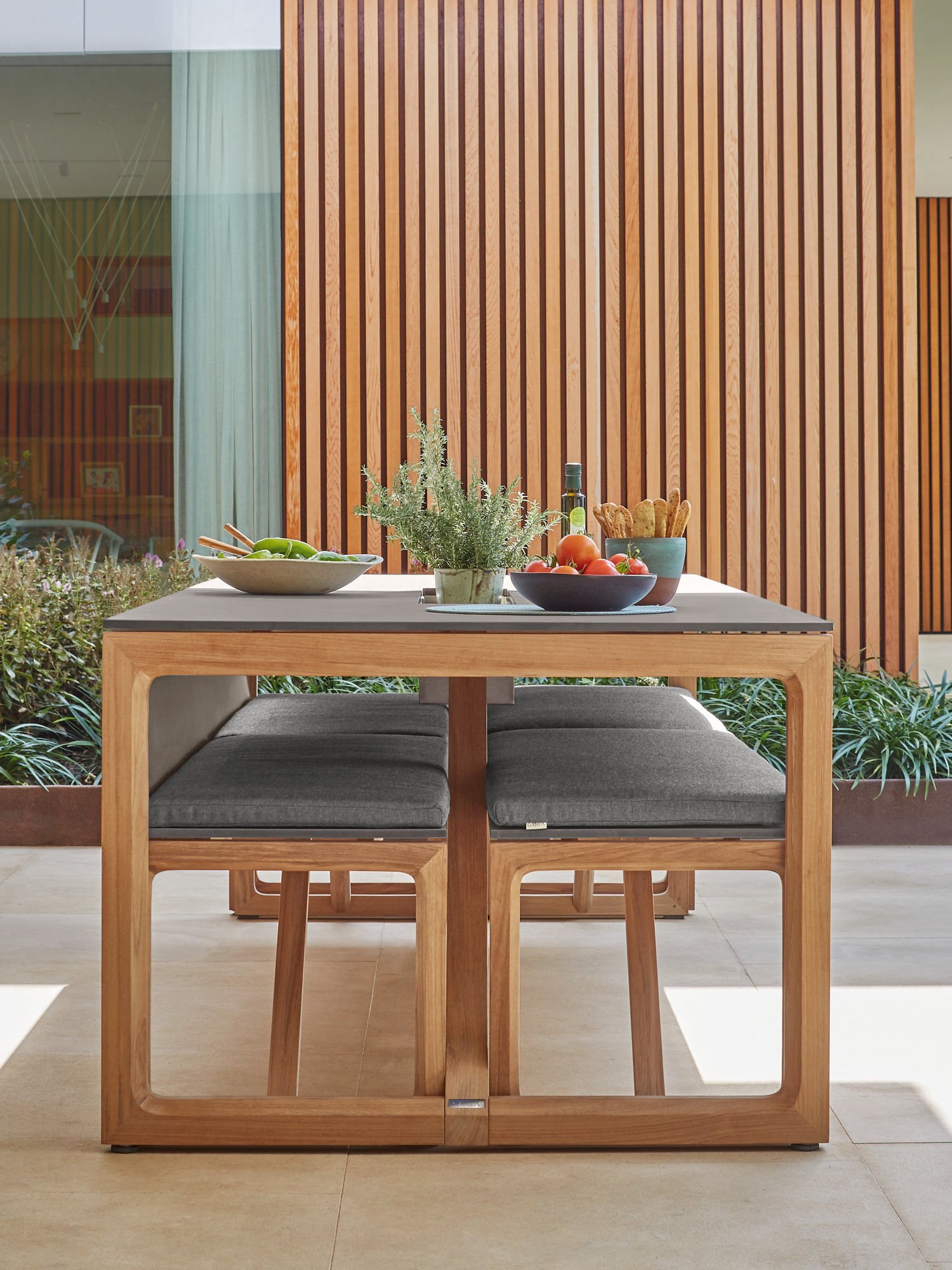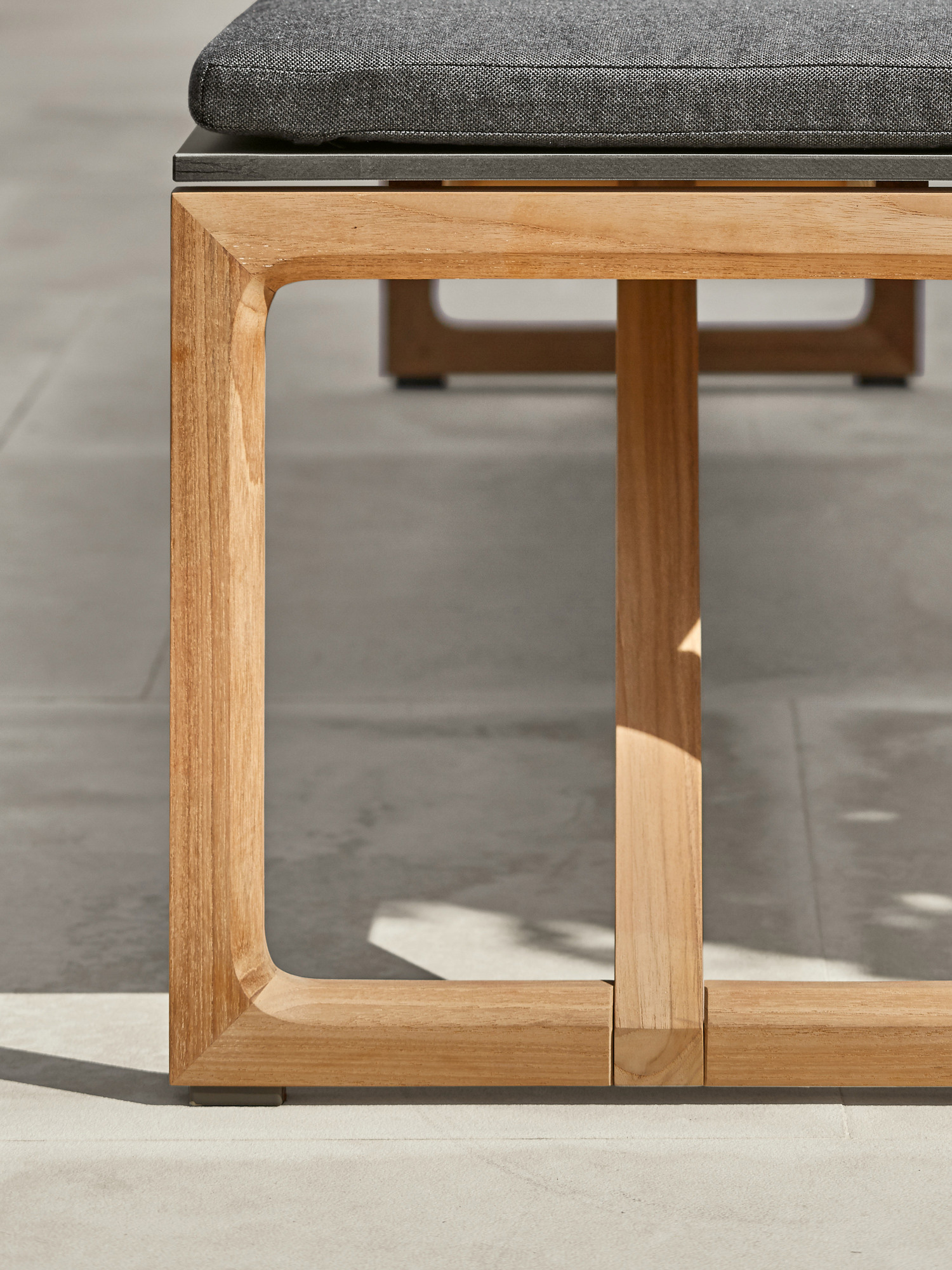 Die Bänke der Serie, mit oder ohne Lehne, gleichen in ihrer Konstruktion aus Teakholzrahmen und Kunstharzplatten dem Tisch. Nach geselligen Abenden oder bei Dauerregen können sie in voller Länge unter ihm verschwinden und bilden gemeinsam eine kompakte Quaderform. Die leicht strukturierten und ganz natürlich wirkenden grauen Oberflächen aus Kunstharz machen alles mit. Sie sind wetter- und UV-beständig und kinderleicht zu reinigen.