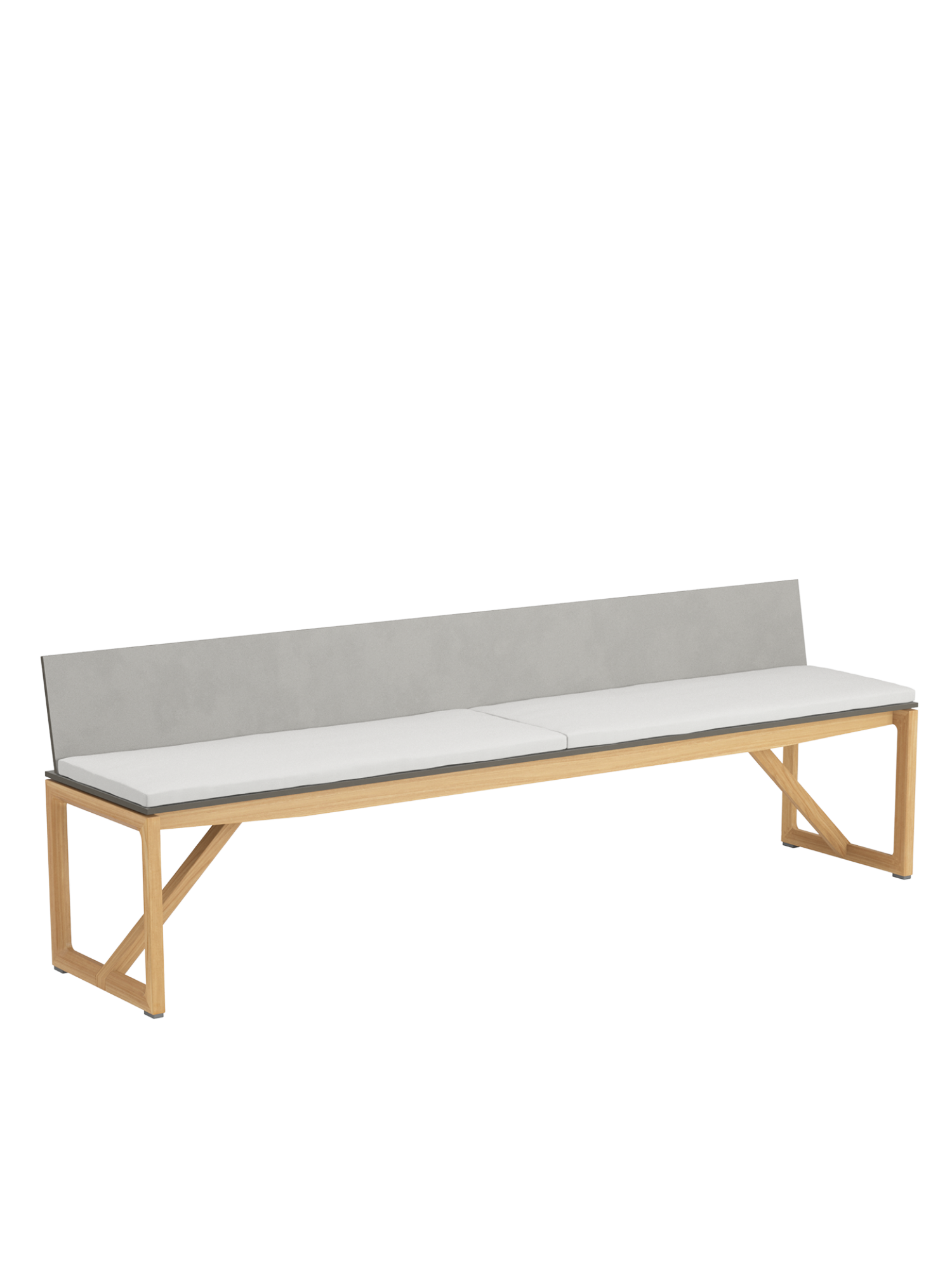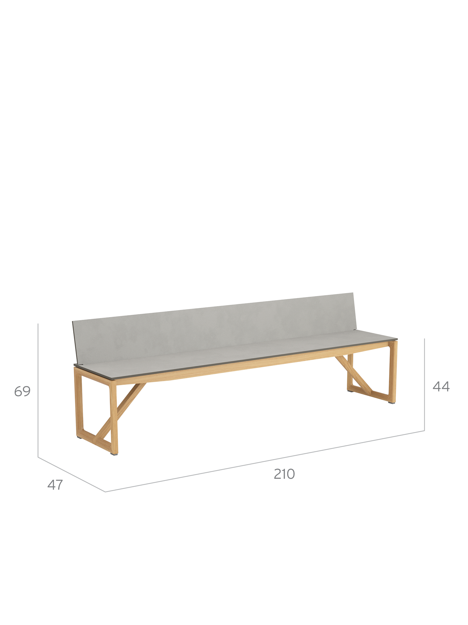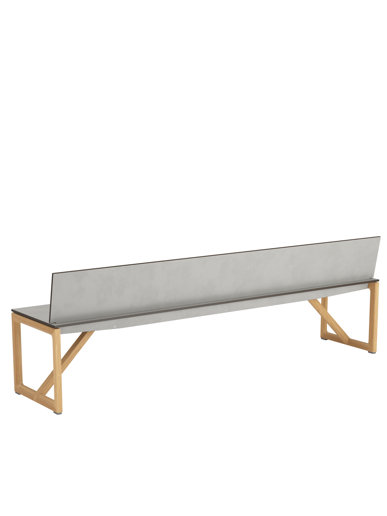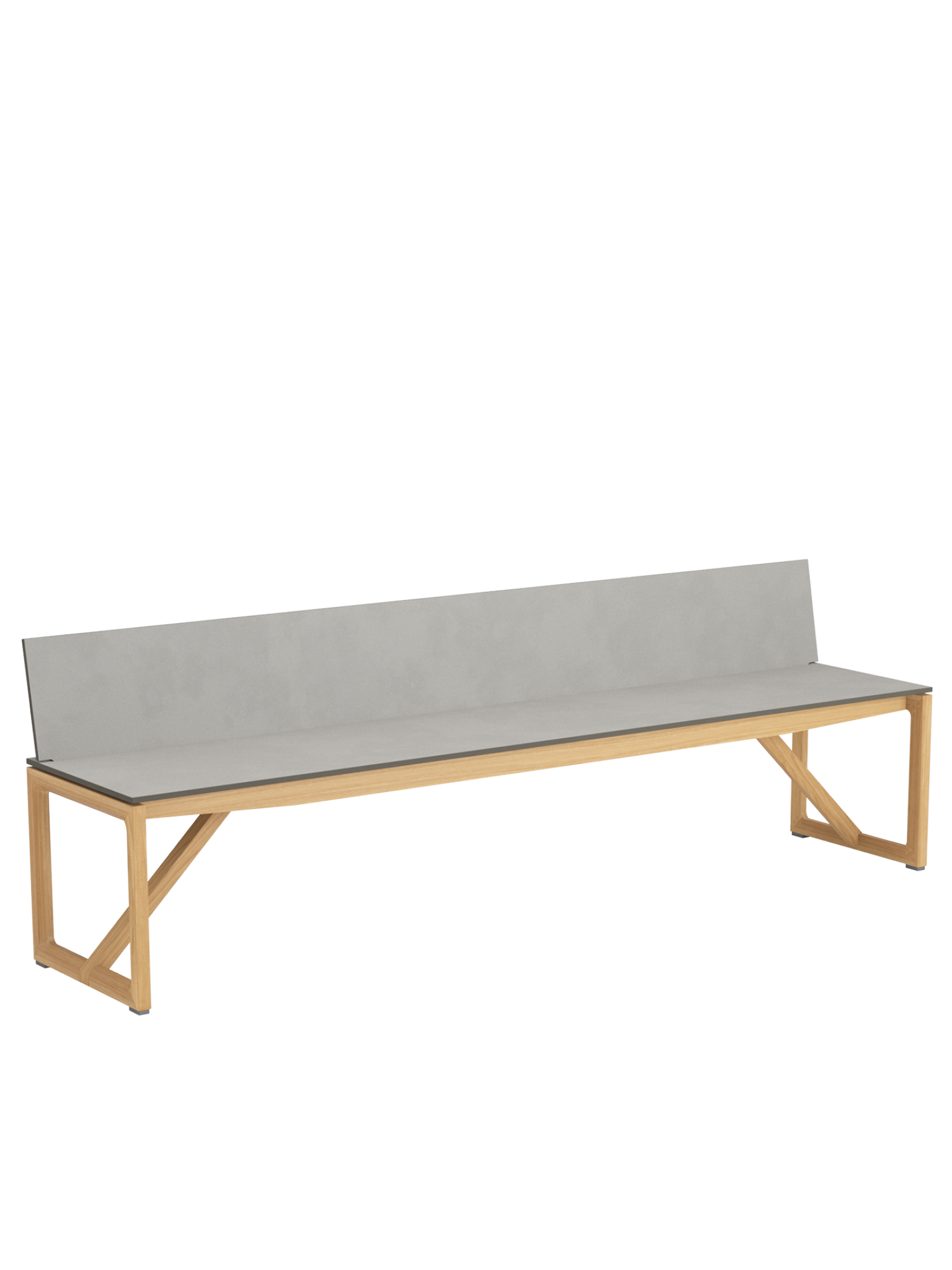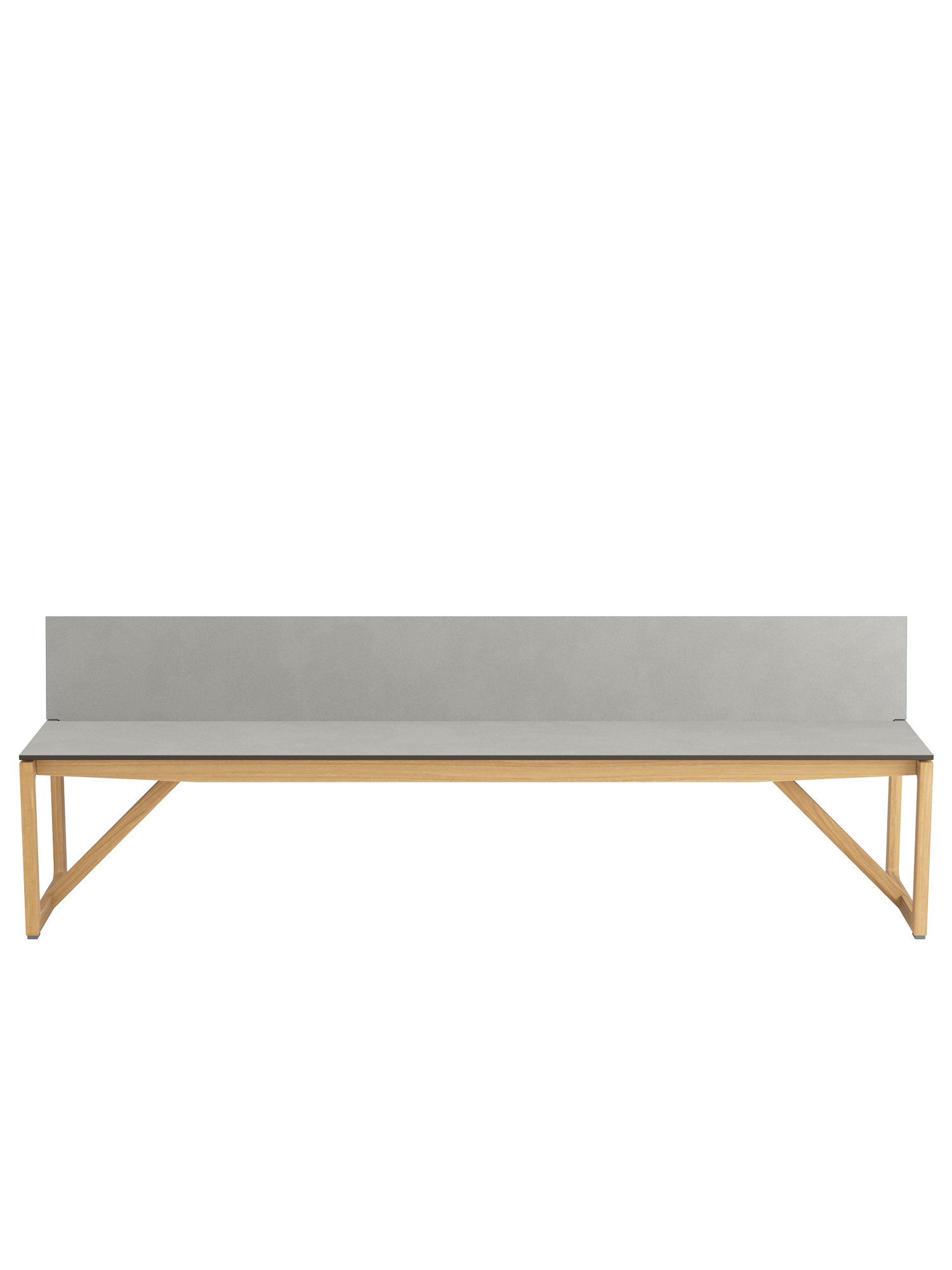 Die Bänke der Serie, mit oder ohne Lehne, gleichen in ihrer Konstruktion aus Teakholzrahmen und Kunstharzplatten dem Tisch. Nach geselligen Abenden oder bei Dauerregen können sie in voller Länge unter ihm verschwinden und bilden gemeinsam eine kompakte Quaderform. Die leicht strukturierten und ganz natürlich wirkenden grauen Oberflächen aus Kunstharz machen alles mit. Sie sind wetter- und UV-beständig und kinderleicht zu reinigen.