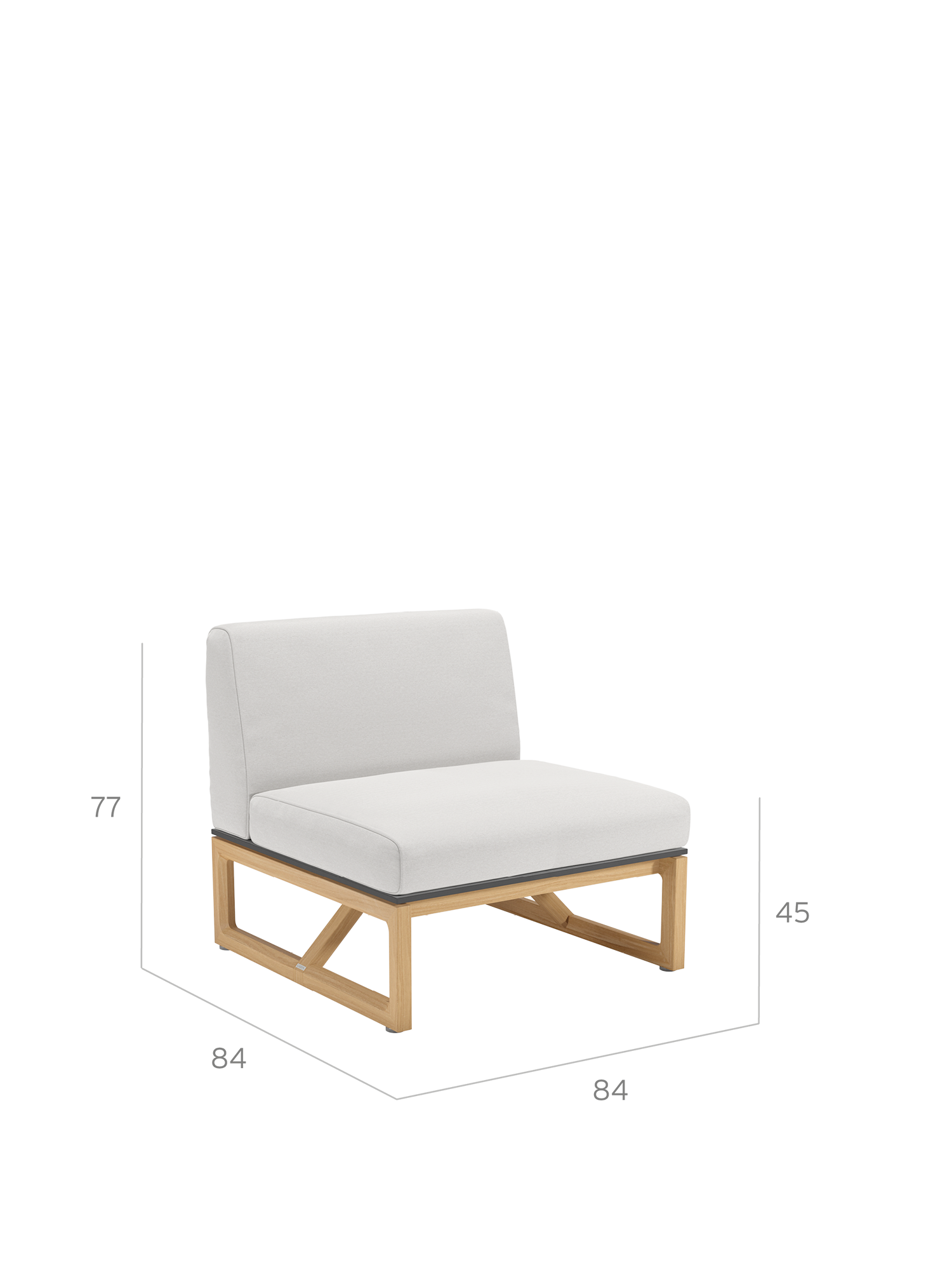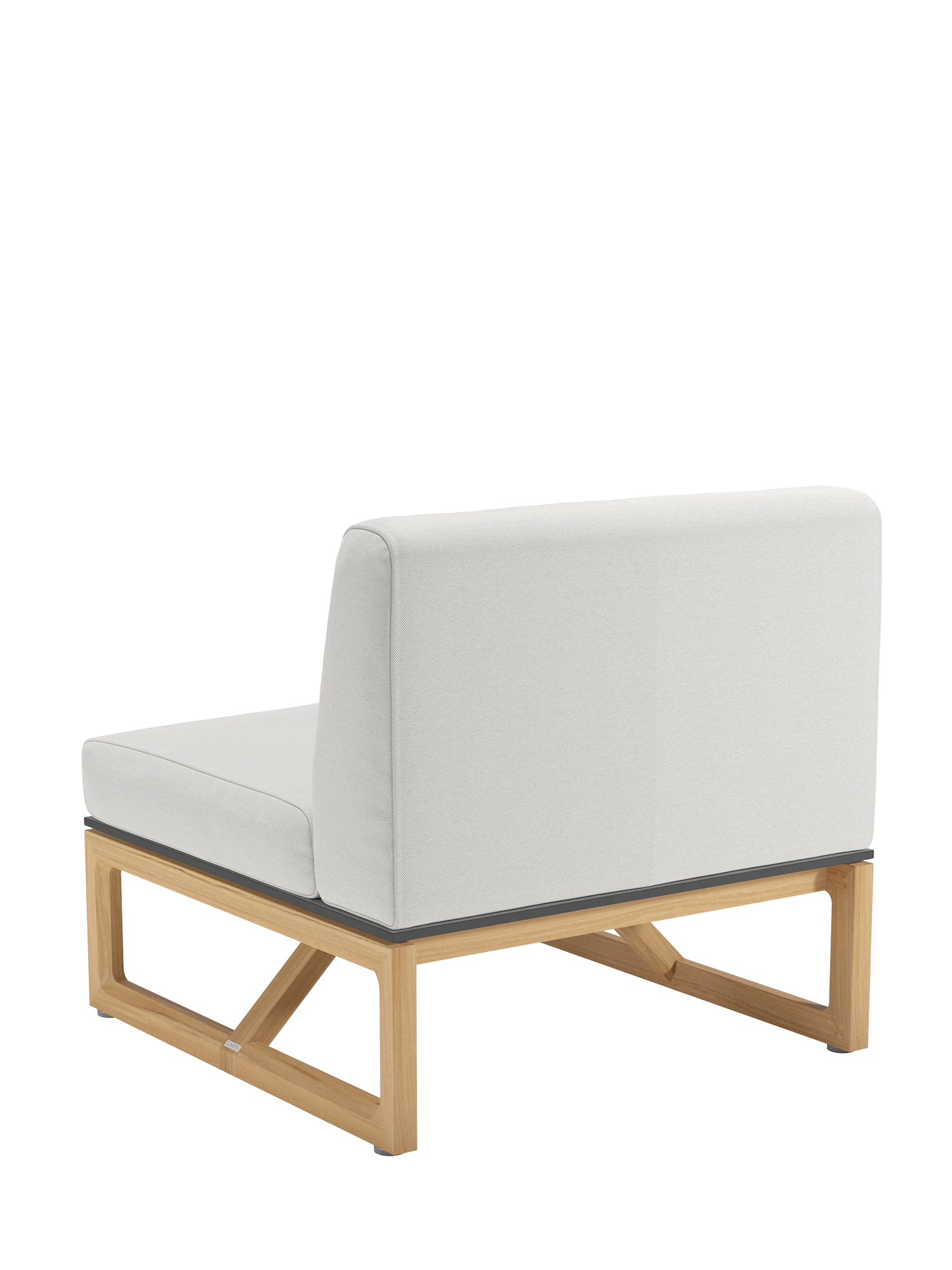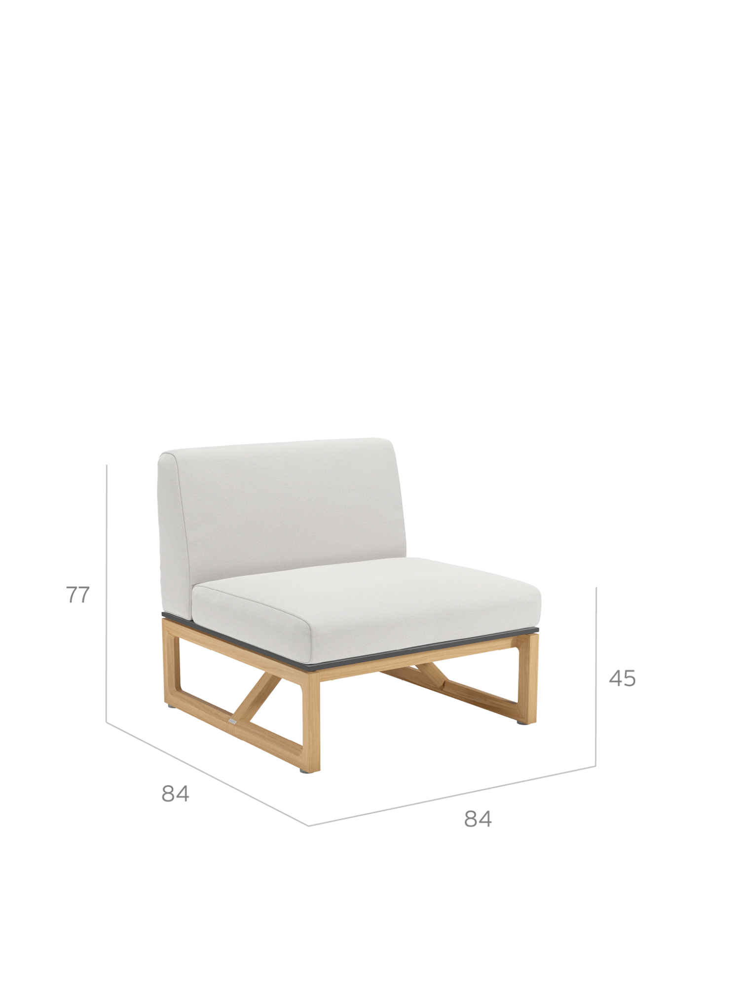 Ein markantes Teakgestell rahmt opulente Polster, die pure Behaglichkeit versprechen. Das flexible Element ohne Armlehnen eröffnet vielfältige Möglichkeiten und kann beliebig mit den anderen Polstermöbeln der Kollektion kombiniert werden. Das puristische Design verbindet das Mittelelement mit der Trey Sitzgruppe. Gemeinsam laden die zeitlosen Dining- und Loungemöbel zur ganzheitlichen Einrichtung von Gärten und Terrassen ein. Für Komfort, dem einfach nichts hinzuzufügen ist.