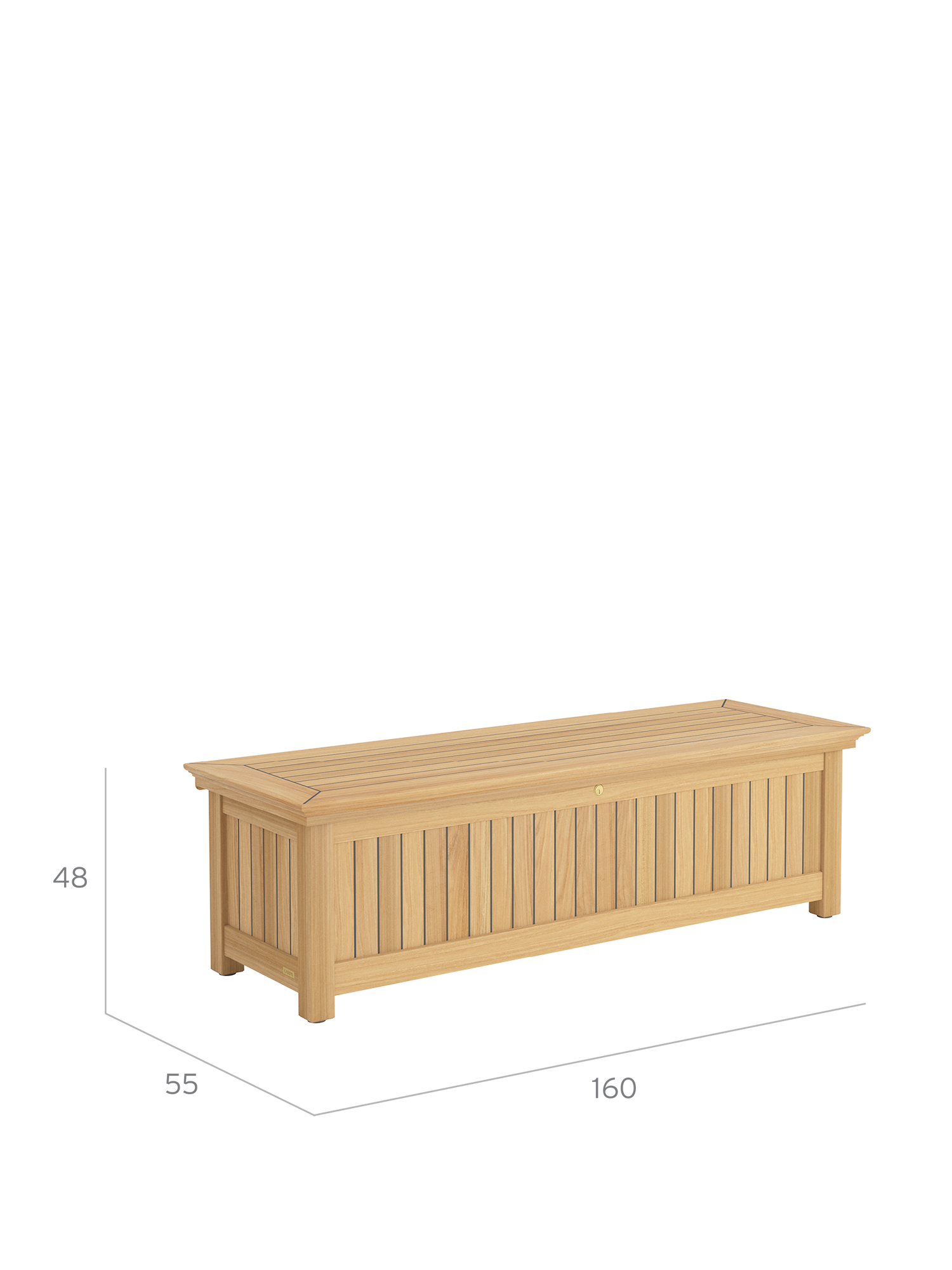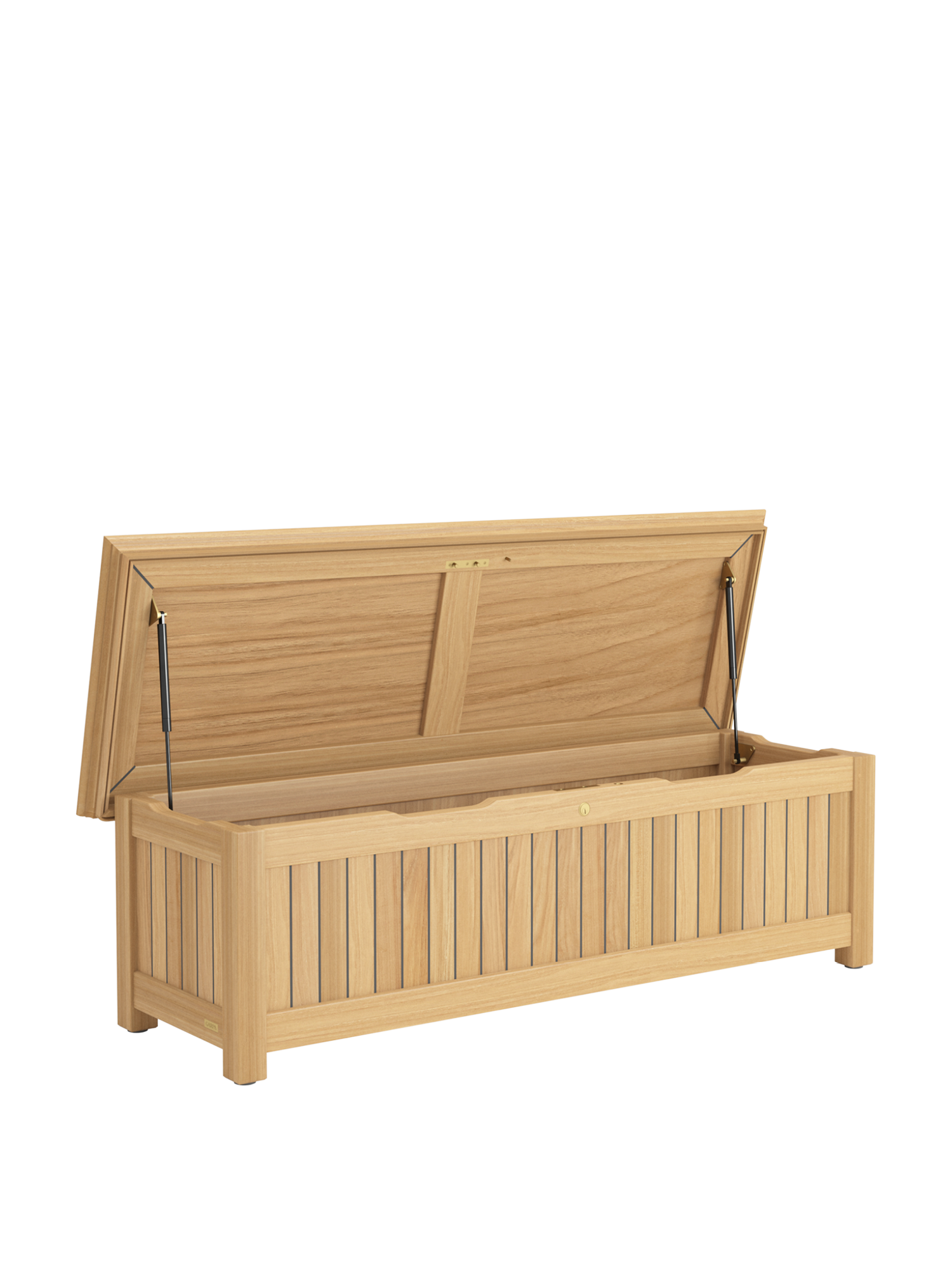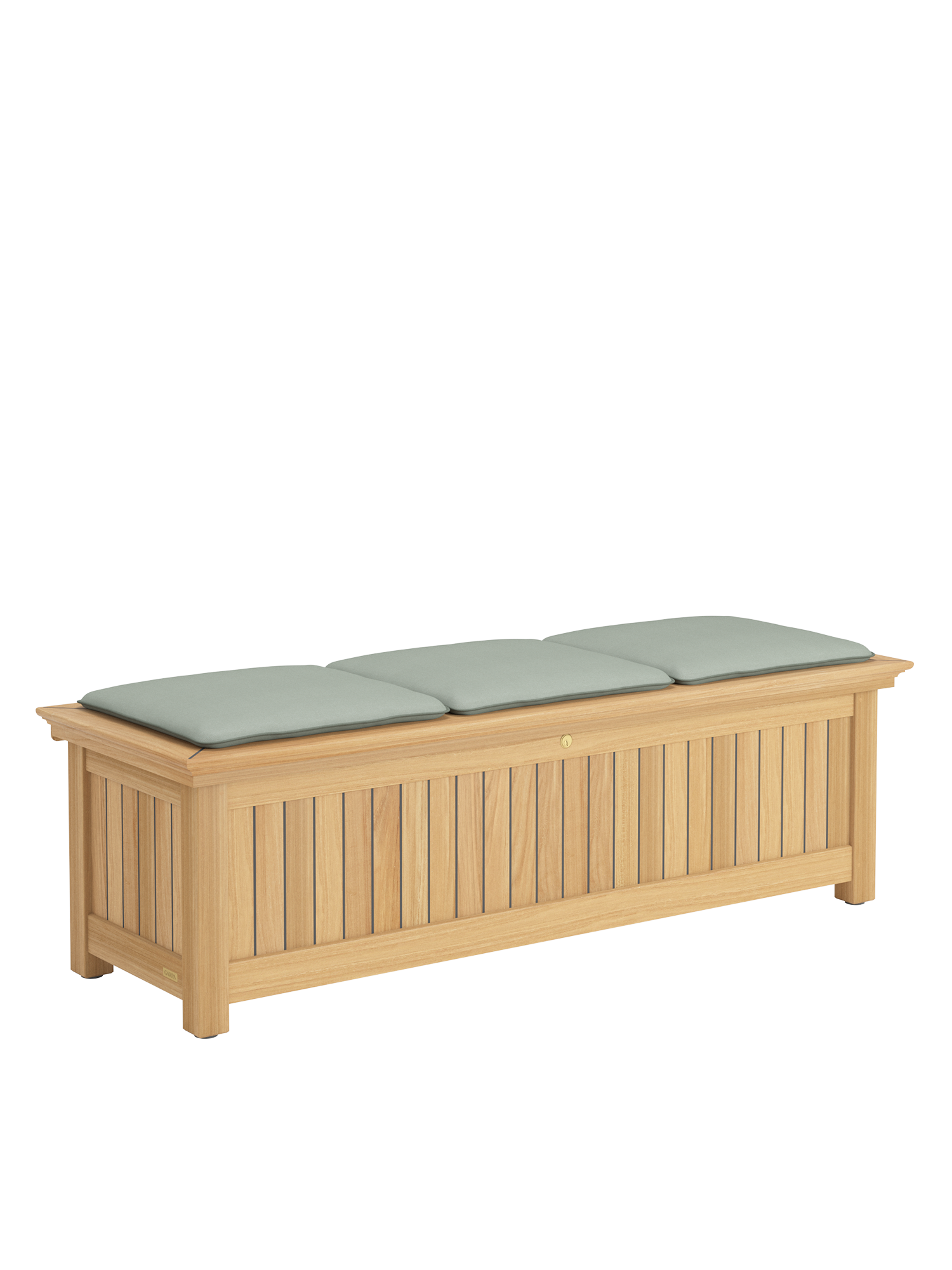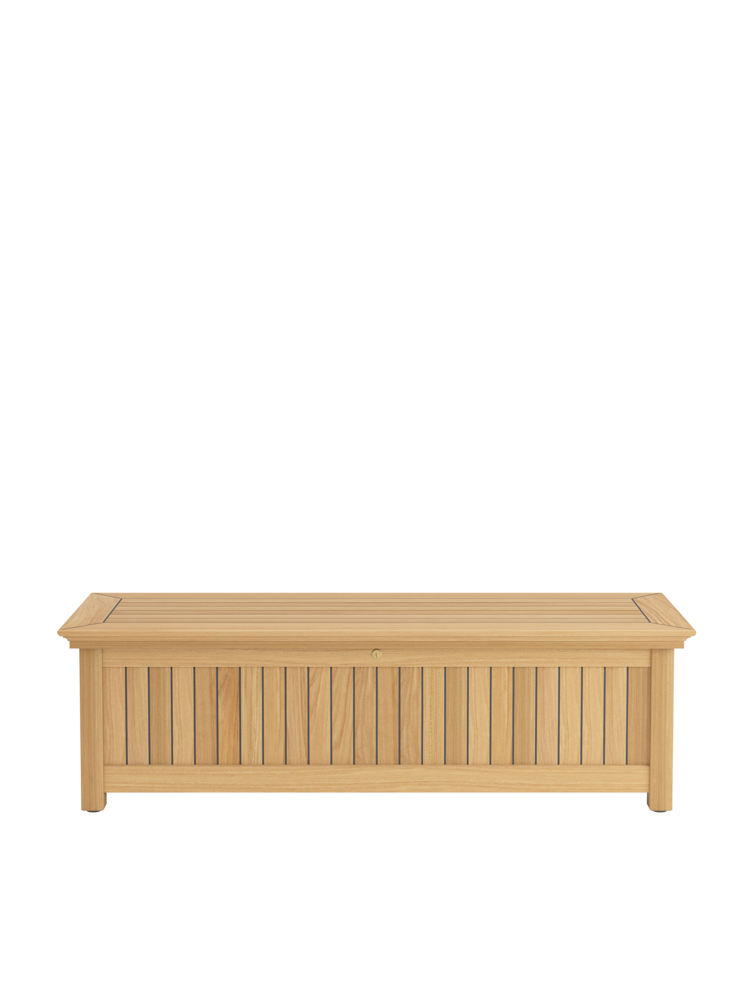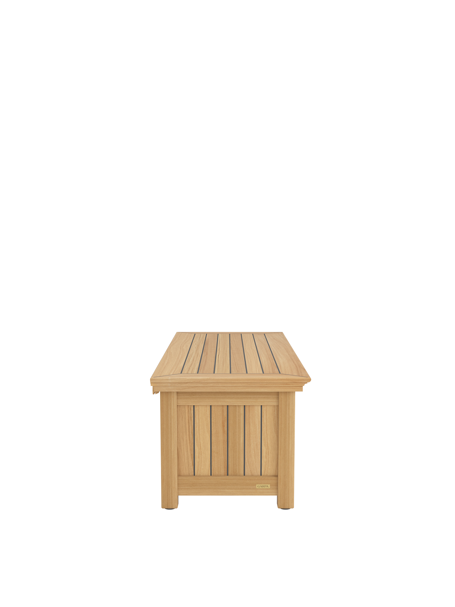 Die Kissentruhen für die Auflagen der Garpa Gartenmöbel zeigen sich perfekt in Form und Funktion. Alle konstruktiven Bauteile sind aus massivem Teak. Die Seiten und der Deckel bestehen aus wetterfestem Schichtholz, das mit 2,5 mm starkem Teak furniert und wie die Deckplanken von Hochseeyachten verfugt ist. Schloss und Scharniere sind aus hochwertigem Messing und Edelstahl.