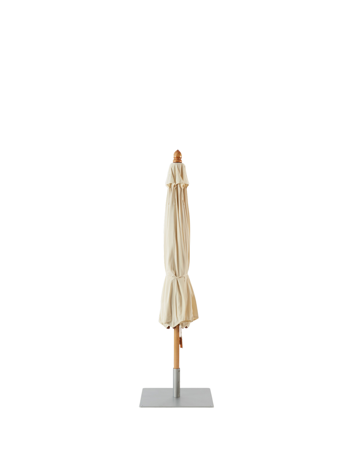 Mast, Sprossen und Schirmspitze des Sonnenschirms bestehen aus versiegeltem Hartholz, die Beschläge aus hochwertigem Messing. Die Bespannung aus Polyacryl ist mit braunen Lederkappen an den Schirmsprossen befestigt und lässt sich zur Reinigung einfach abziehen.