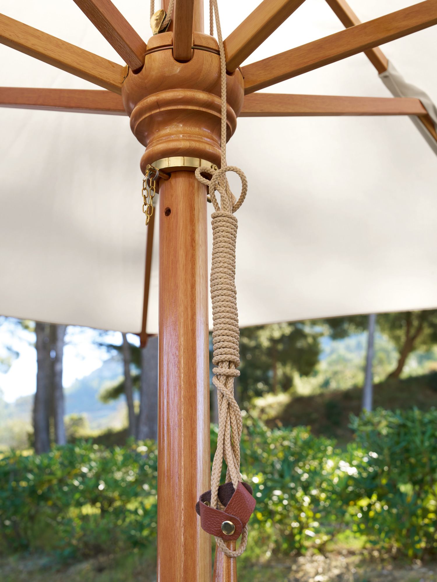 Mast, Sprossen und Schirmspitze bestehen aus versiegeltem Hartholz. Die Bespannung ist mit braunen Lederkappen an den Schirmsprossen befestigt und lässt sich zur Reinigung einfach abziehen.