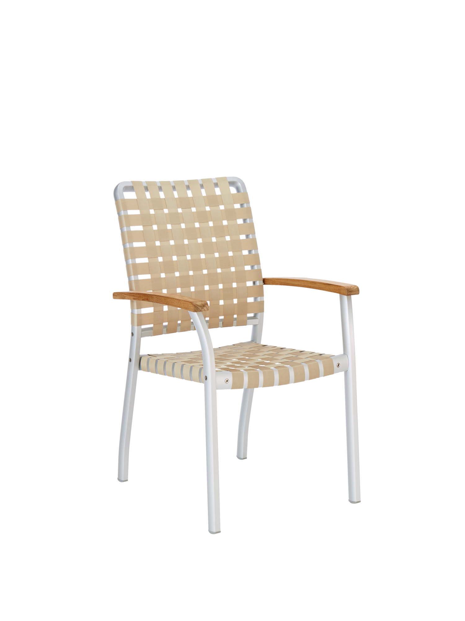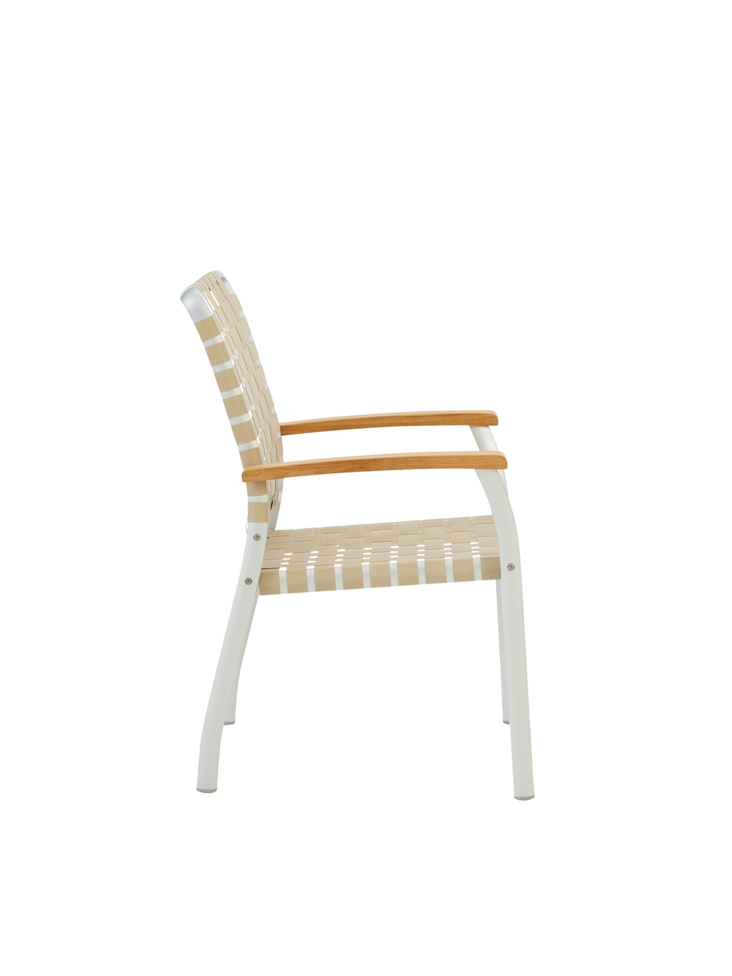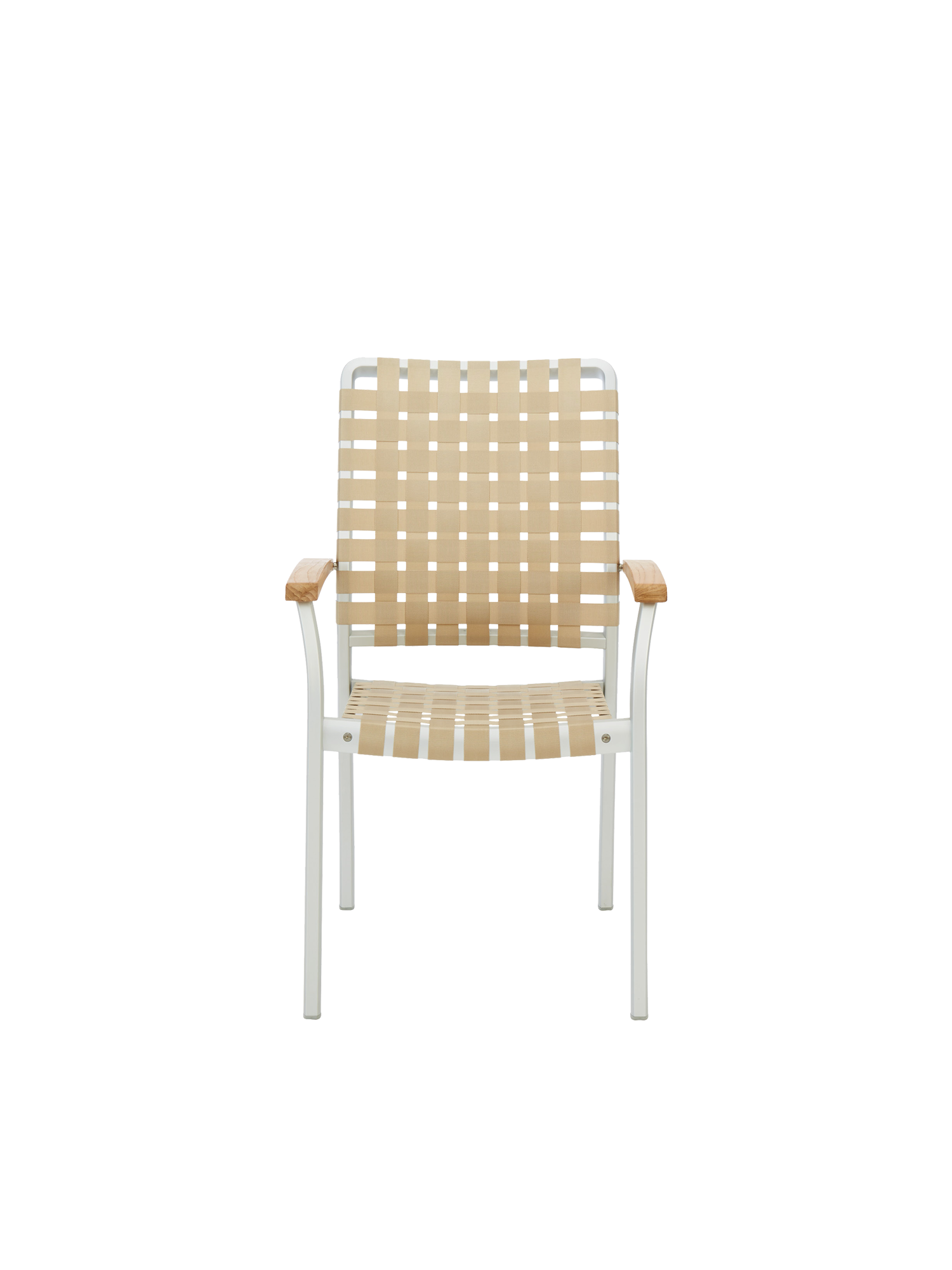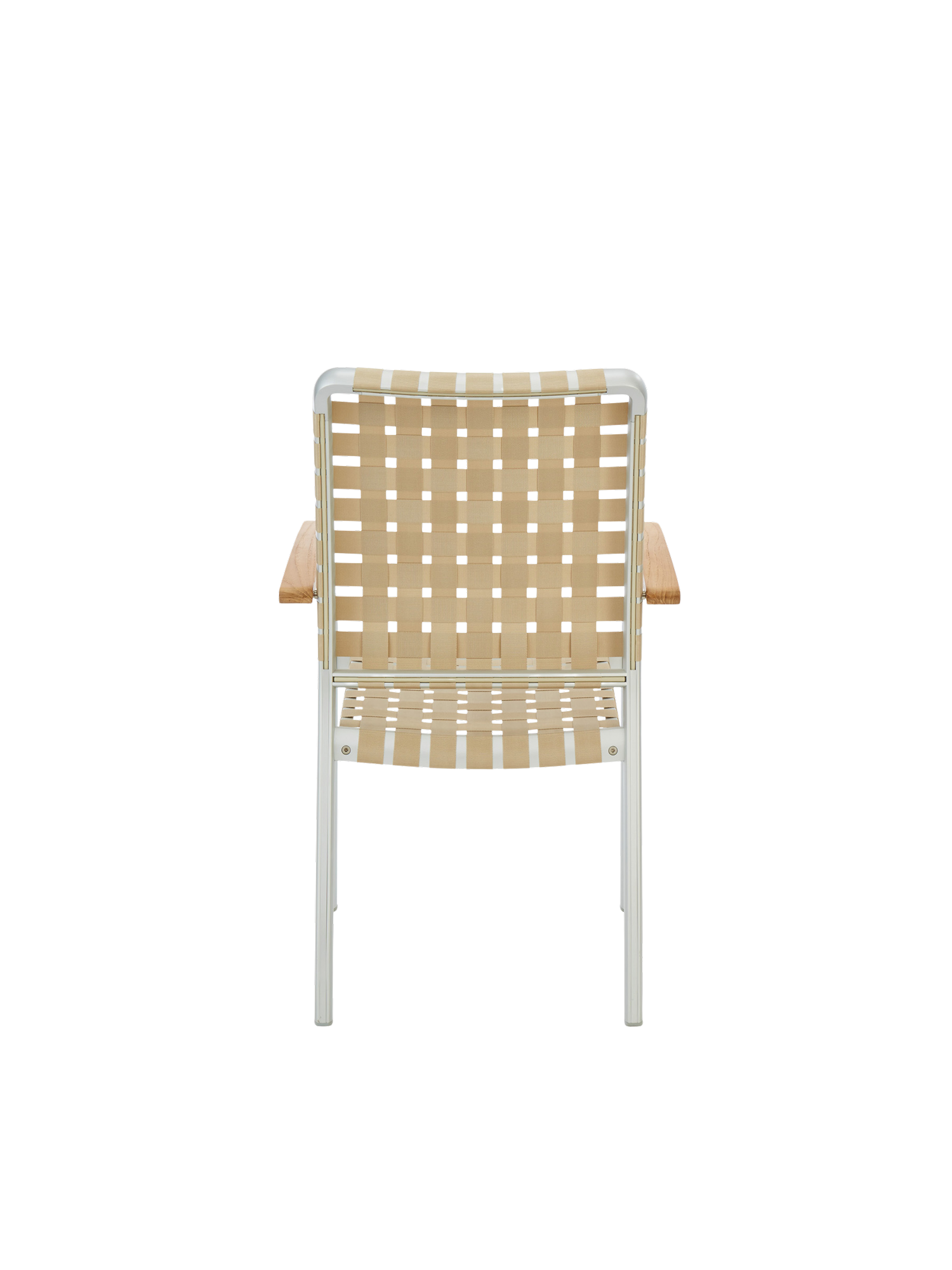 Die Armlehnstühle der Serie überzeugen durch ihre selbstverständliche Eleganz. Aufwändige Kedertechnik verbindet das Gurtgeflecht praktisch unsichtbar mit dem geschwungenen Rahmen aus eloxiertem Aluminium und gewährt angenehmen Halt und ergonomischen Komfort. Sanft gewölbte Armlehnen aus Teak schmeicheln den Händen.