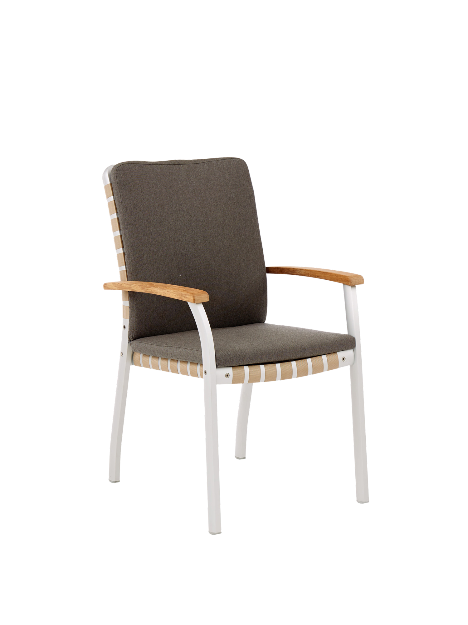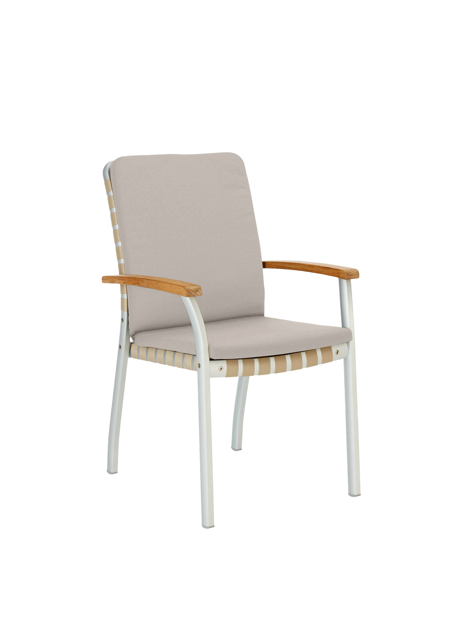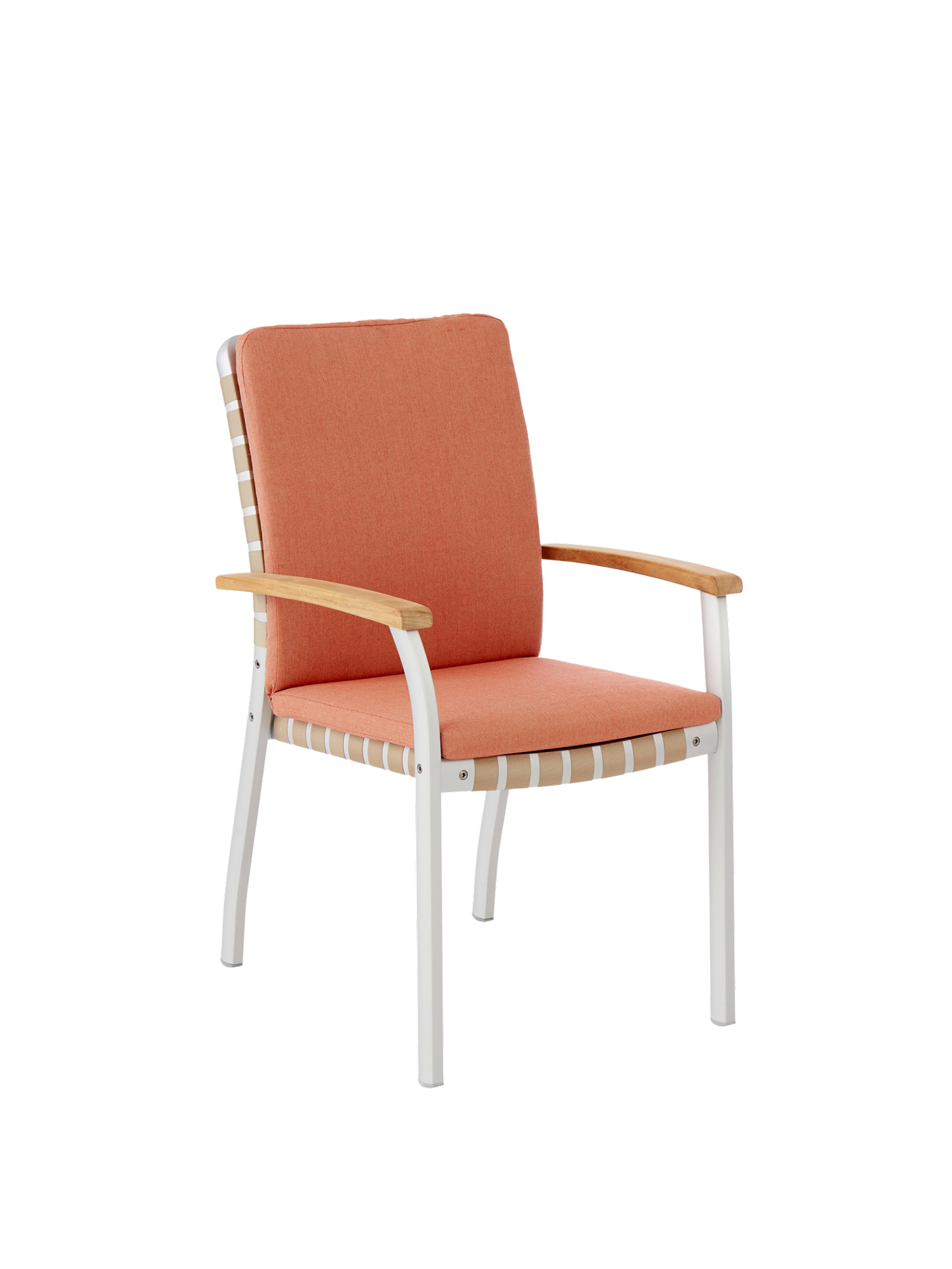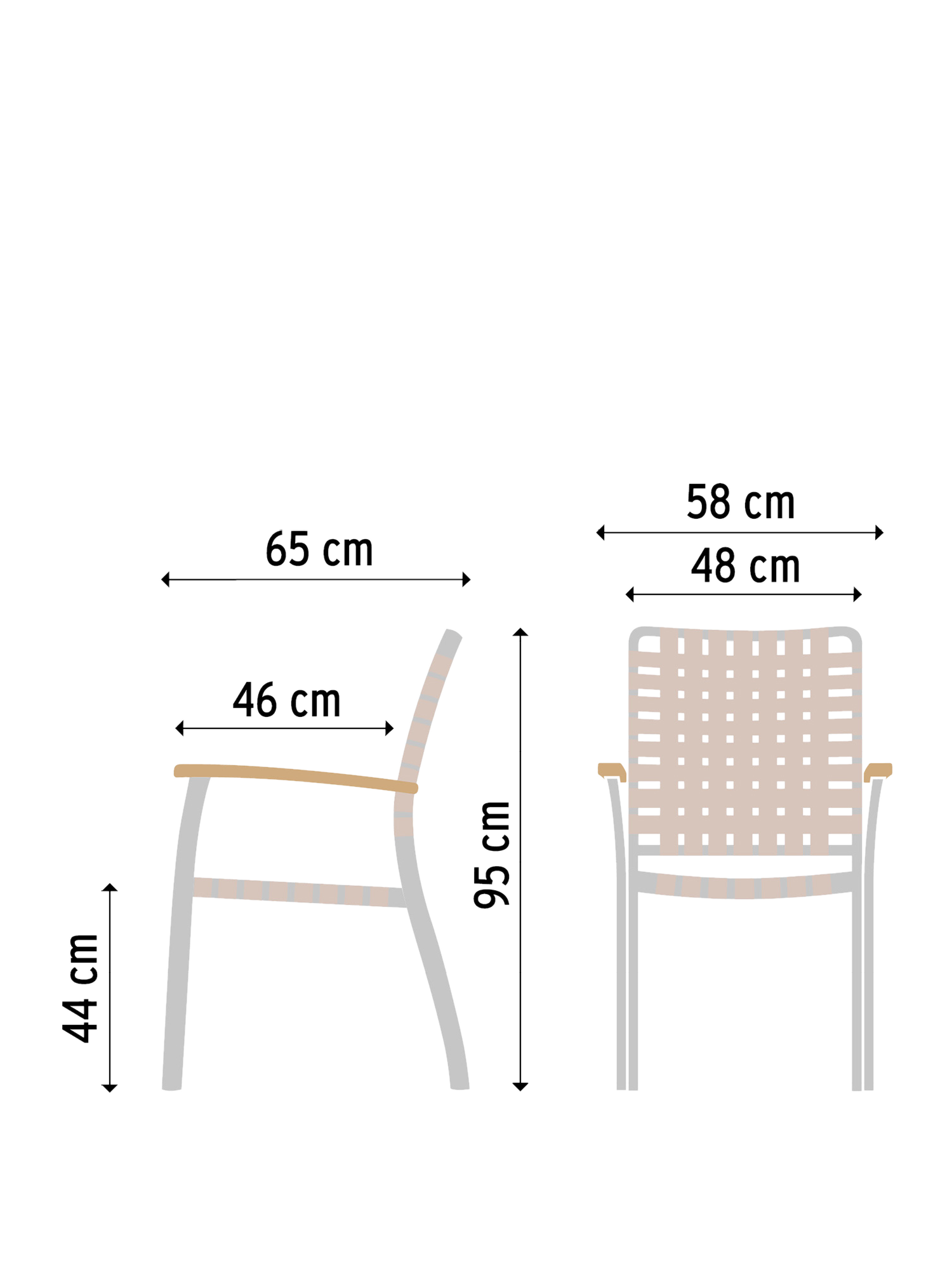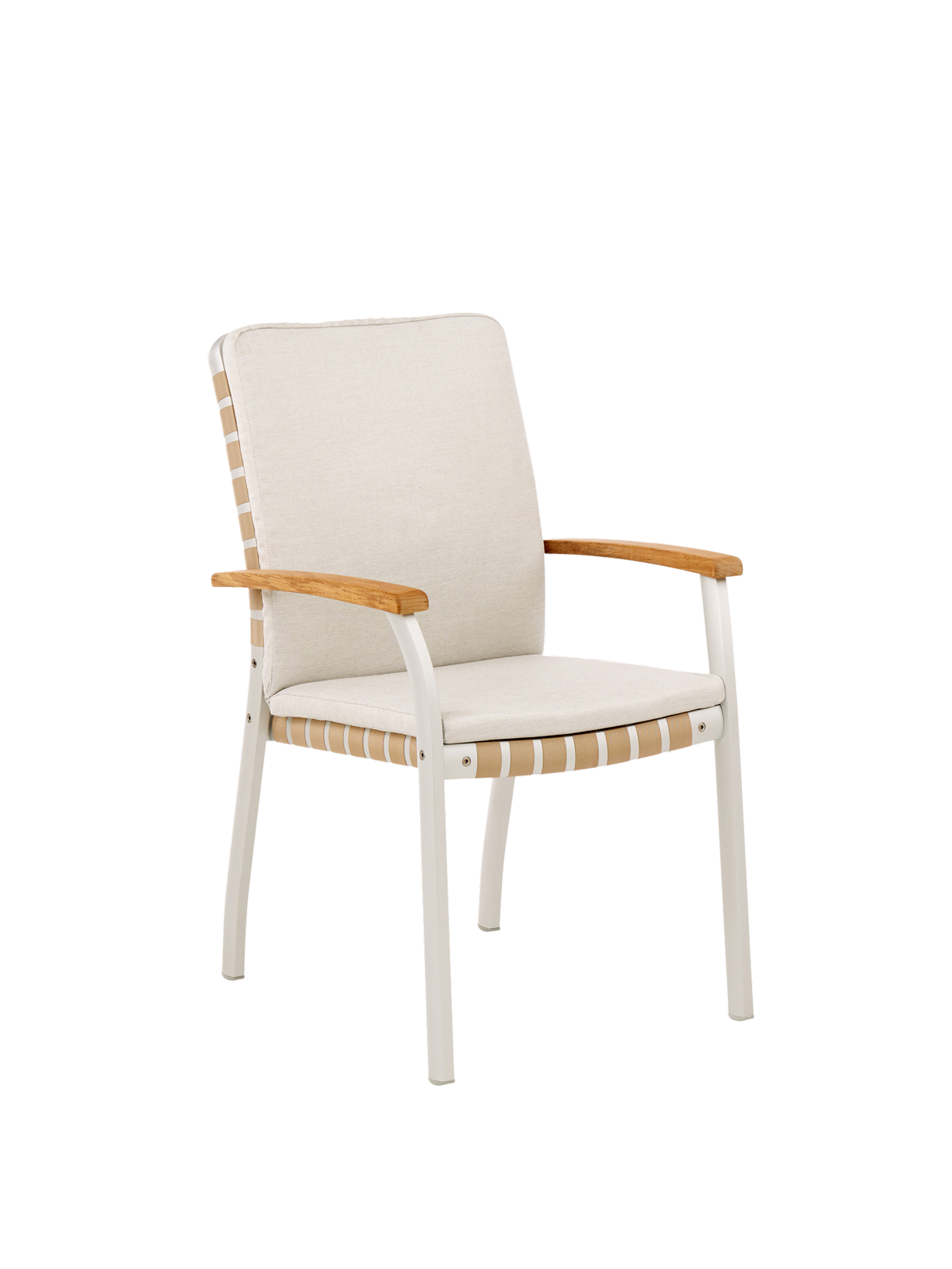 Die Armlehnstühle der Serie überzeugen durch ihre selbstverständliche Eleganz. Aufwändige Kedertechnik verbindet das Gurtgeflecht praktisch unsichtbar mit dem geschwungenen Rahmen aus eloxiertem Aluminium und gewährt angenehmen Halt und ergonomischen Komfort. Sanft gewölbte Armlehnen aus Teak schmeicheln den Händen.