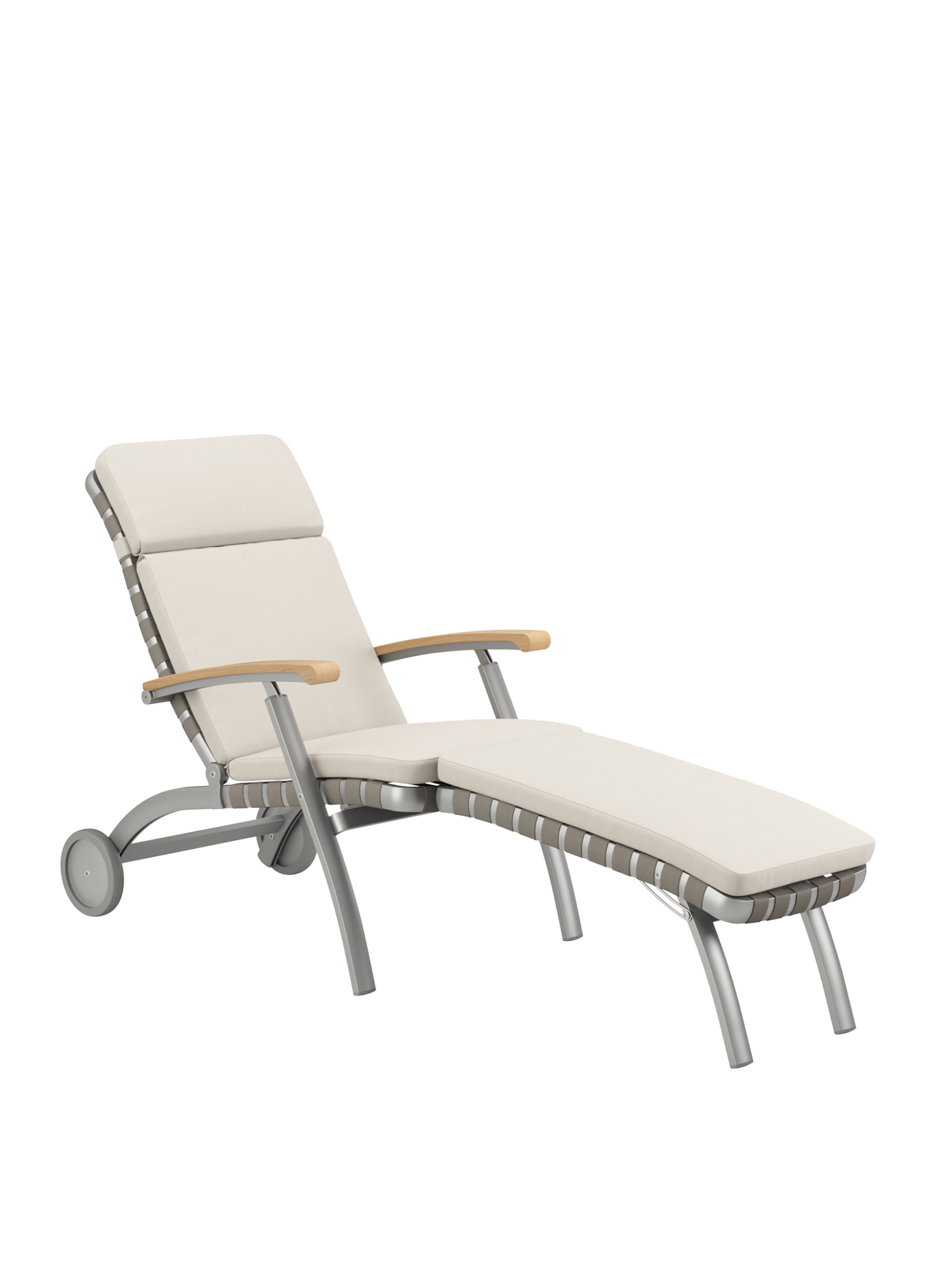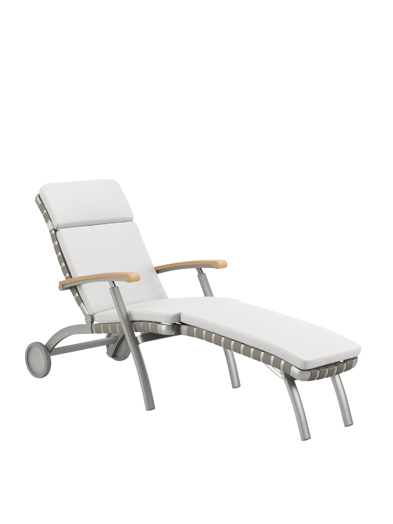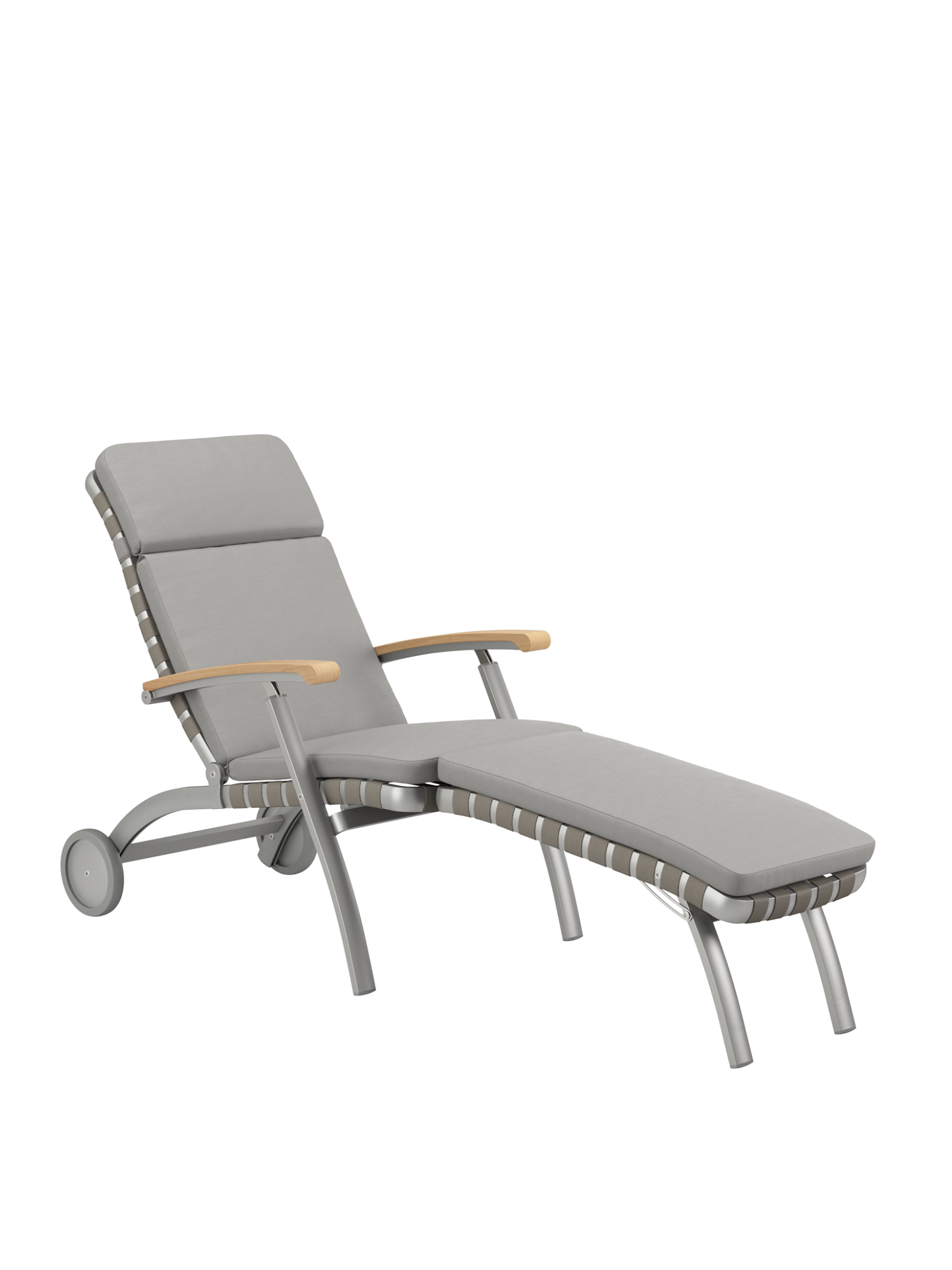 Der silbergrau pulverbeschichtete Aluminiumrahmen des Deck Chairs beschreibt einen eleganten Bogen. Aufwendige Kedertechnik verbindet Rahmen und Geflecht des individuellen Liegestuhls, gewährt angenehmen Halt und bietet ergononischen Komfort. Sanft gewölbte Armlehnen aus Teak schmeicheln den Händen. Mit seiner verlängerten Fußstütze empfiehlt sich der Deck Chair besonders für Menschen ab 1,80 m Körpergröße. Seine Rückenlehne lässt sich fünffach verstellen. Geliefert wird er mit einer bequemen Nackenrolle im Farbton Pearl.