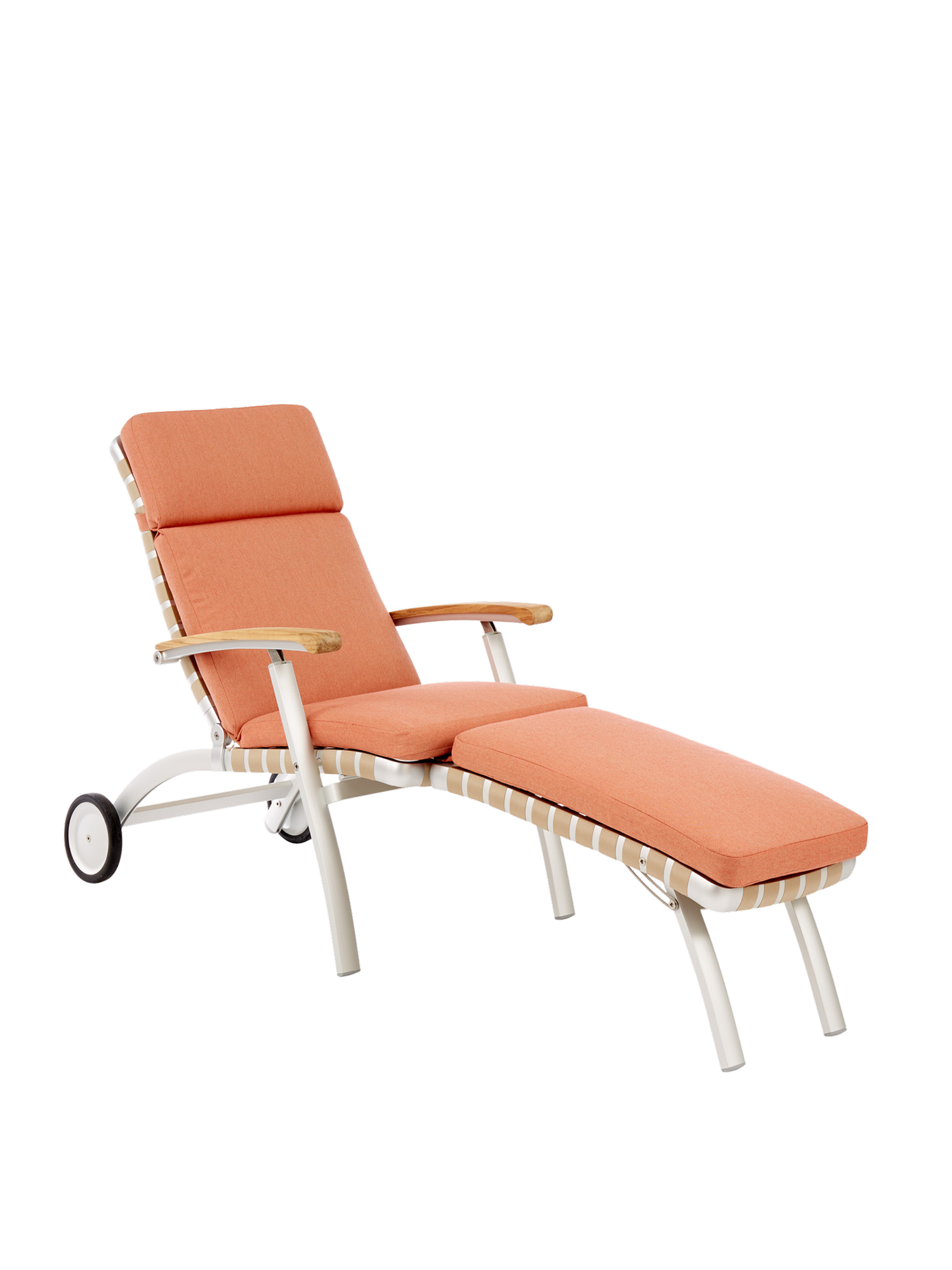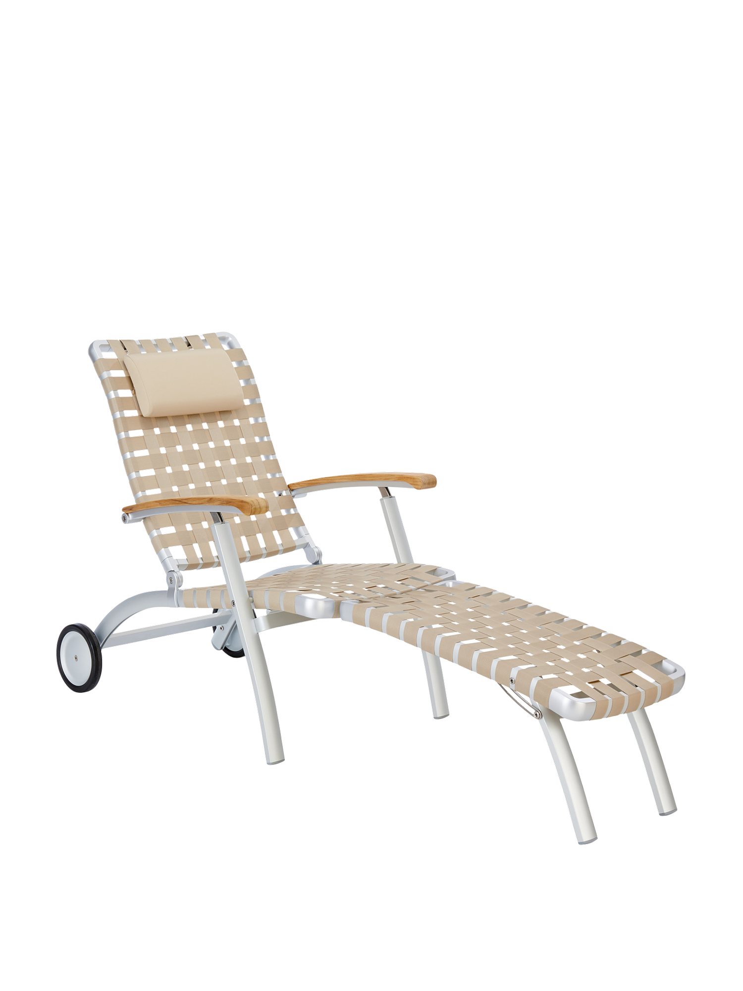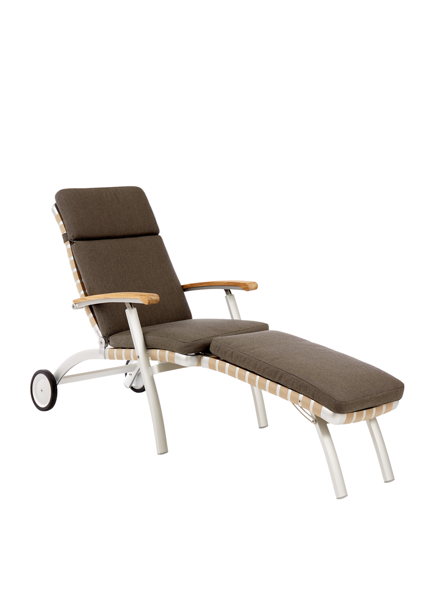Der silbergrau pulverbeschichtete Aluminiumrahmen des Deck Chairs beschreibt einen eleganten Bogen. Aufwendige Kedertechnik verbindet Rahmen und Geflecht des individuellen Liegestuhls, gewährt angenehmen Halt und bietet ergononischen Komfort. Sanft gewölbte Armlehnen aus Teak schmeicheln den Händen. Mit seiner verlängerten Fußstütze empfiehlt sich der Deck Chair besonders für Menschen ab 1,80 m Körpergröße. Seine Rückenlehne lässt sich fünffach verstellen. Geliefert wird er mit einer bequemen Nackenrolle im Farbton Pearl.