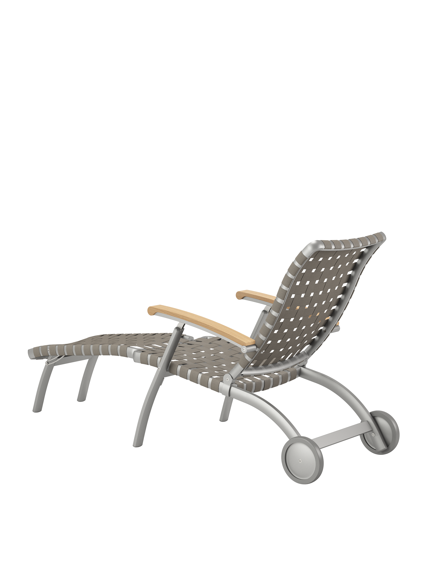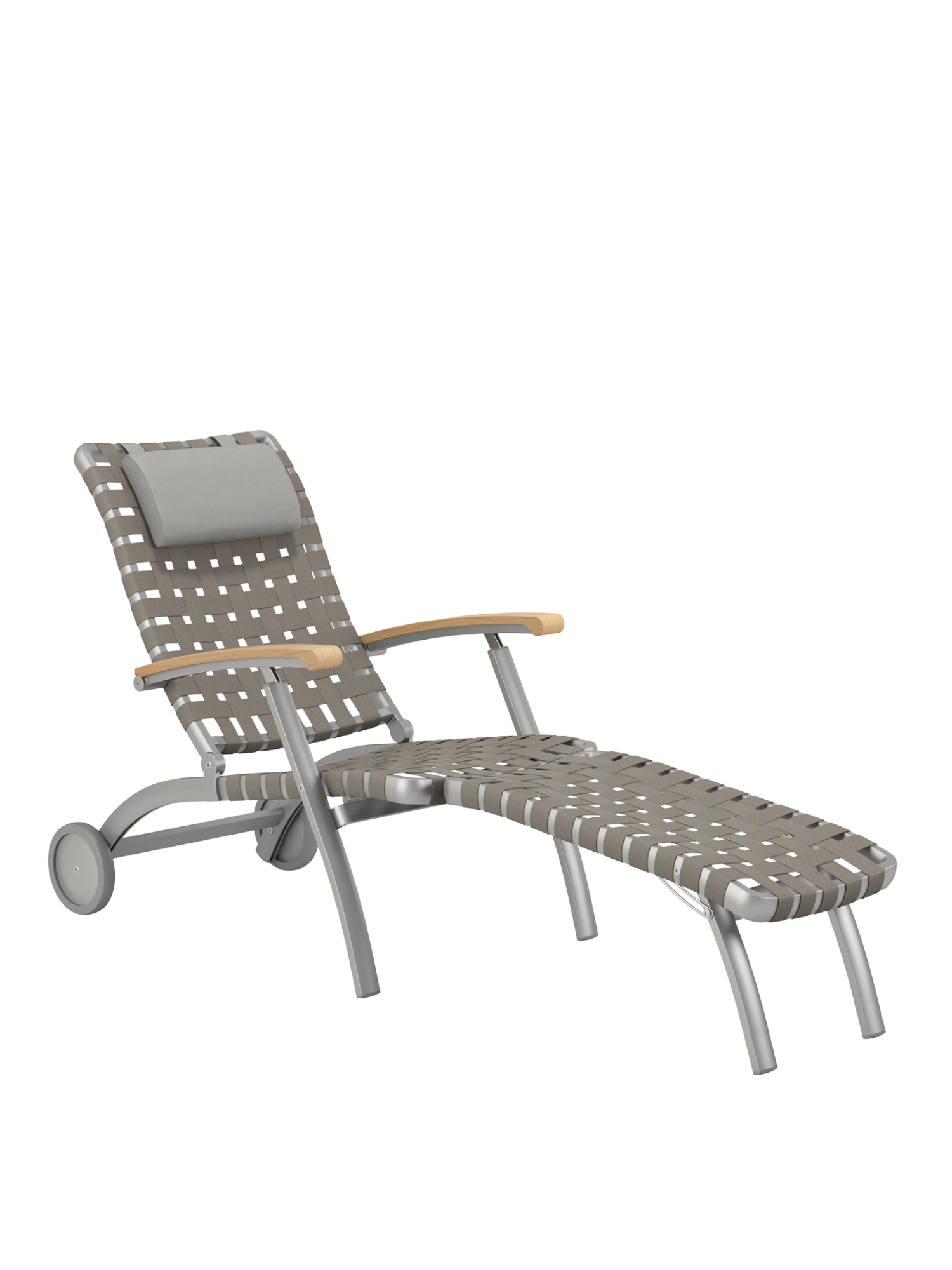 Die Neuauflage des klassischen Deck Chairs besteht aus einem seidig schimmernden, eloxierten Aluminiumrahmen in Kombination mit einem farblich korrespondierenden Gurtgeflecht. Aufwendige Kedertechnik verbindet Rahmen und Geflecht des individuellen Liegestuhls, gewährt angenehmen Halt und bietet ergonomischen Komfort. Sanft gewölbte Armlehnen aus Teak schmeicheln den Händen. Mit seiner verlängerten Fußstütze empfiehlt sich der Deck Chair besonders für Menschen ab 1,80 Meter Körpergröße. Seine Rückenlehne lässt sich fünffach verstellen. Geliefert wird er mit einer bequemen Nackenrolle im Farbton Stone.