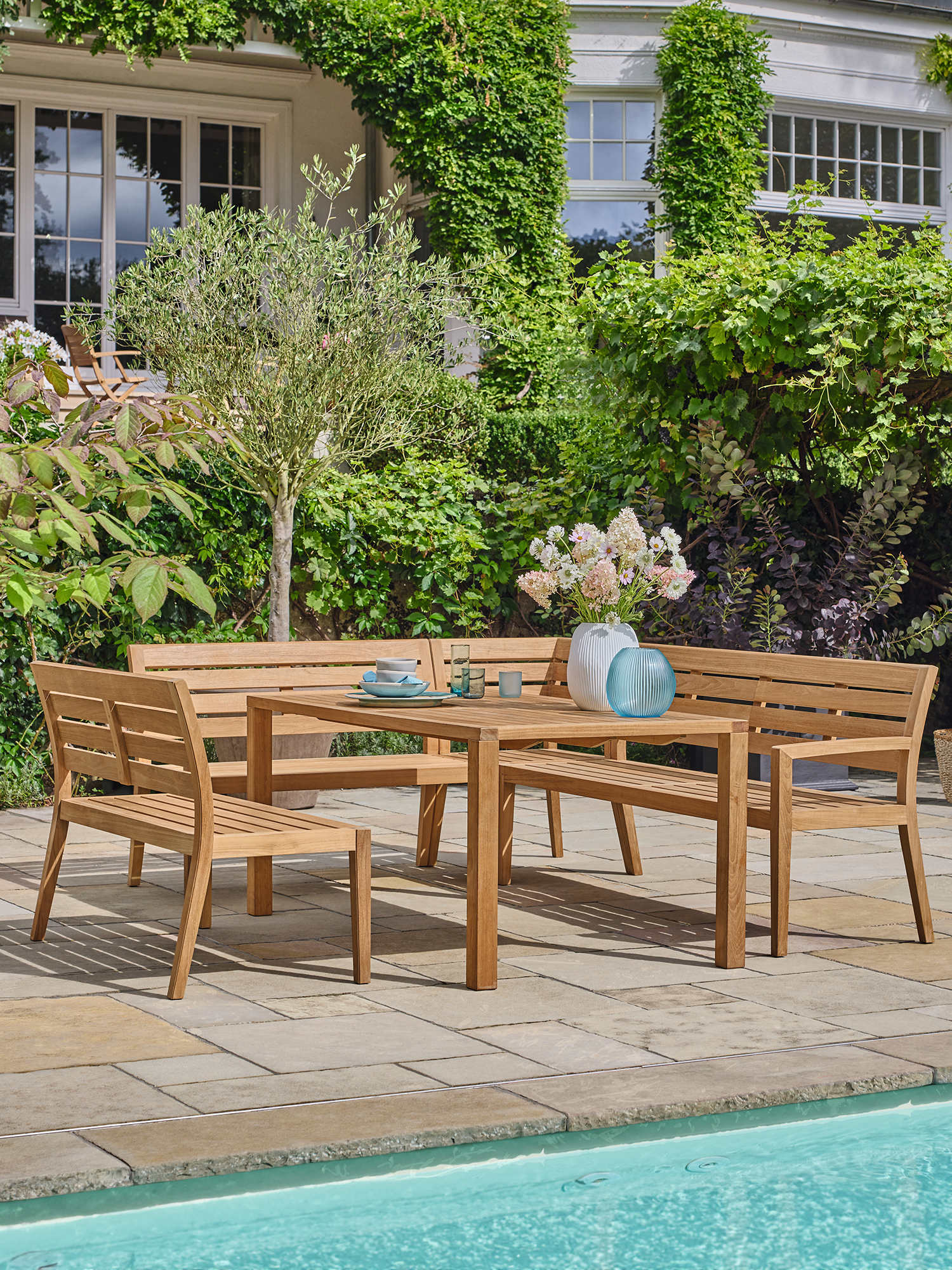 Als verbindendes Element im Valencia Eckmodul oder als Solitär – die Valencia Bank ohne Armlehnen lädt ein, Platz zu nehmen. Bei der klassischen Nutzung als Gartenbank verspricht sie behagliche Ruhepausen im Freien. Als Bestandteil des modularen Systems weckt sie beste Erinnerungen an frühere Zeiten. Die Valencia Eckbank aus hochwertigem Teakholz versammelt lebendige Runden um passende Tische – und sorgt so dafür, dass neue Erinnerungen geschrieben werden.