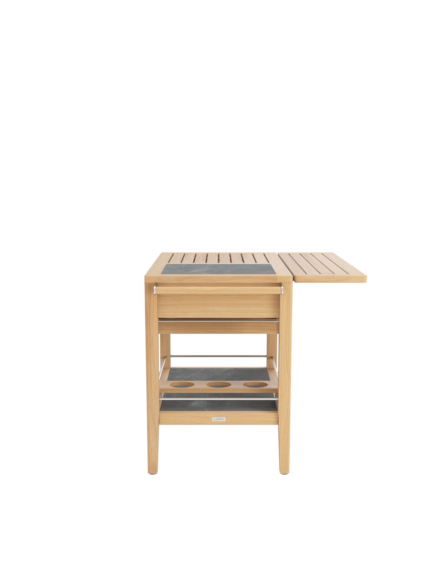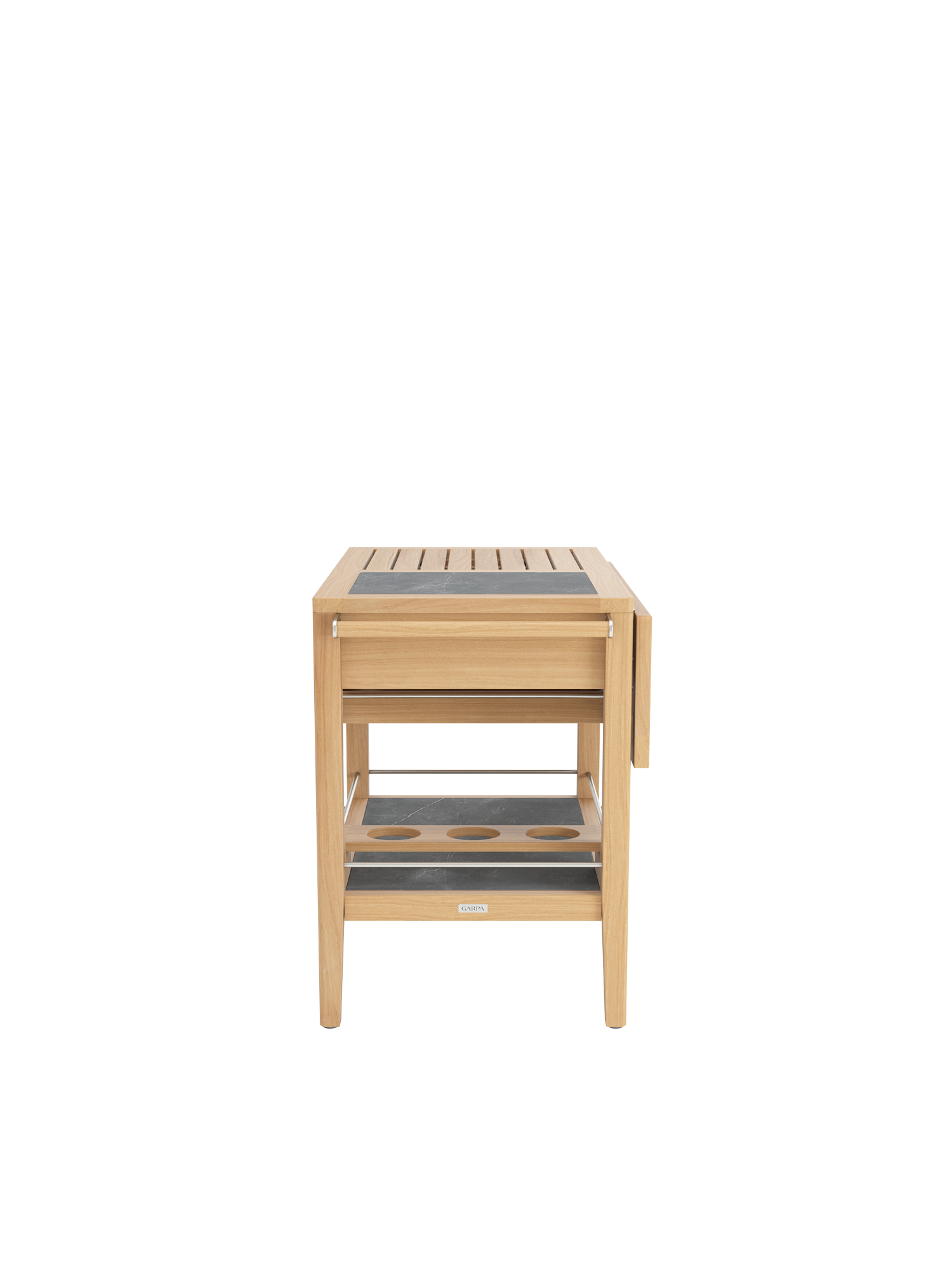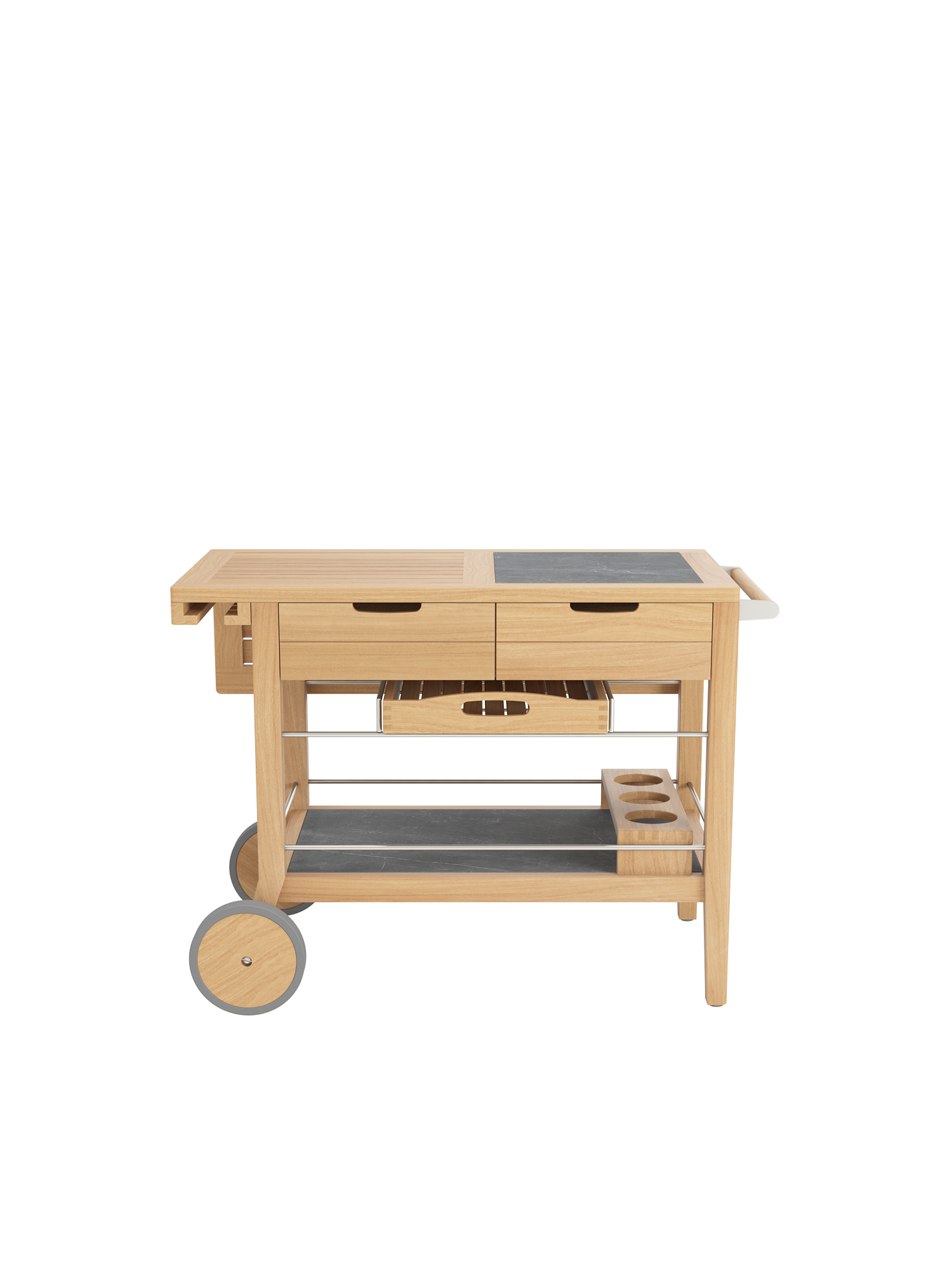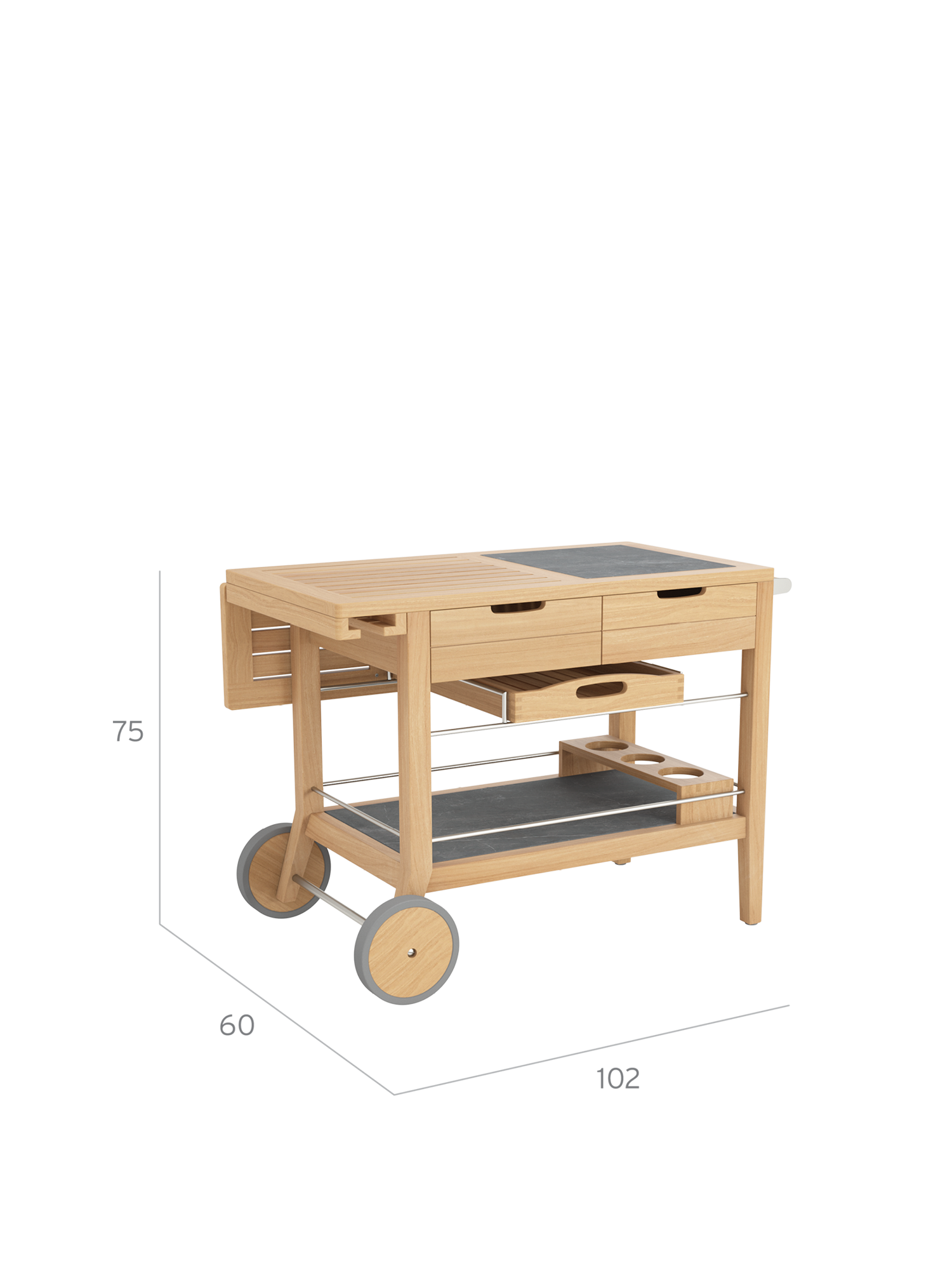 Ein flexibles Multitalent für zwanglose Gartenfeste und lange Sommerabende: Im geradlinigen Design aus wetterfesten Materialien bietet der moderne Barwagen eine überzeugende Vielfalt von Funktionen. Seine großzügige Arbeitsfläche aus Teakleisten lässt sich mit einem abklappbaren Element noch erweitern. Ein Einlegeboden aus frostfester, grauer Keramik dient als Schneidebrett und bildet einen feinen Kontrast zum warmen Farbton des Holzes. Zwei große Schubladen (Höhe je 7 cm) mit Böden aus Teakleisten bieten Stauraum für Servietten und Barutensilien. Ein herausnehmbares Teaktablett lässt sich auf der darunterliegenden Reling verschieben.