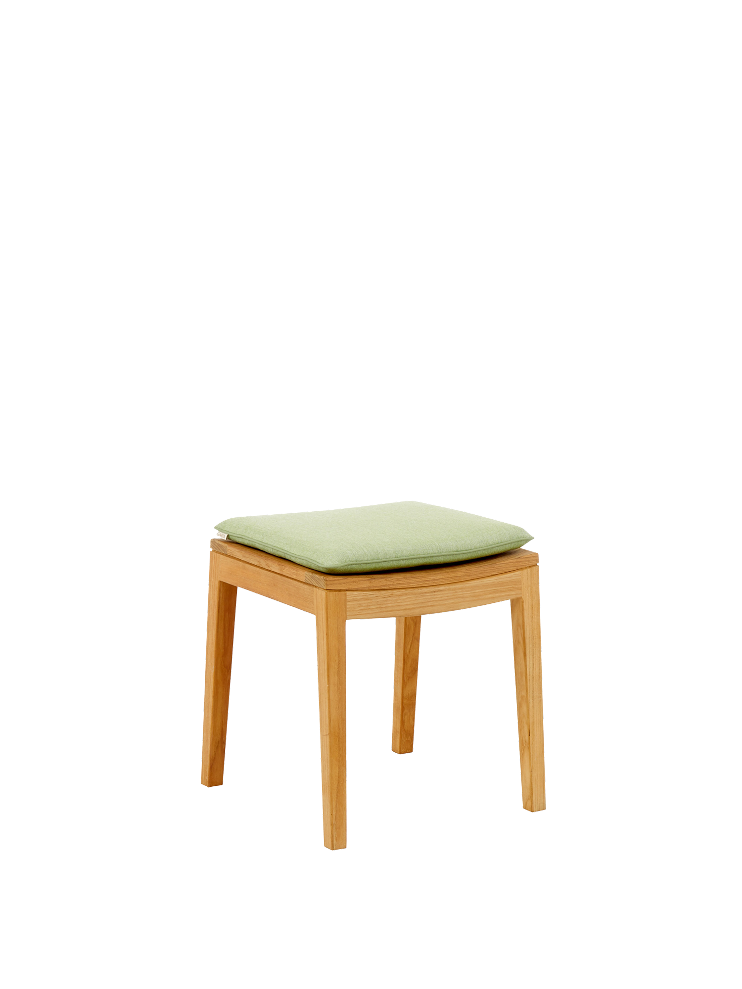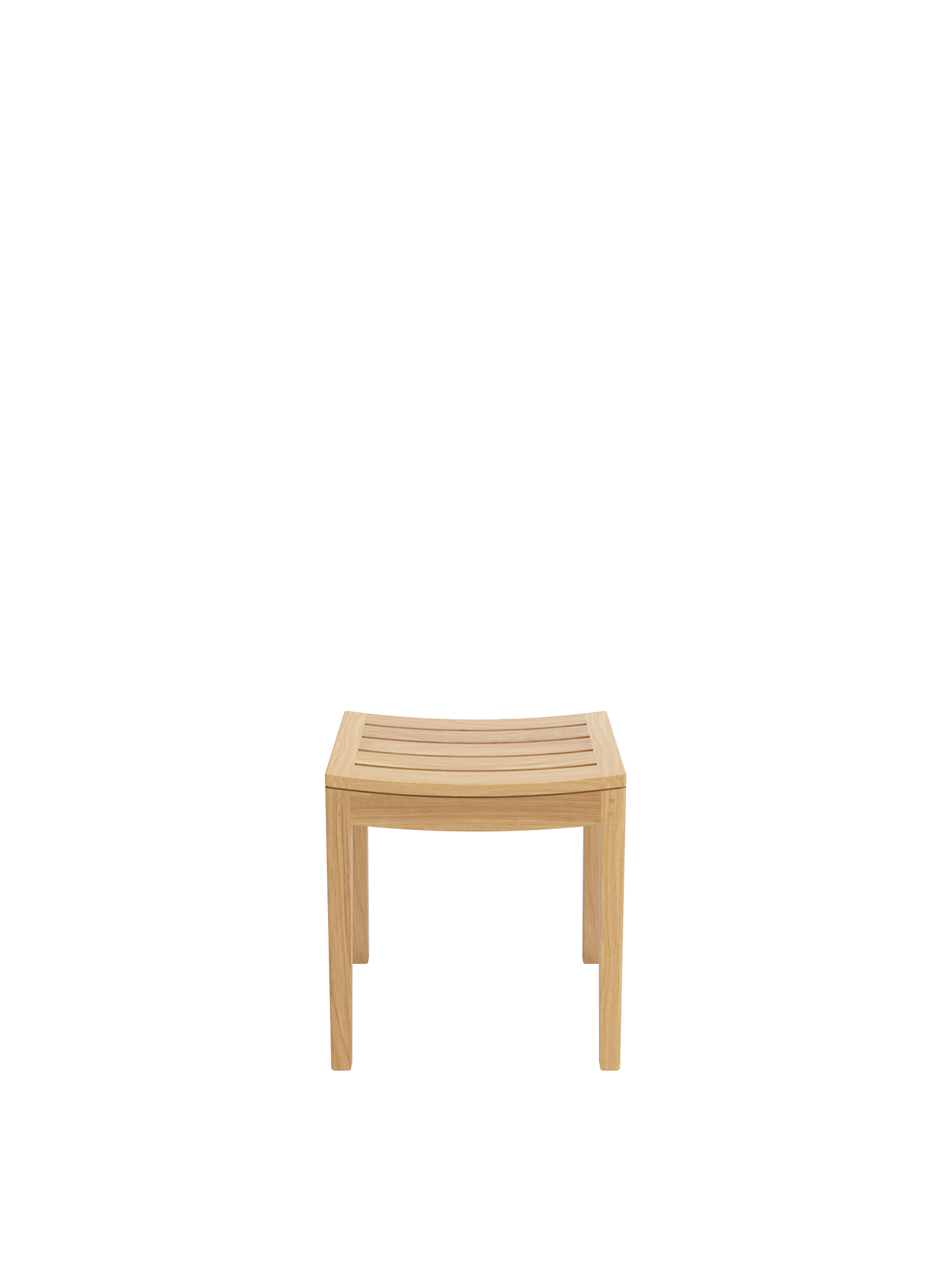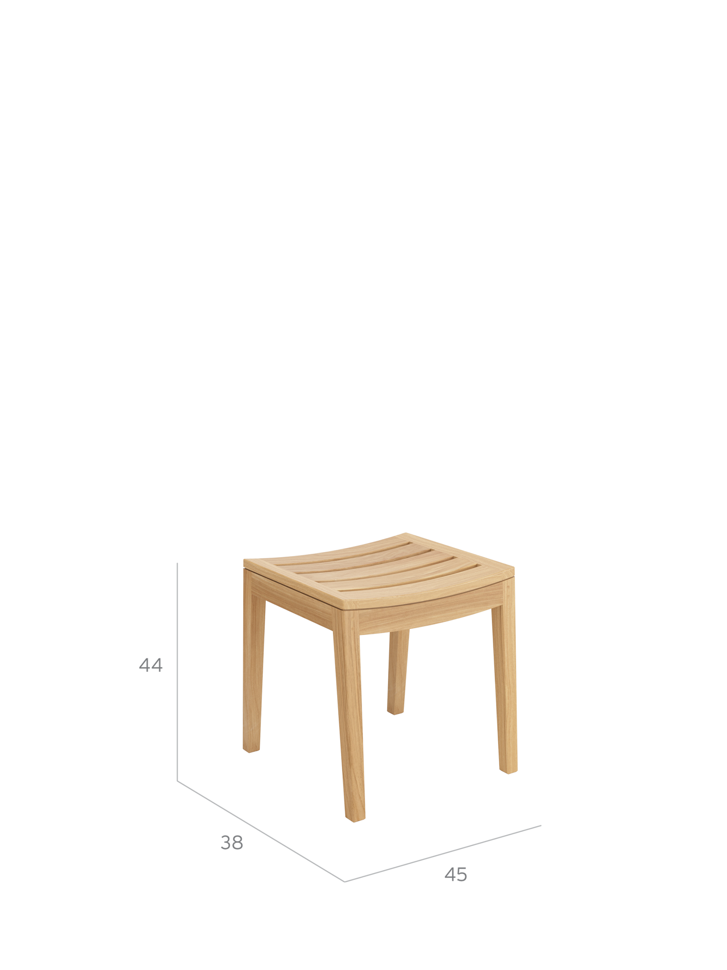 Mit seiner ergonomisch geformten Sitzfläche aus Teak empfiehlt sich der Hocker als unkomplizierter Sitzplatz und komfortable Ablage für die Beine zugleich.