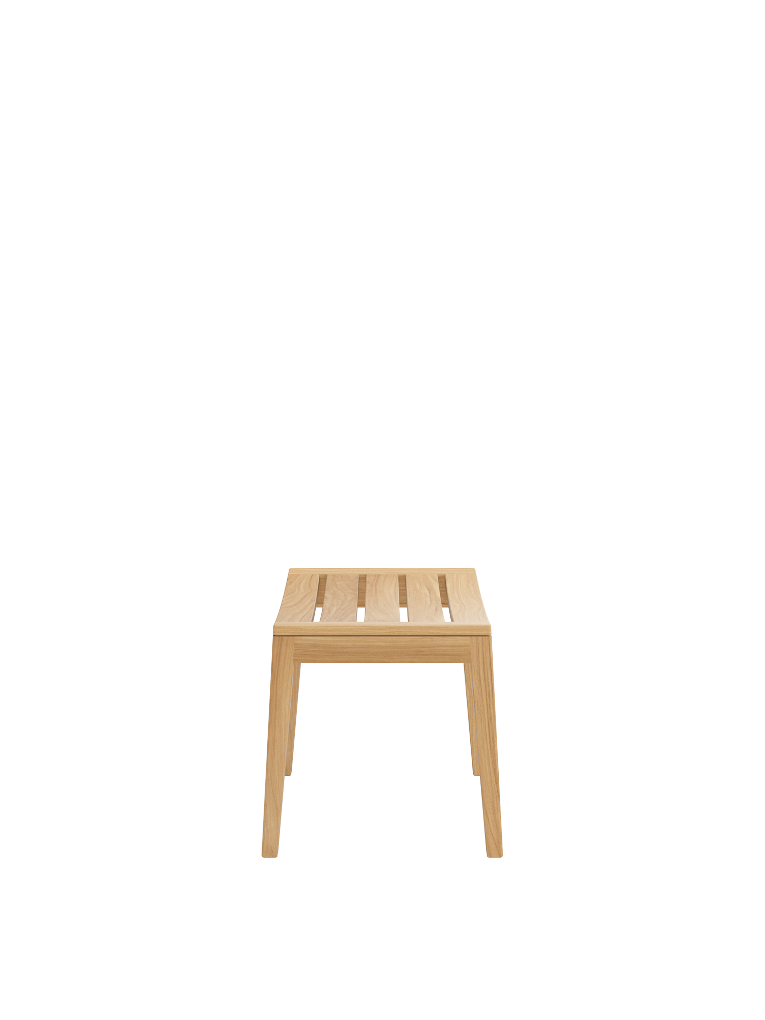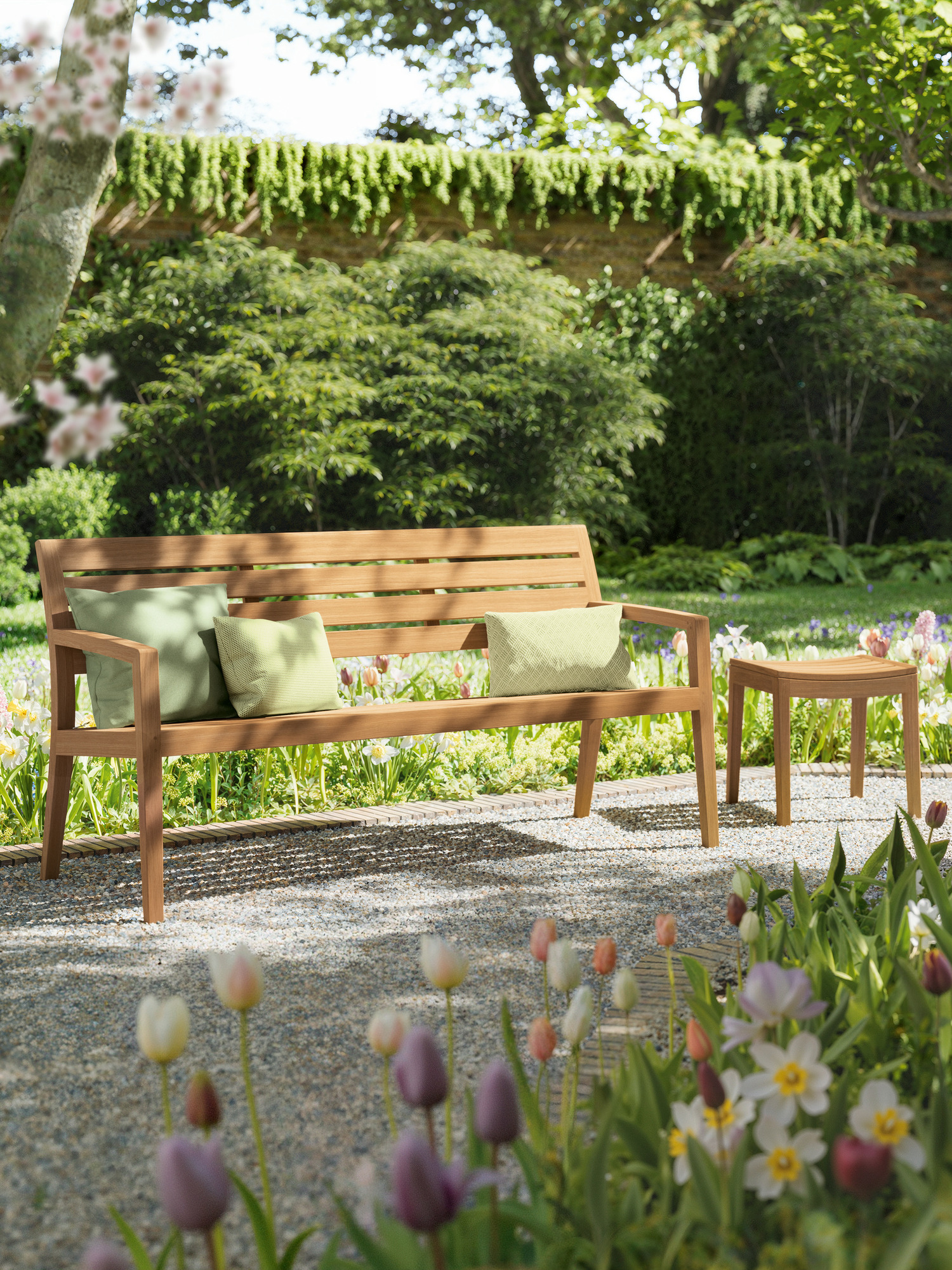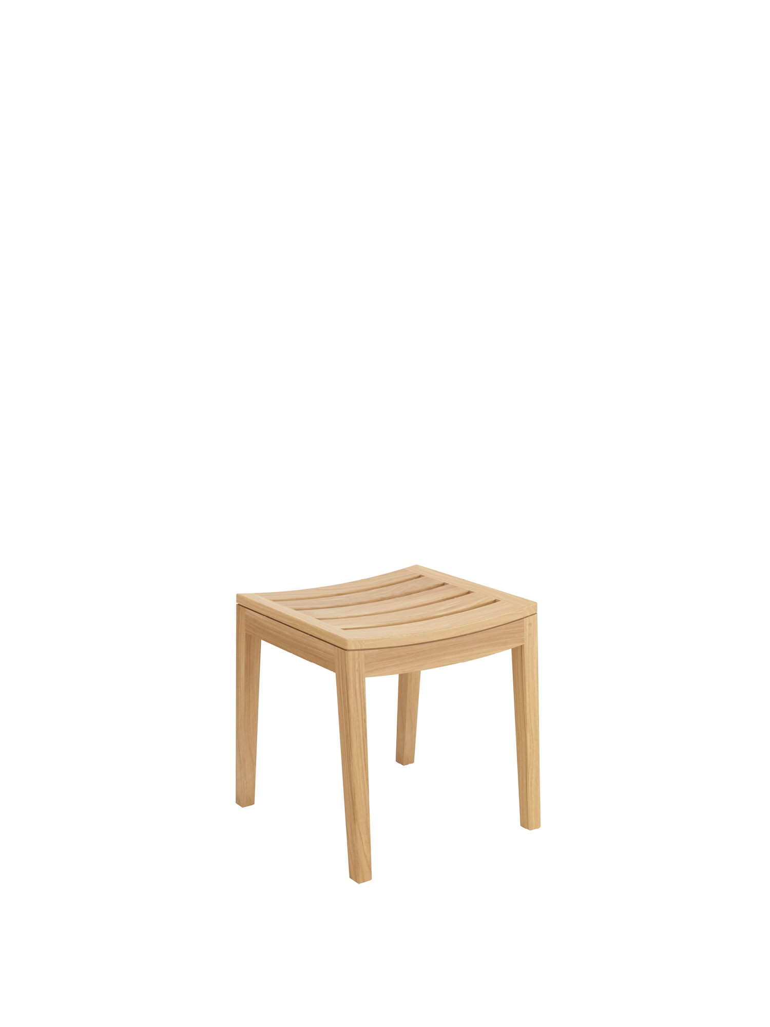 Mit seiner ergonomisch geformten Sitzfläche aus Teak empfiehlt sich der Hocker als unkomplizierter Sitzplatz und komfortable Ablage für die Beine zugleich.