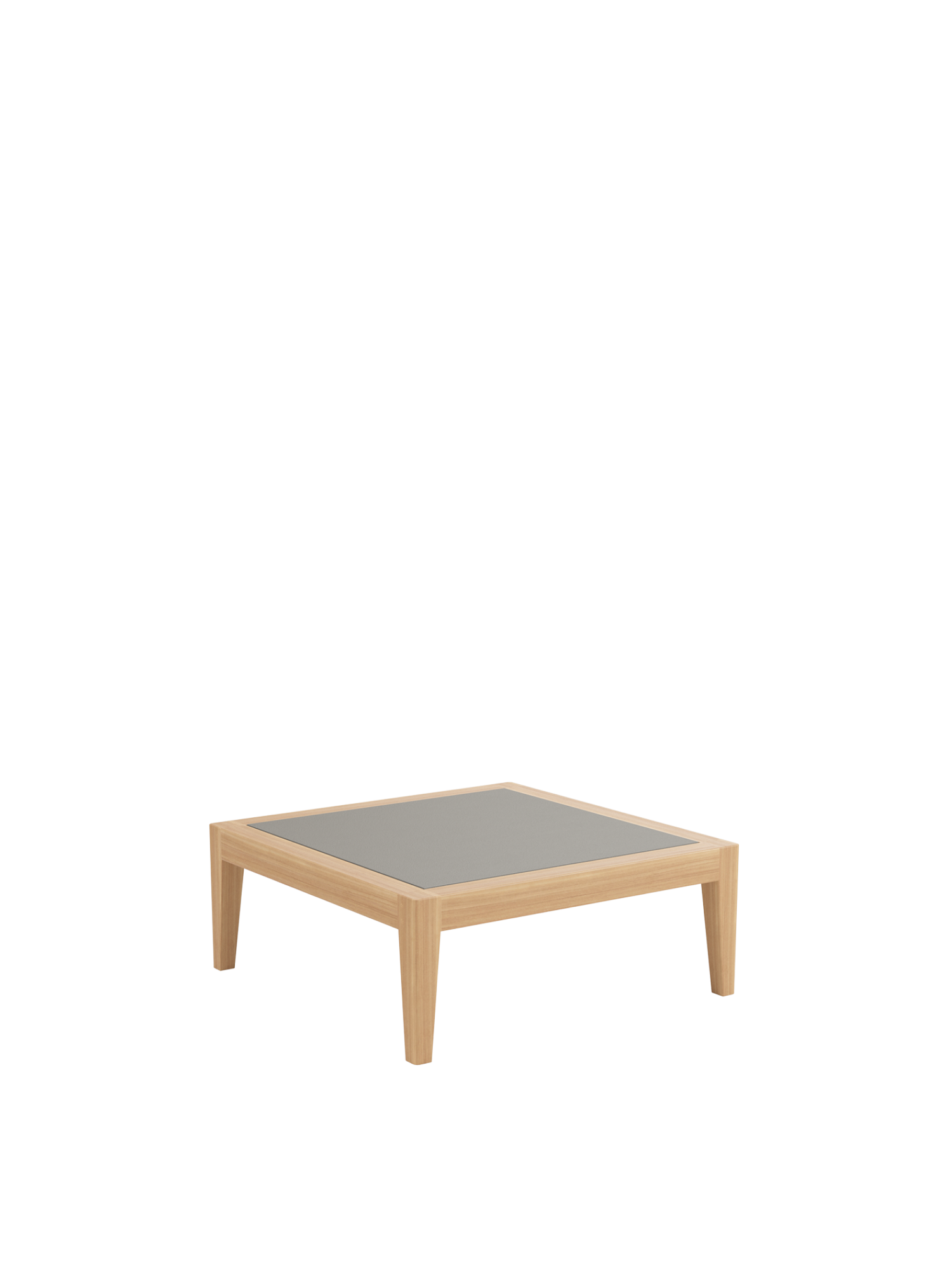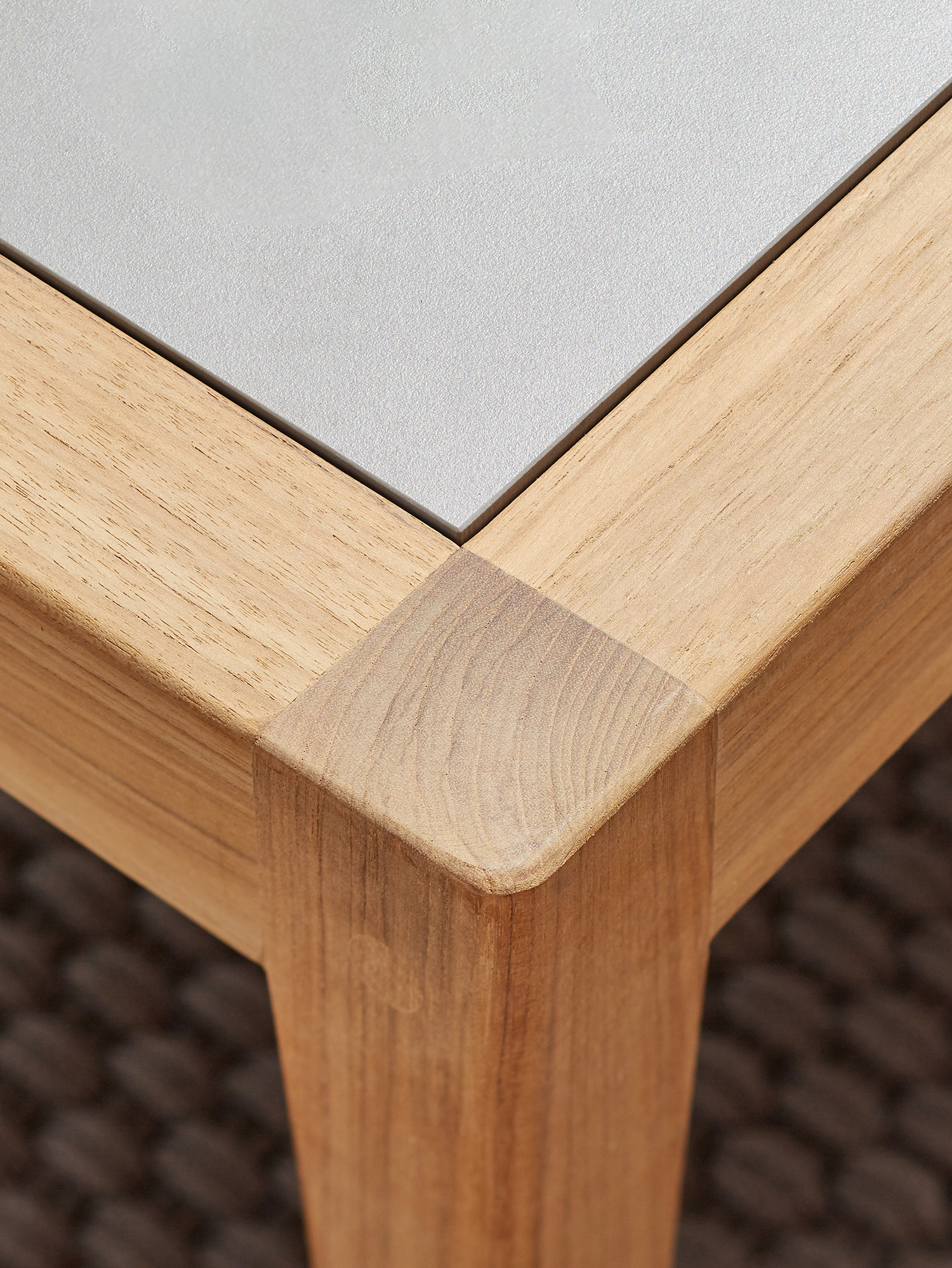 Der passende, niedrige Couchtisch trägt eine Platte aus hochwertiger, wetterfester Keramik in Steinoptik.