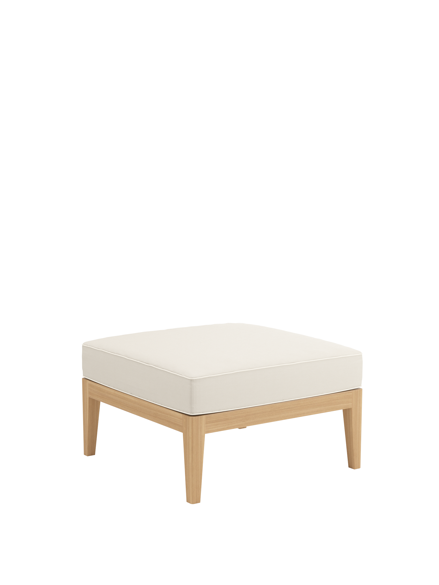 Der passende Hocker verlängert die großzügigen Elemente, entspannt angenehm die Beine und dient mit aufgelegtem Polster als Sitz.