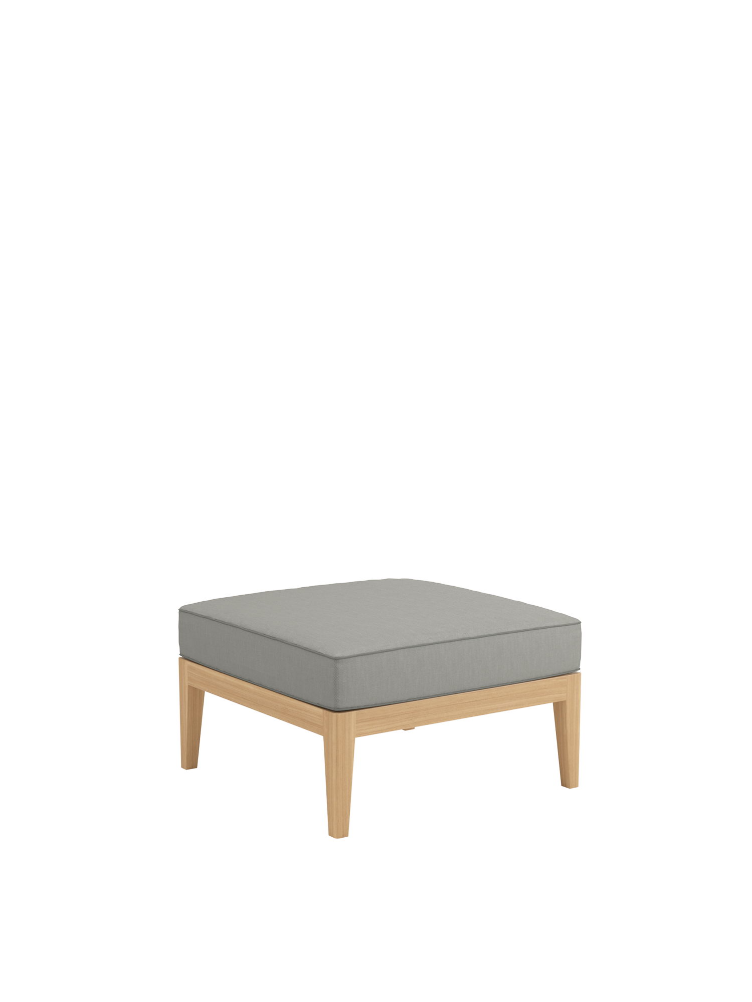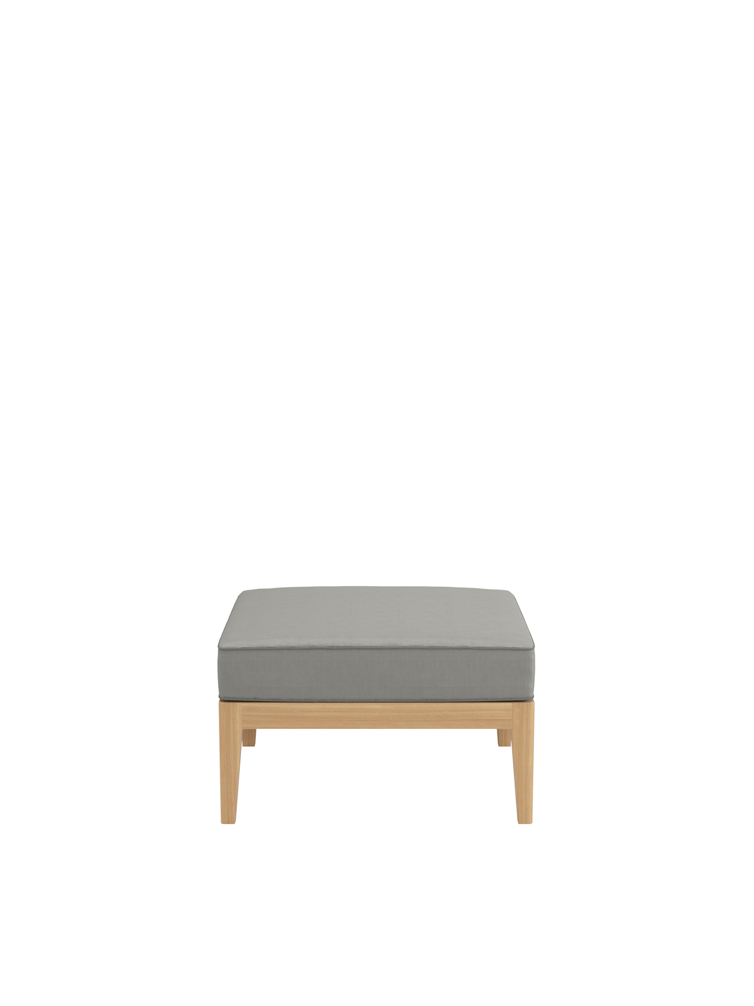 Der passende Hocker verlängert die großzügigen Elemente, entspannt angenehm die Beine und dient mit aufgelegtem Polster als Sitz.