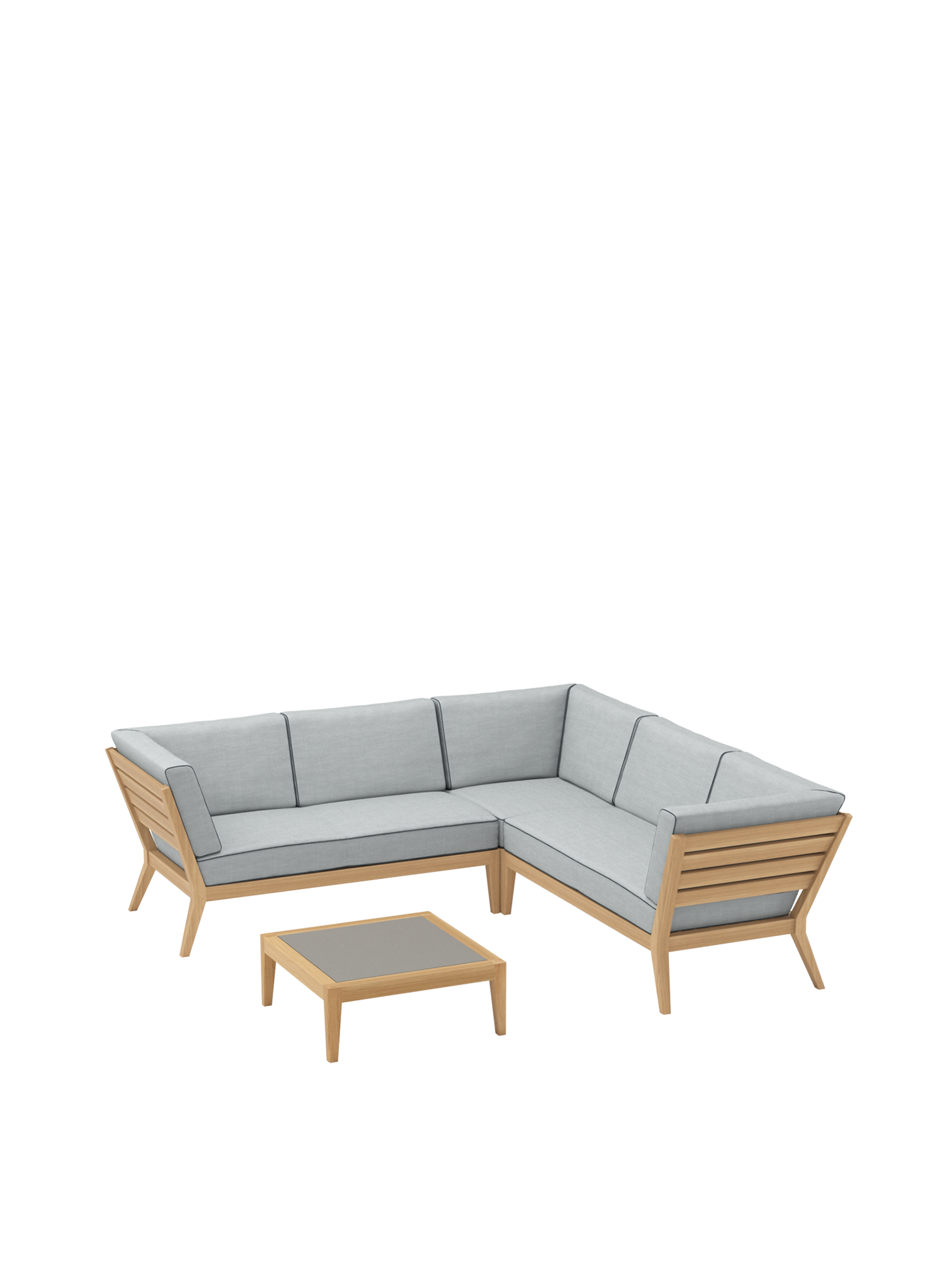 Die beiden Chaiselongues mit Armlehnen auf der rechten bzw. auf der linken Seite nehmen das Eckelement galant in ihre Mitte. Gemeinsam lädt das Trio mit großzügigen Polstern zu behaglichen Ruhepausen ein. Der Couchtisch mit einer Keramikoberfläche fügt sich nahtlos in das stimmige Gesamtbild der Valencia Lounge Kollektion ein.