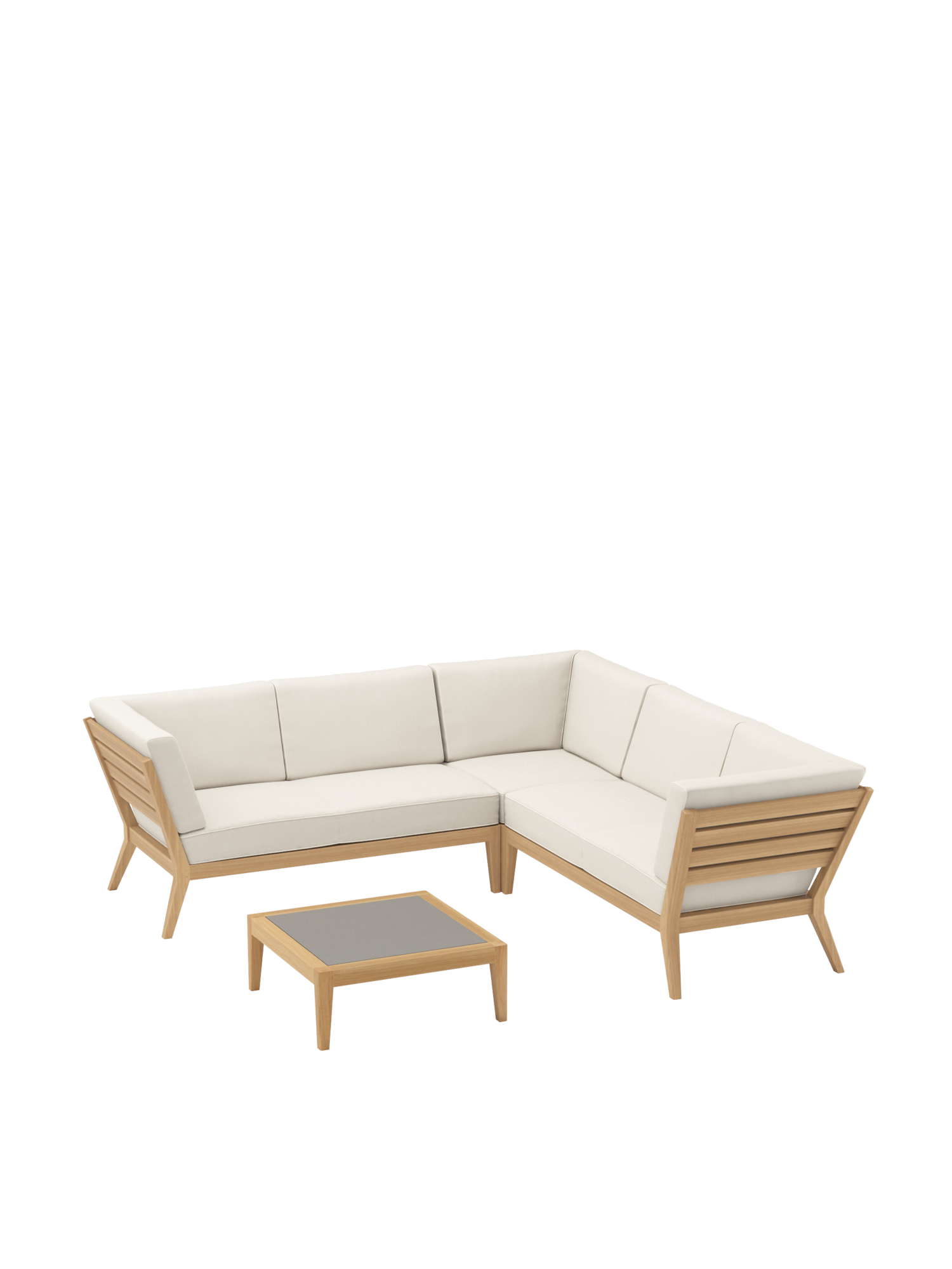 Die beiden Chaiselongues mit Armlehnen auf der rechten bzw. auf der linken Seite nehmen das Eckelement galant in ihre Mitte. Gemeinsam lädt das Trio mit großzügigen Polstern zu behaglichen Ruhepausen ein. Der Couchtisch mit einer Keramikoberfläche fügt sich nahtlos in das stimmige Gesamtbild der Valencia Lounge Kollektion ein.